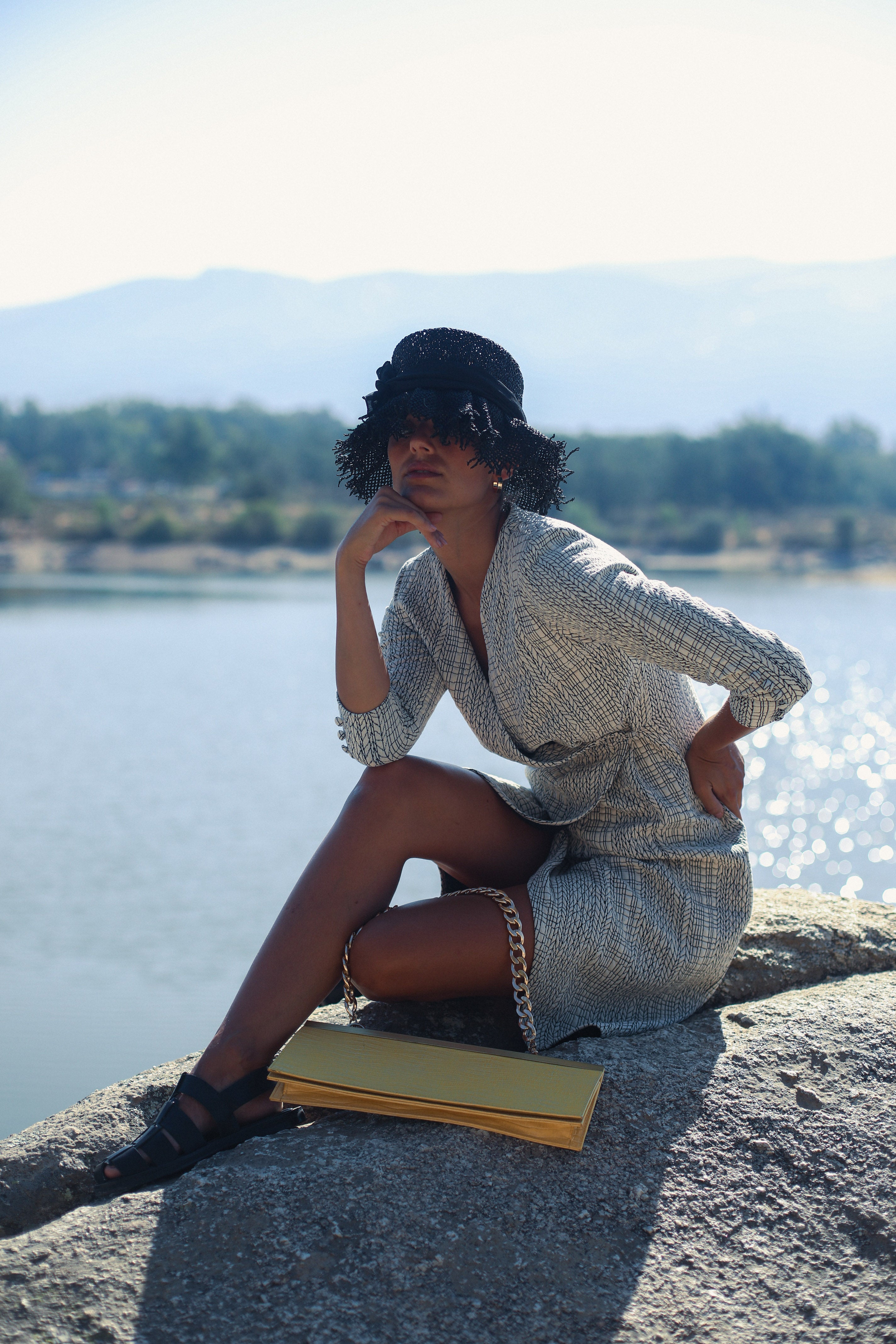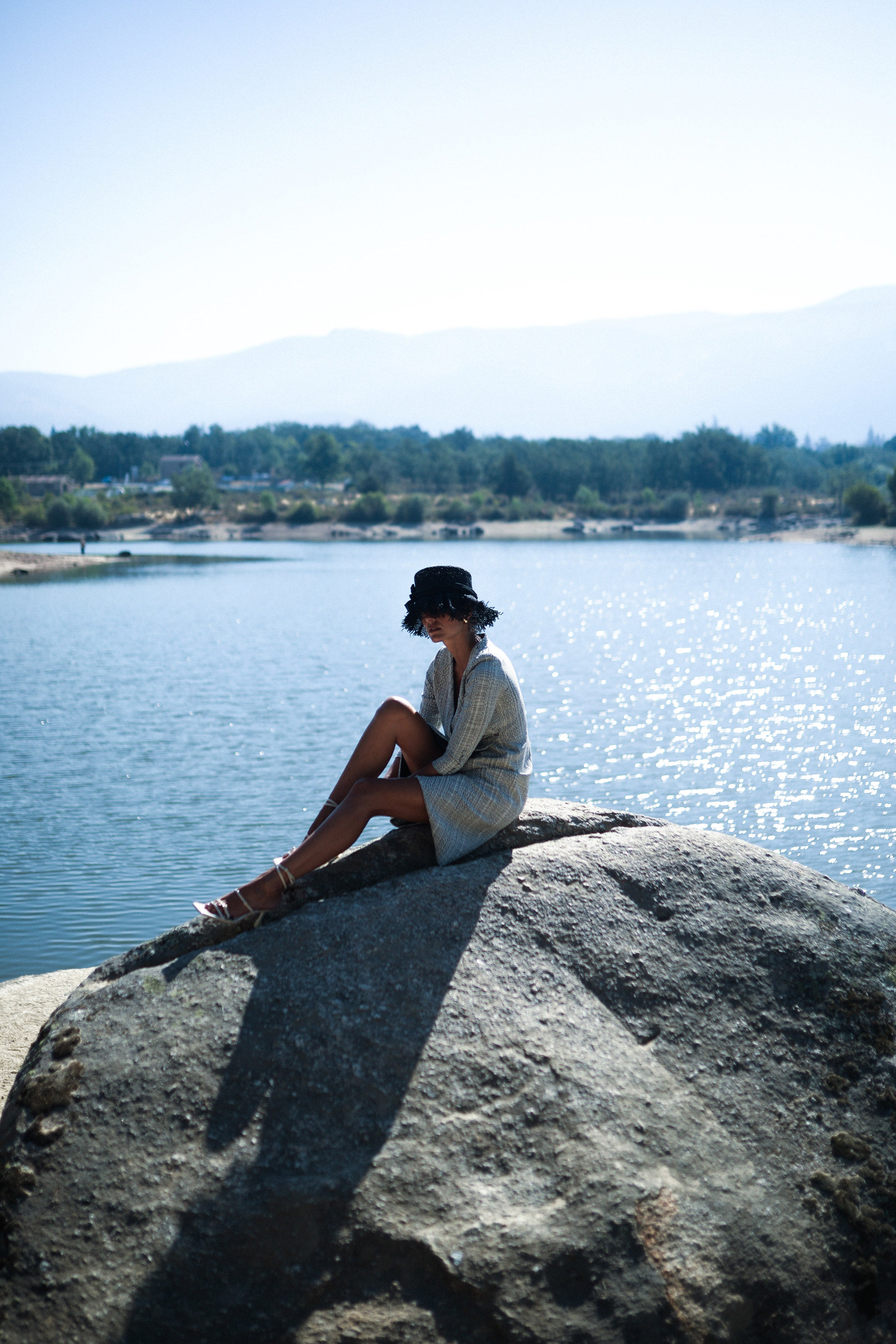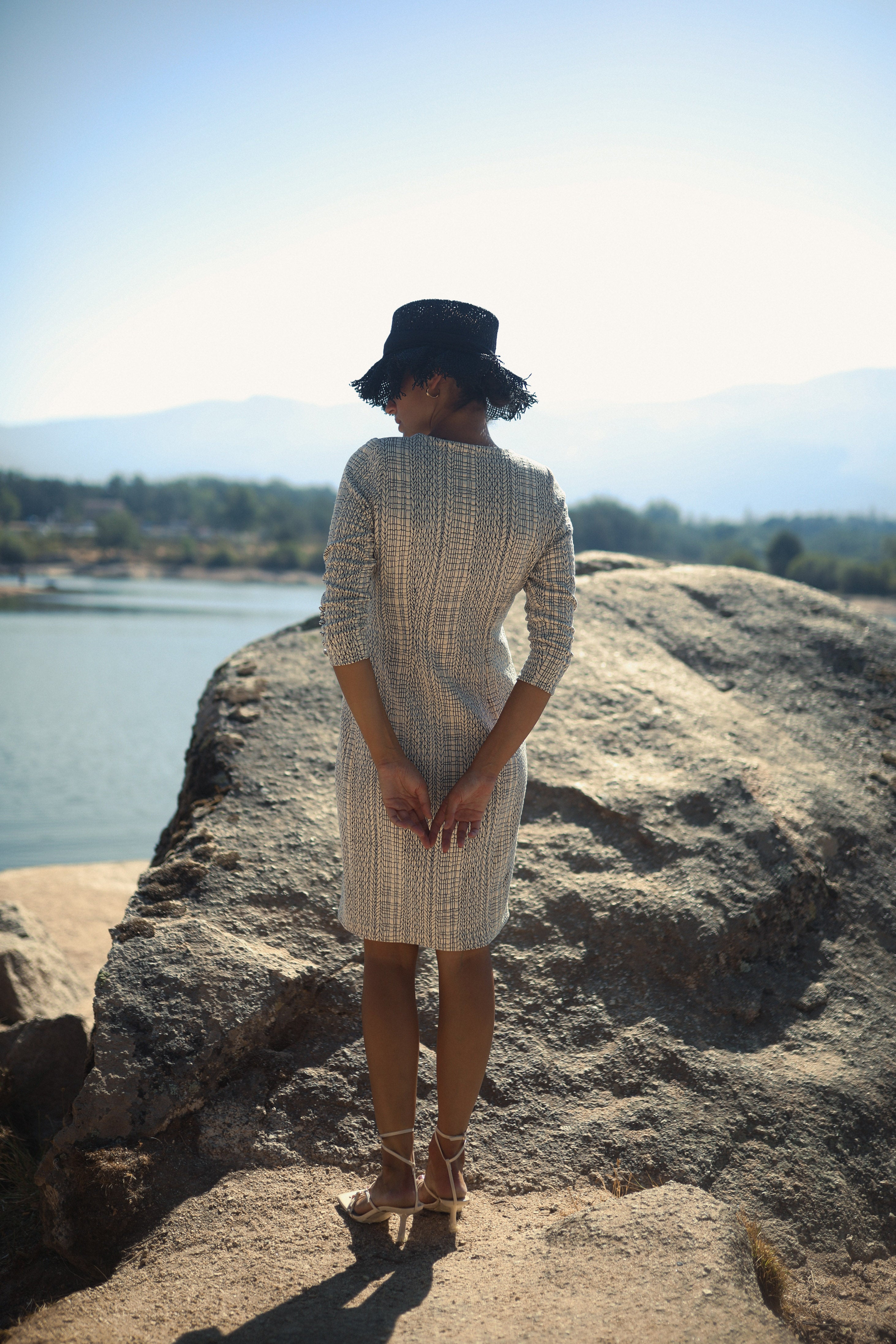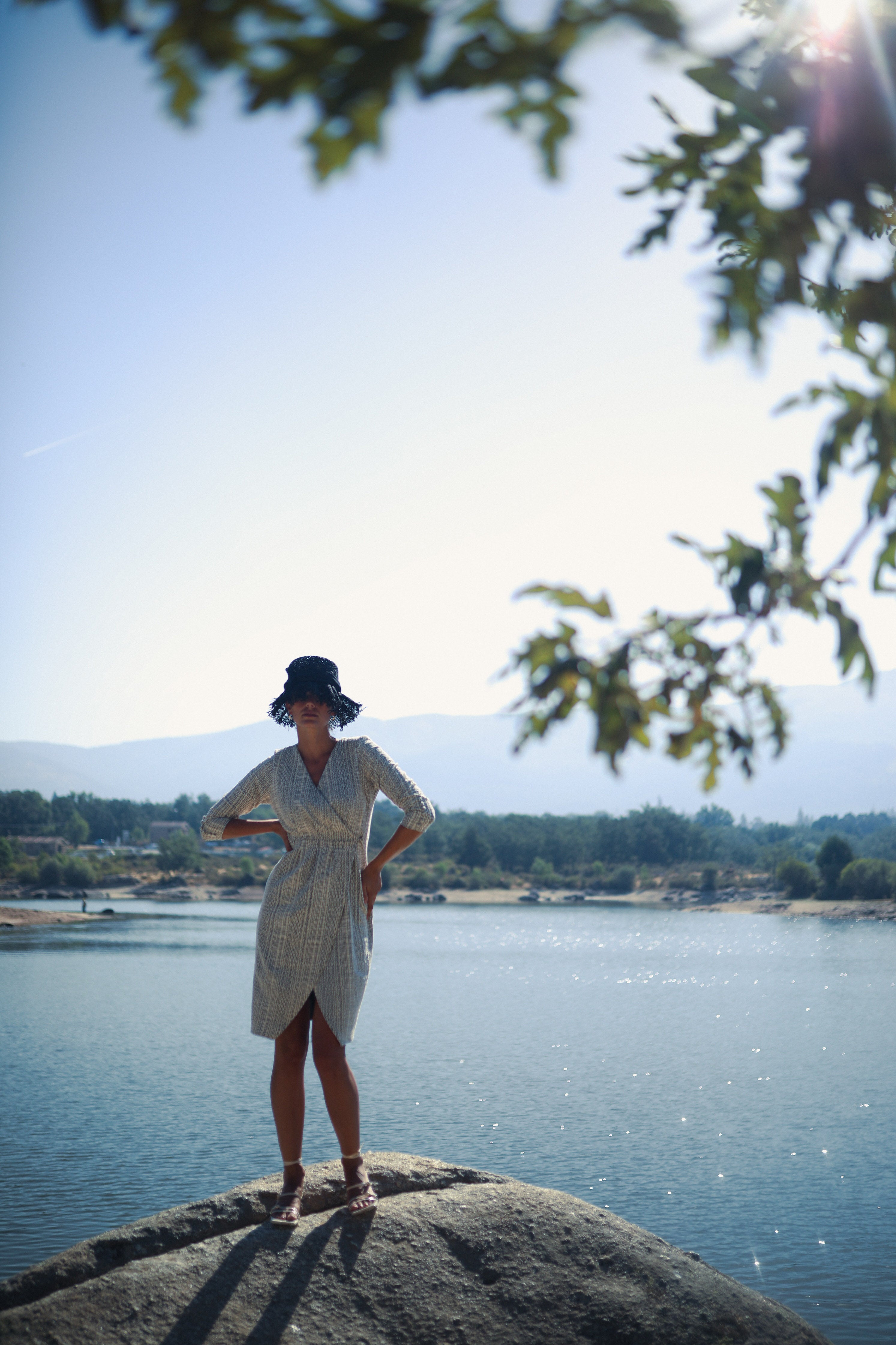 Vestido de manga larga con escote pico y cintura fruncida en punto crudo.