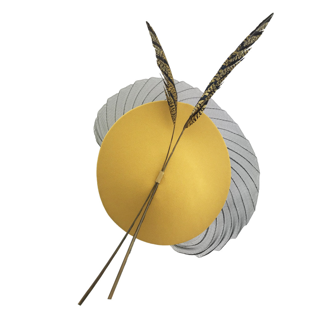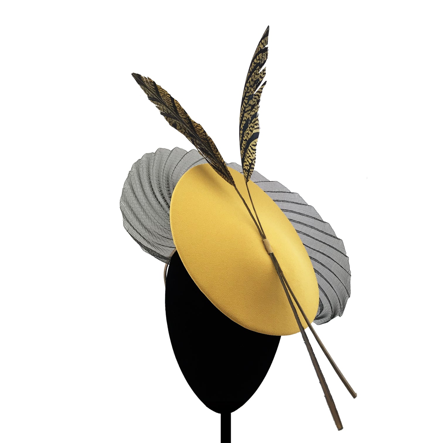 Dulcinea de crepe mostaza con crin plisado negro al ala y faisanes flecha al tono.