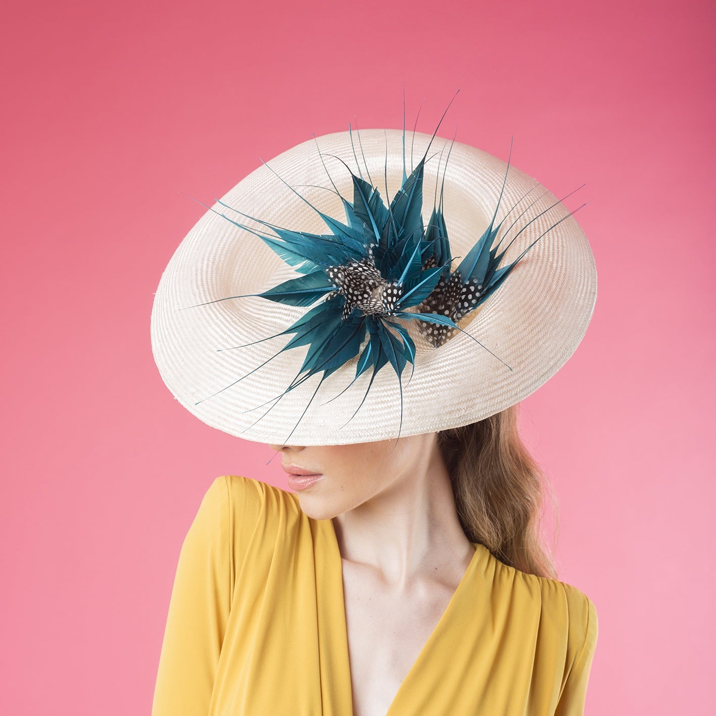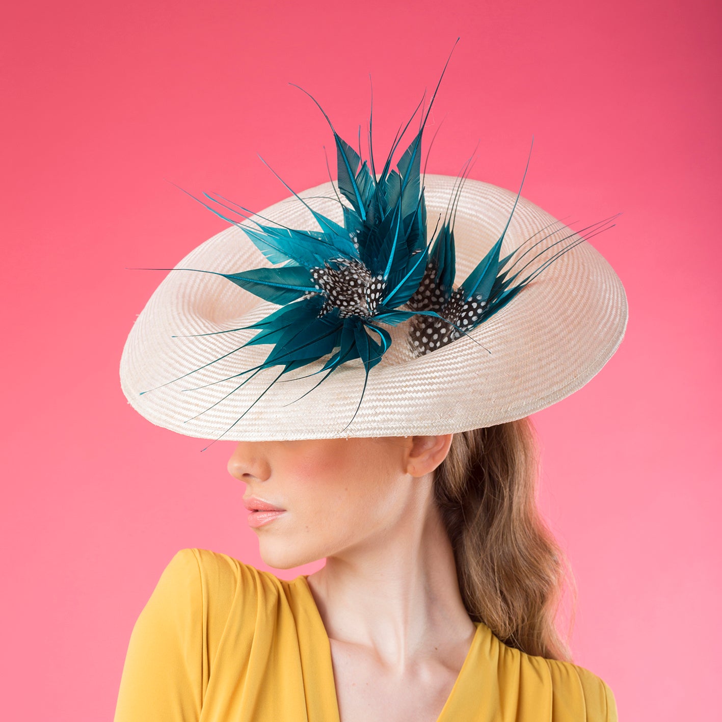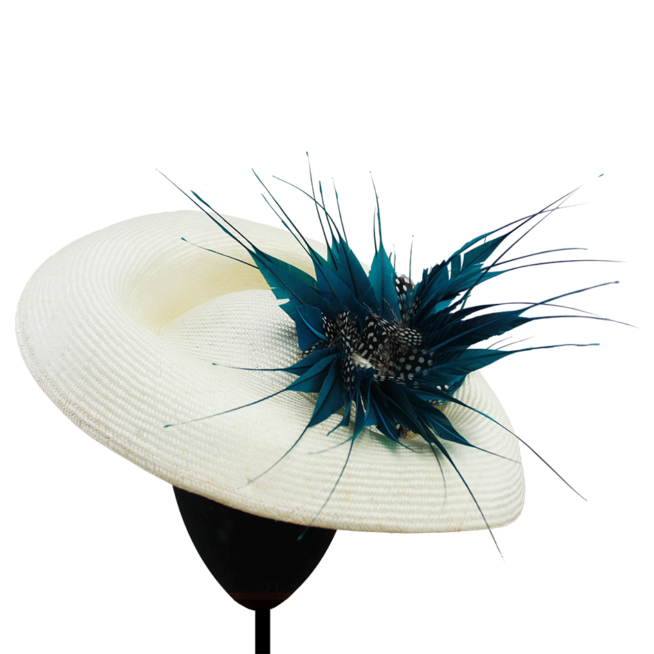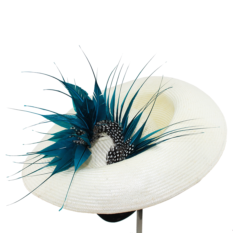 Dulcinea in Parasisal natural With Japanese turquoise duster and black and white spotted feather