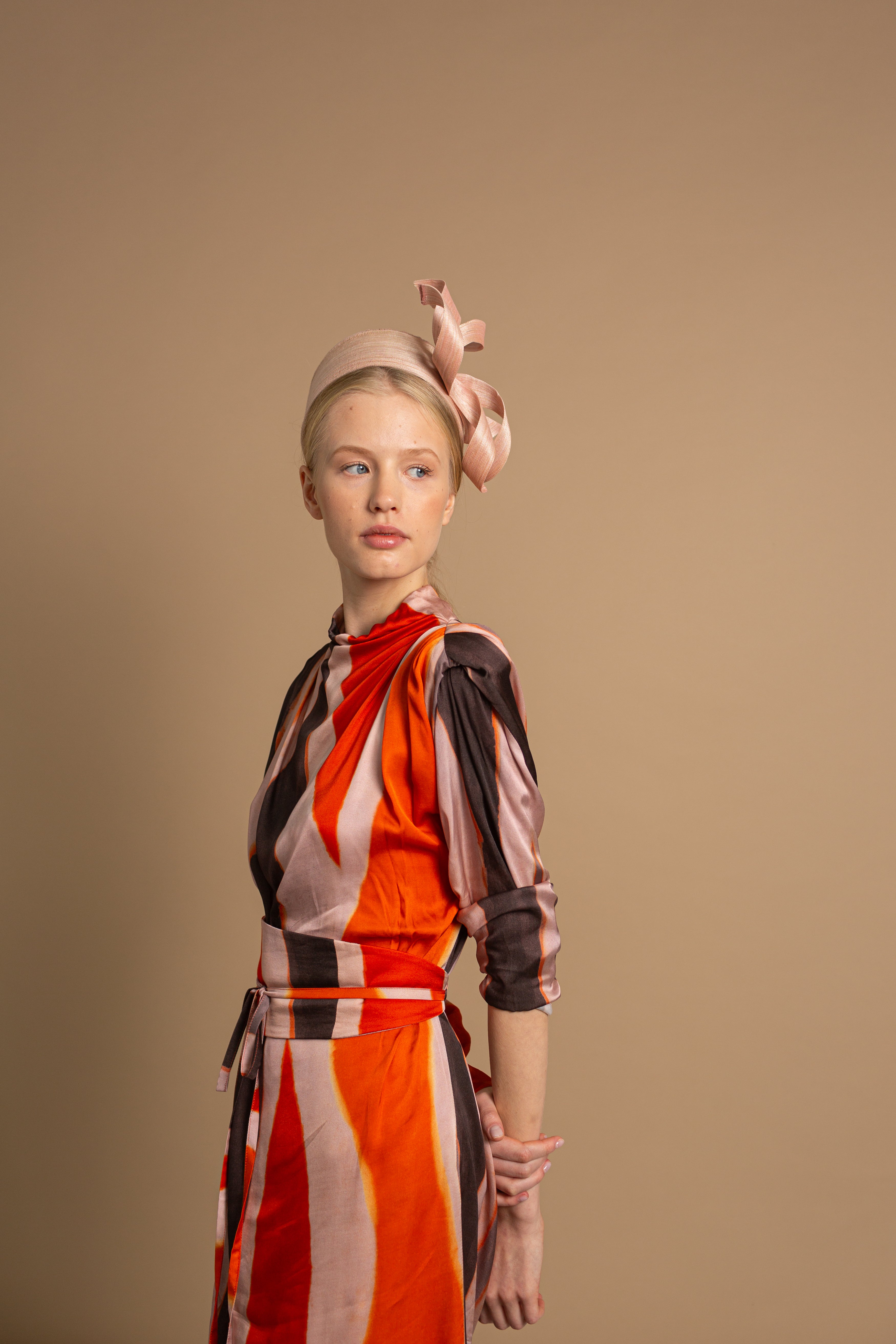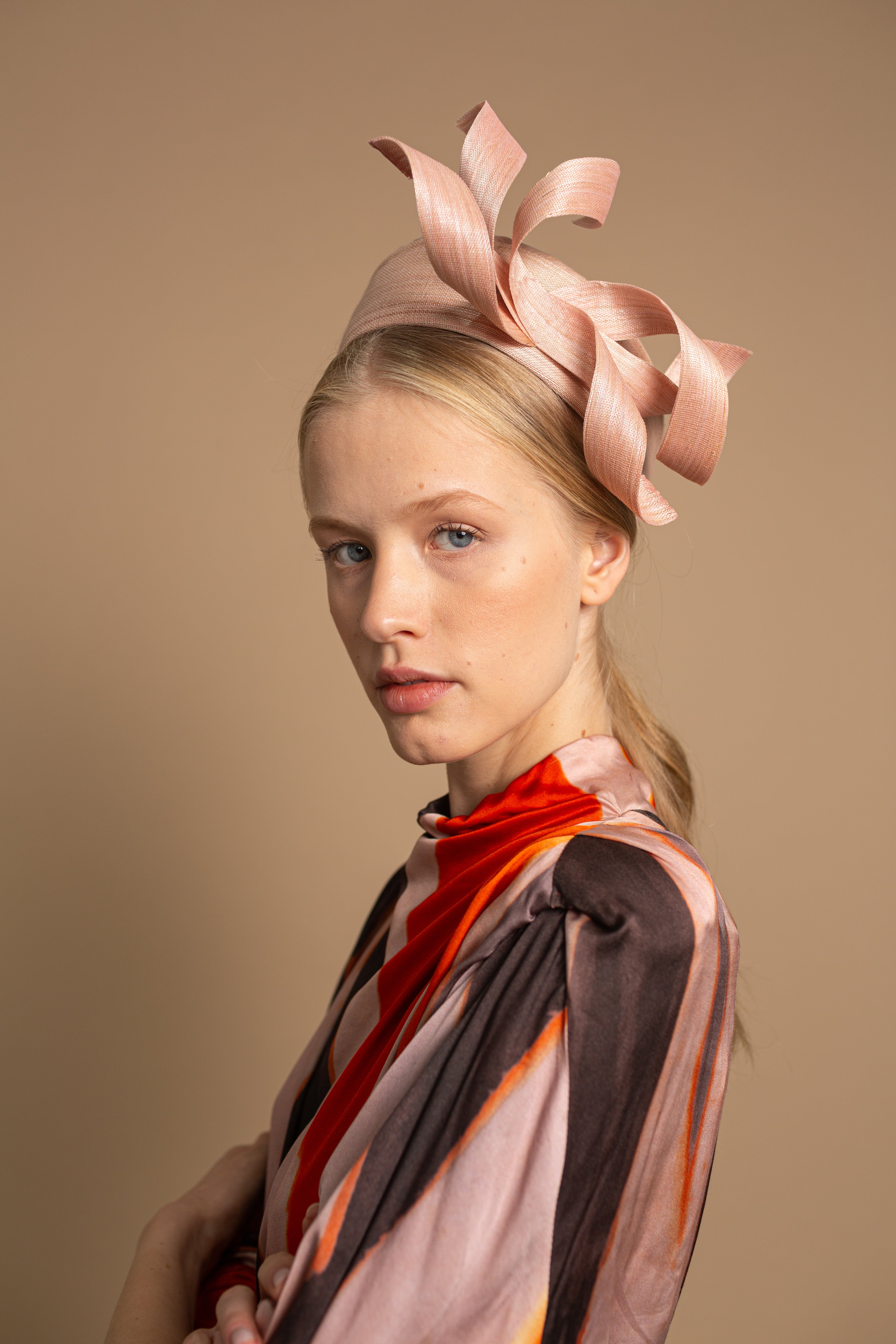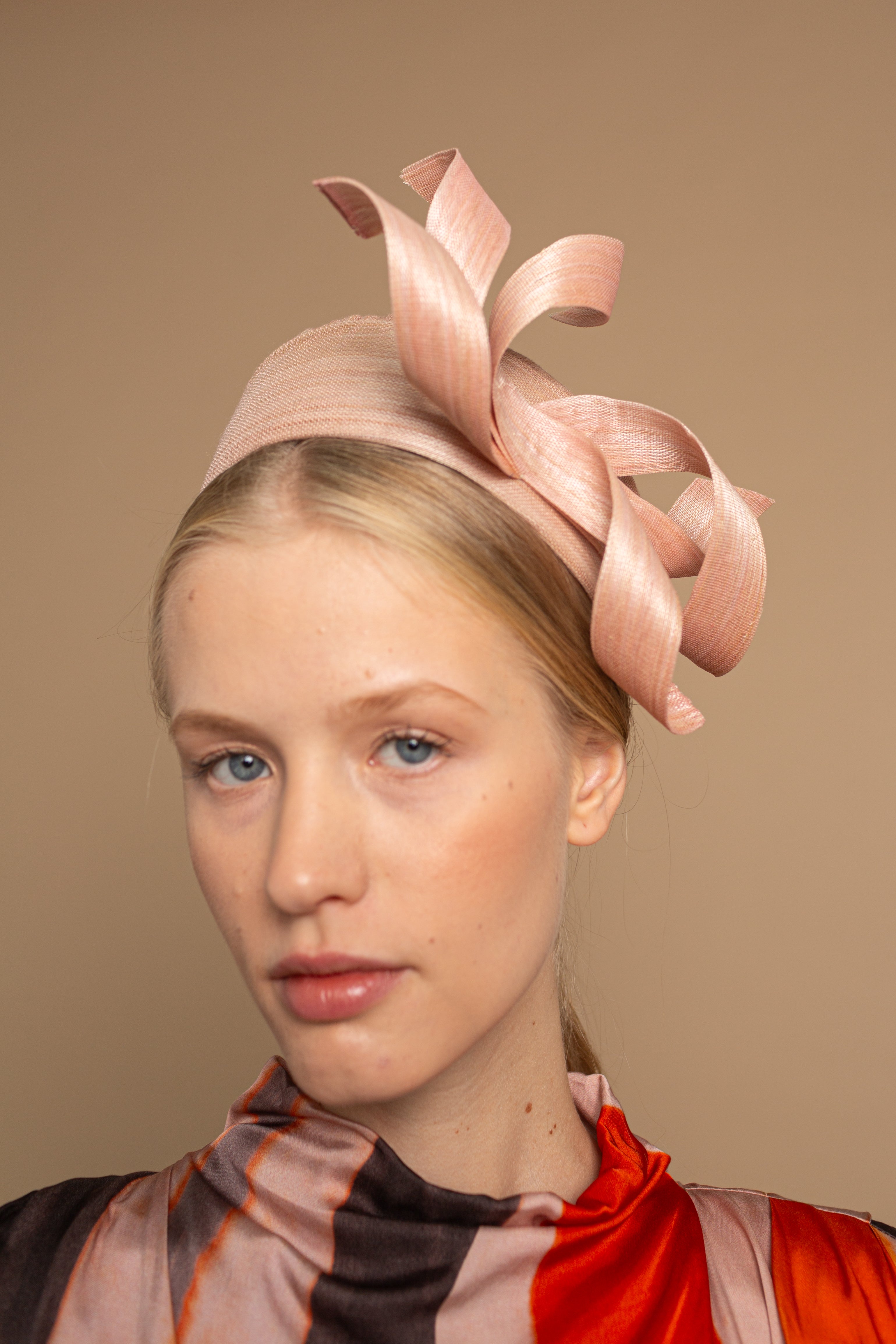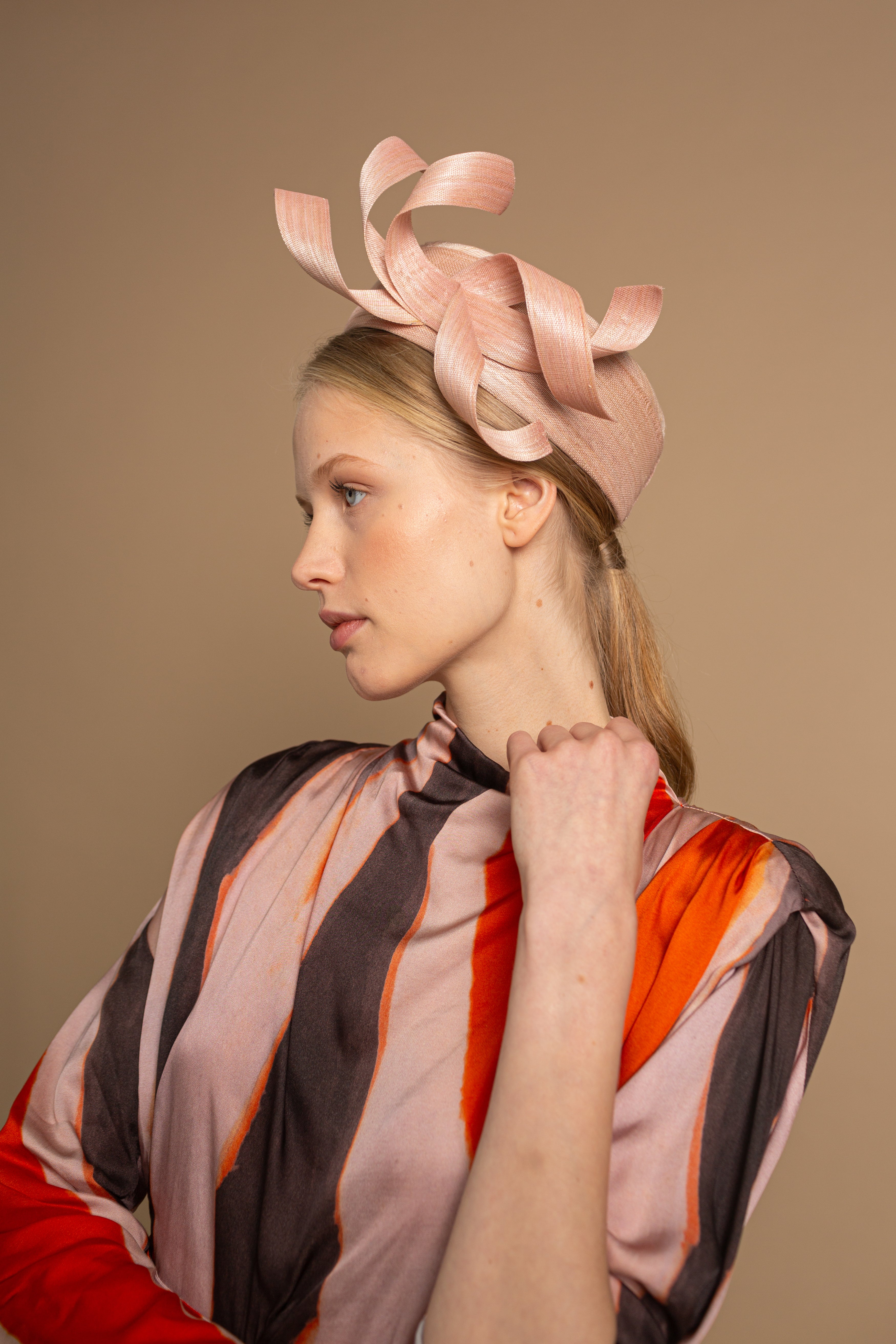 Casquete tipo pilbox forrado de rafia de algodón rosa claro con ondulaciones al tono