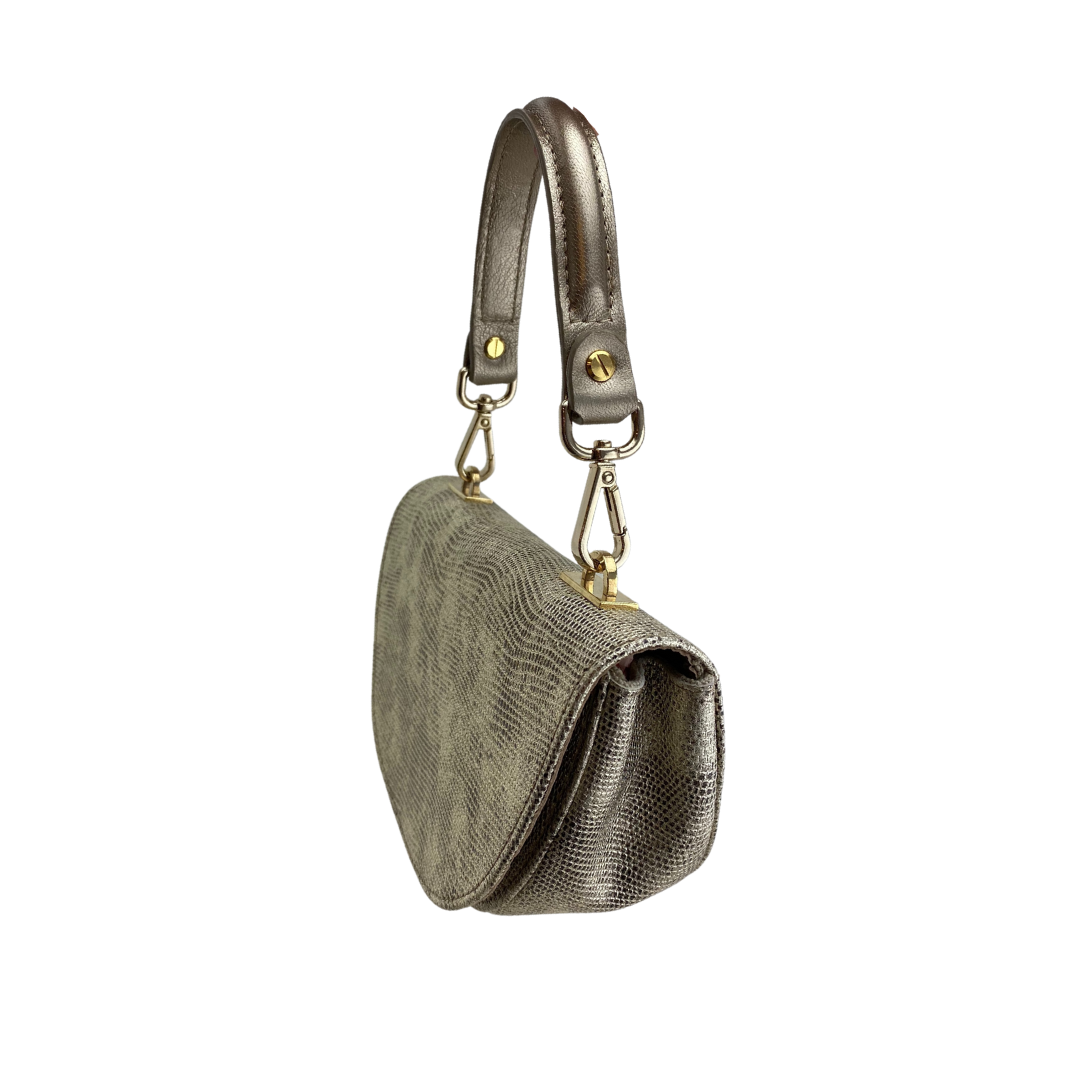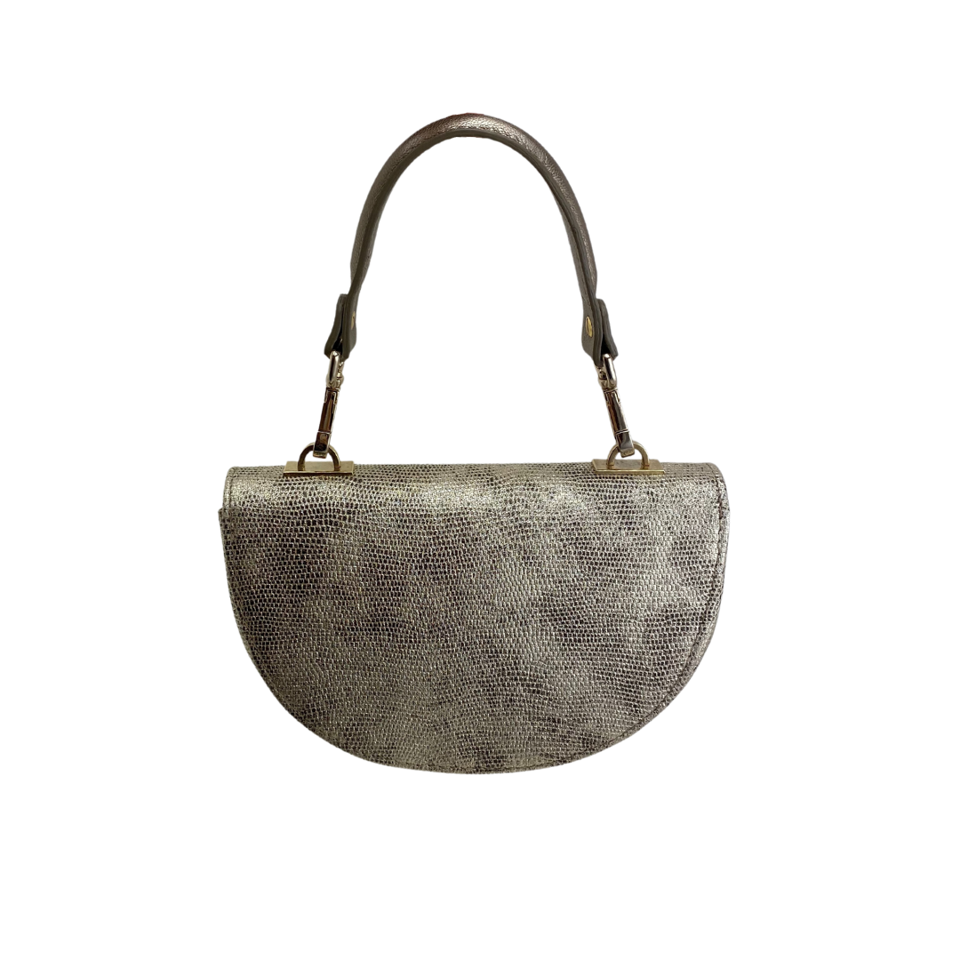 Bolso semicuircular en piel dorada con brillo, con efecto serpiente y asa al tono.
