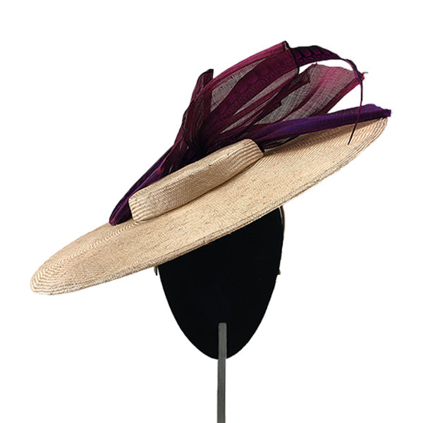 Pamela de parasisal tostado con abanicos de rafia buganvilla y morado y pluma de faisan