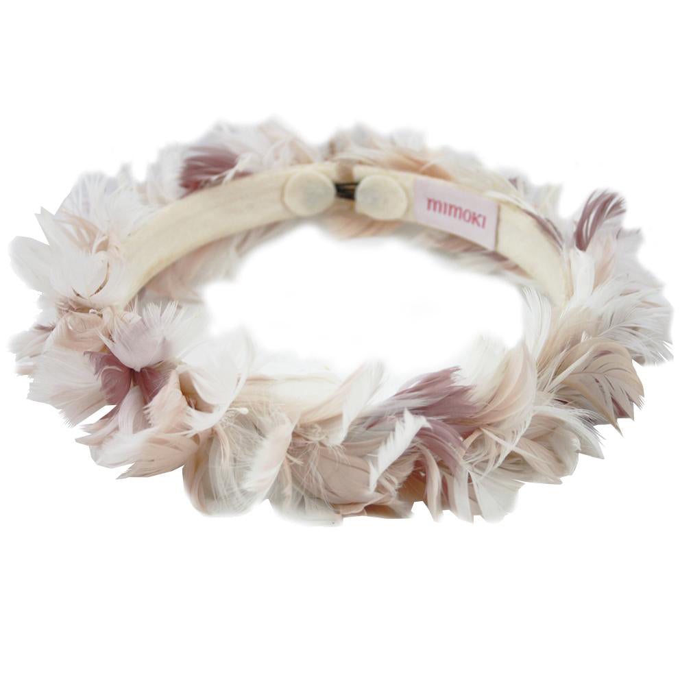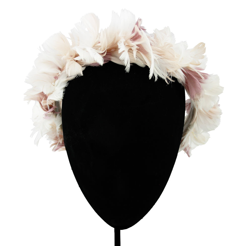 Corona de hortensias de pluma en tonos nude, blanco y malva empolvado.