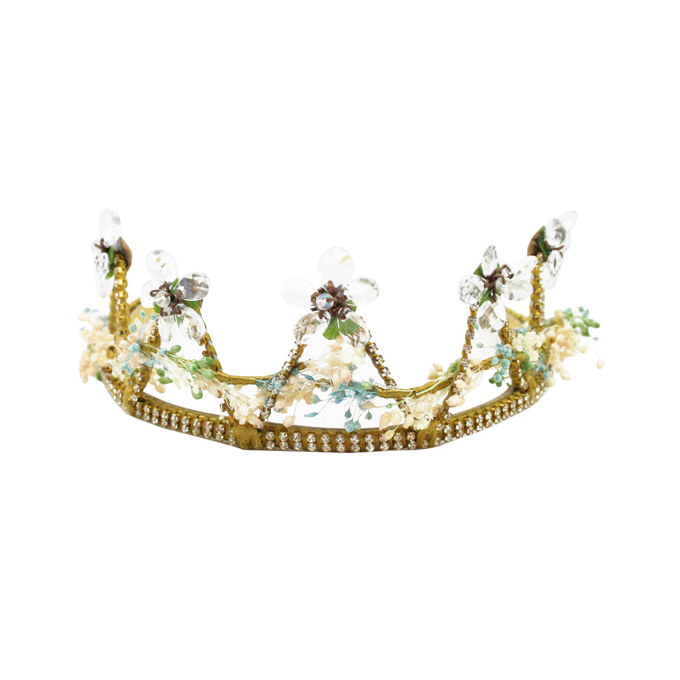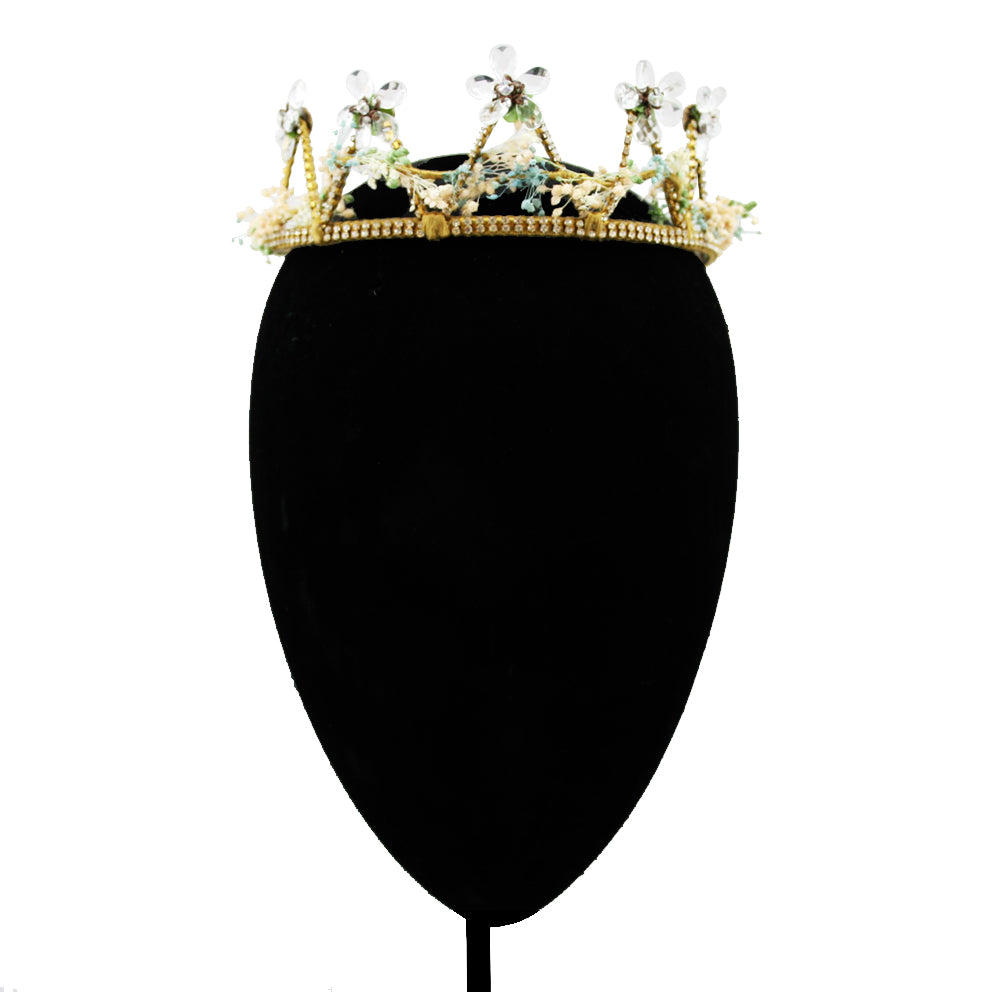 Corona de brillantes con flores de cristal y ramas de paniculatas preservadas en tonos pasteles.