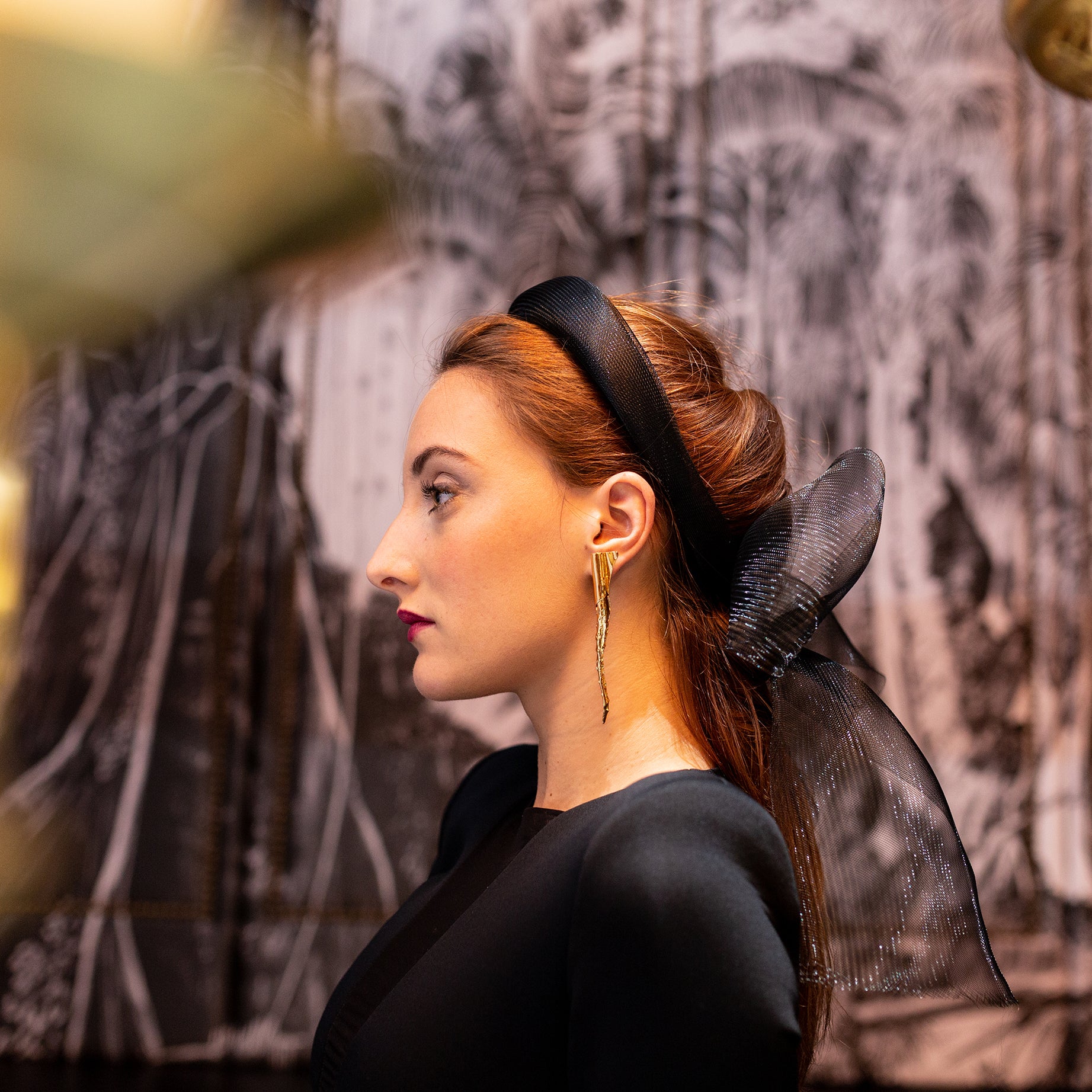 Diadema ancha forrada de crin con lazada trasera.