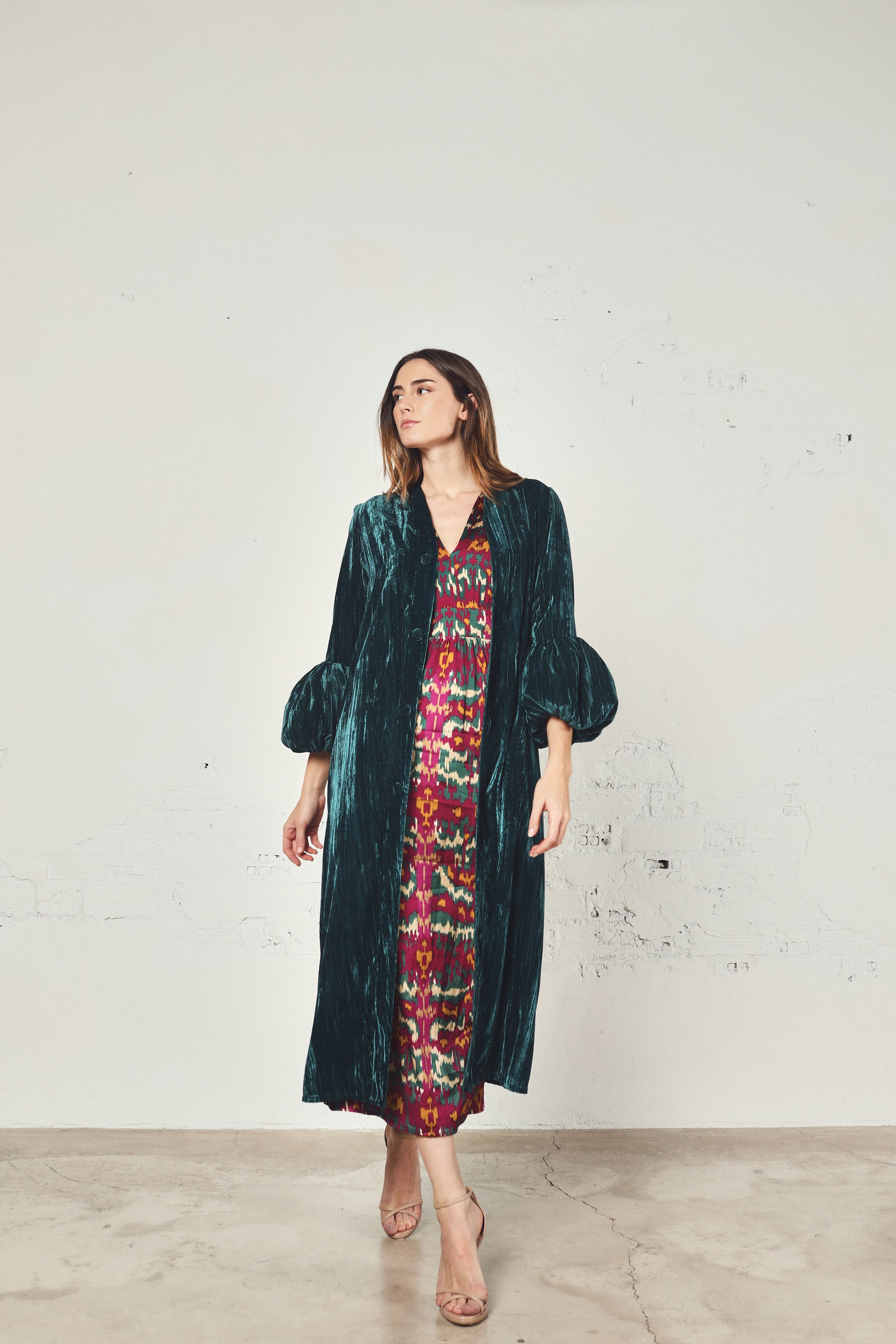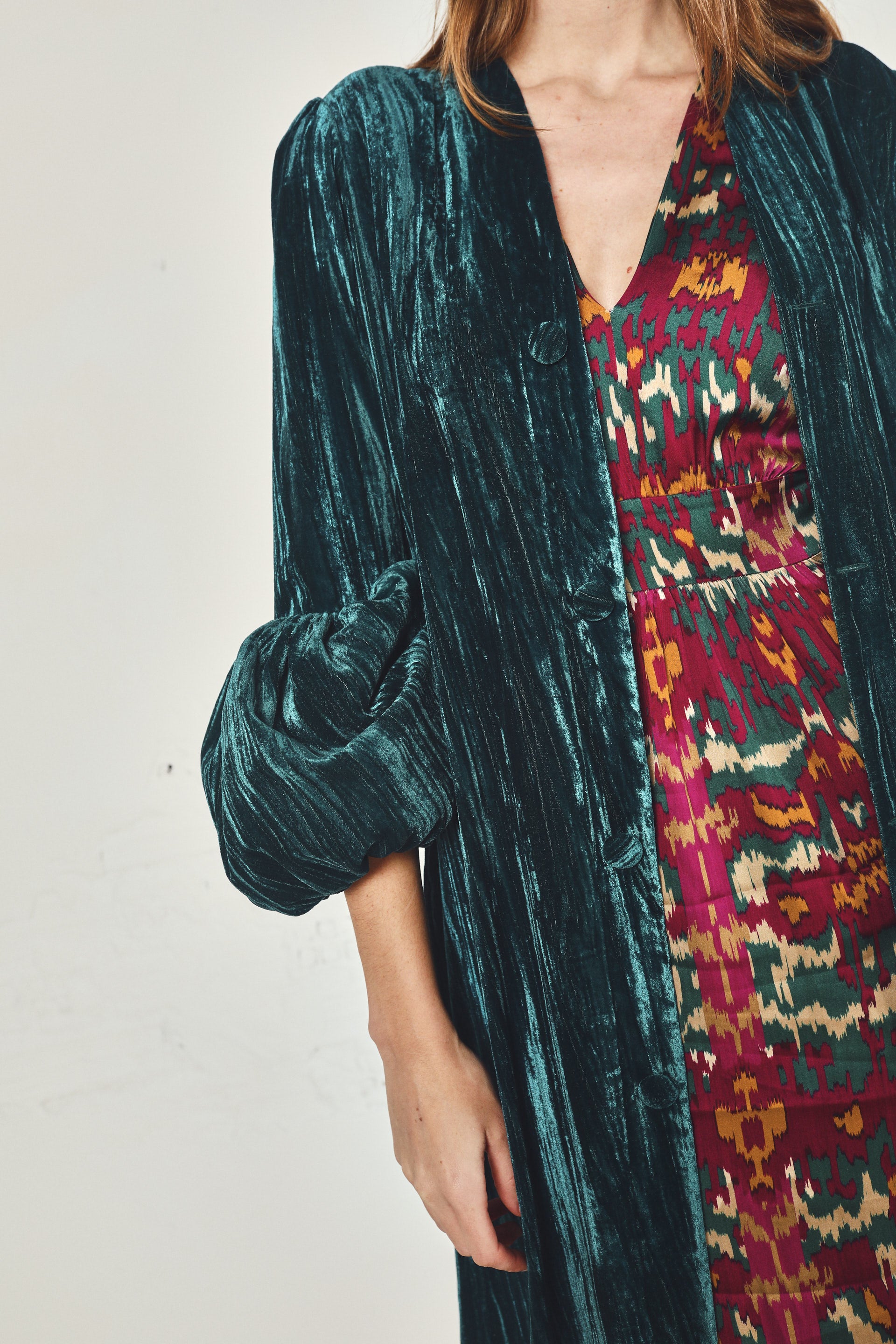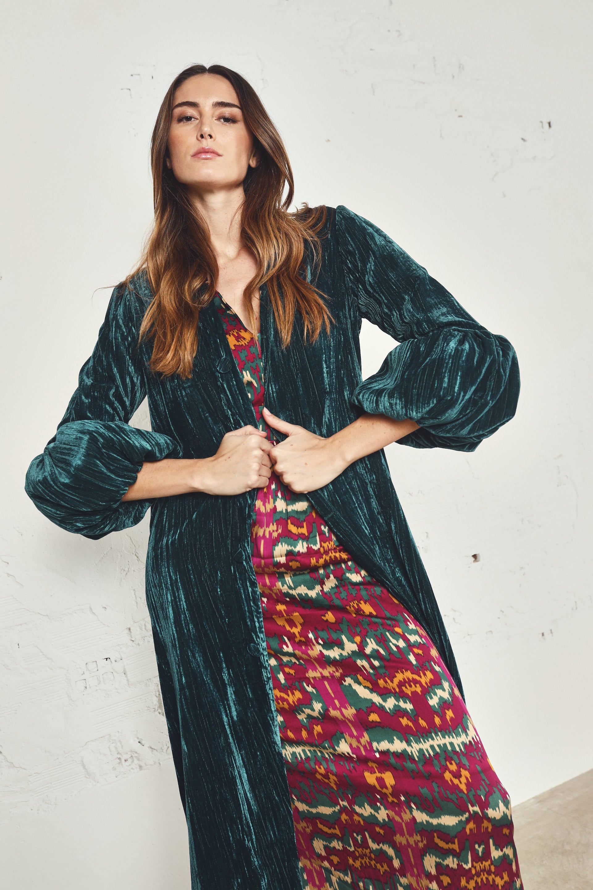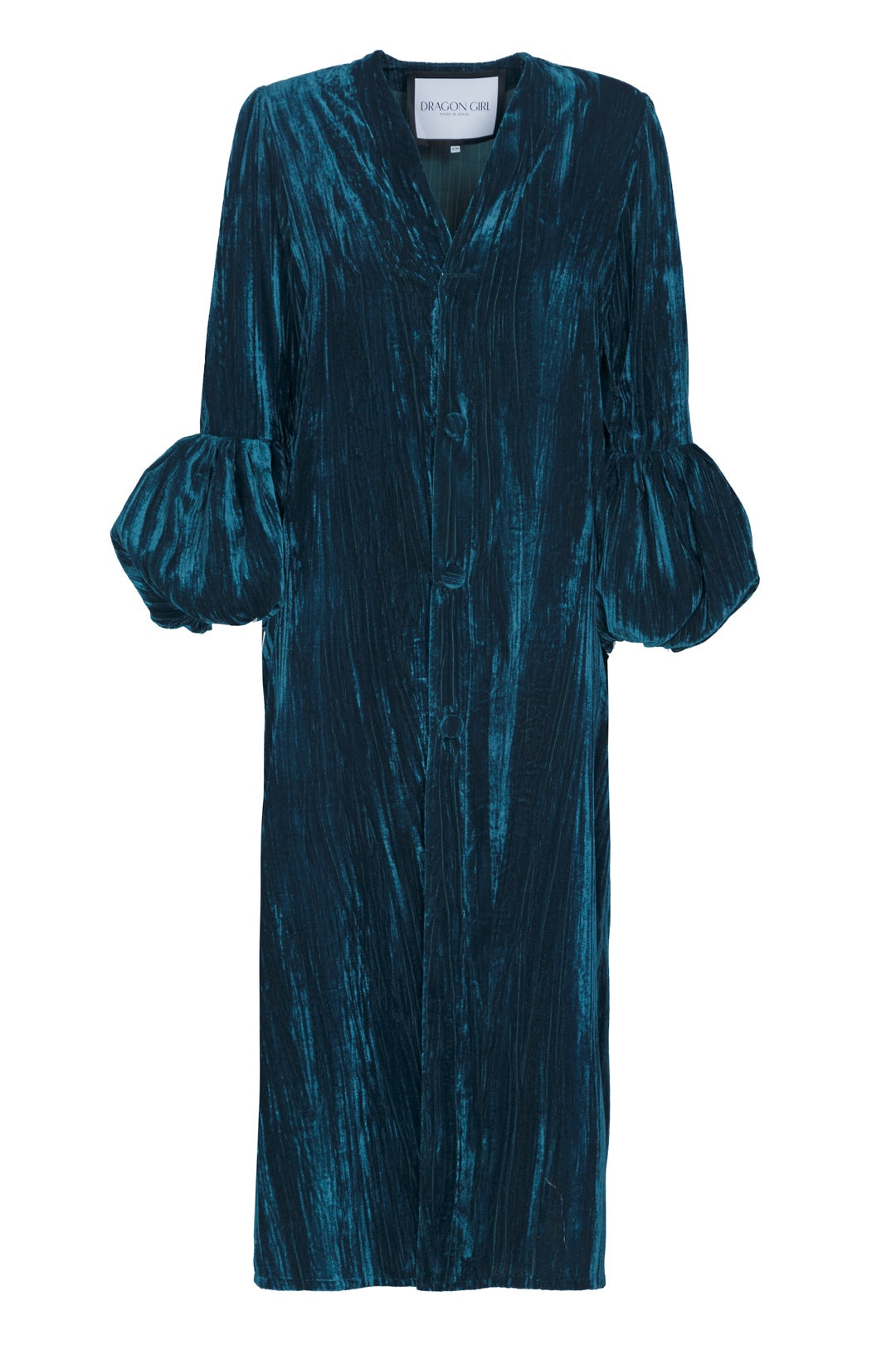 Long coat with V-neckline and long sleeves with puffed cuffs.