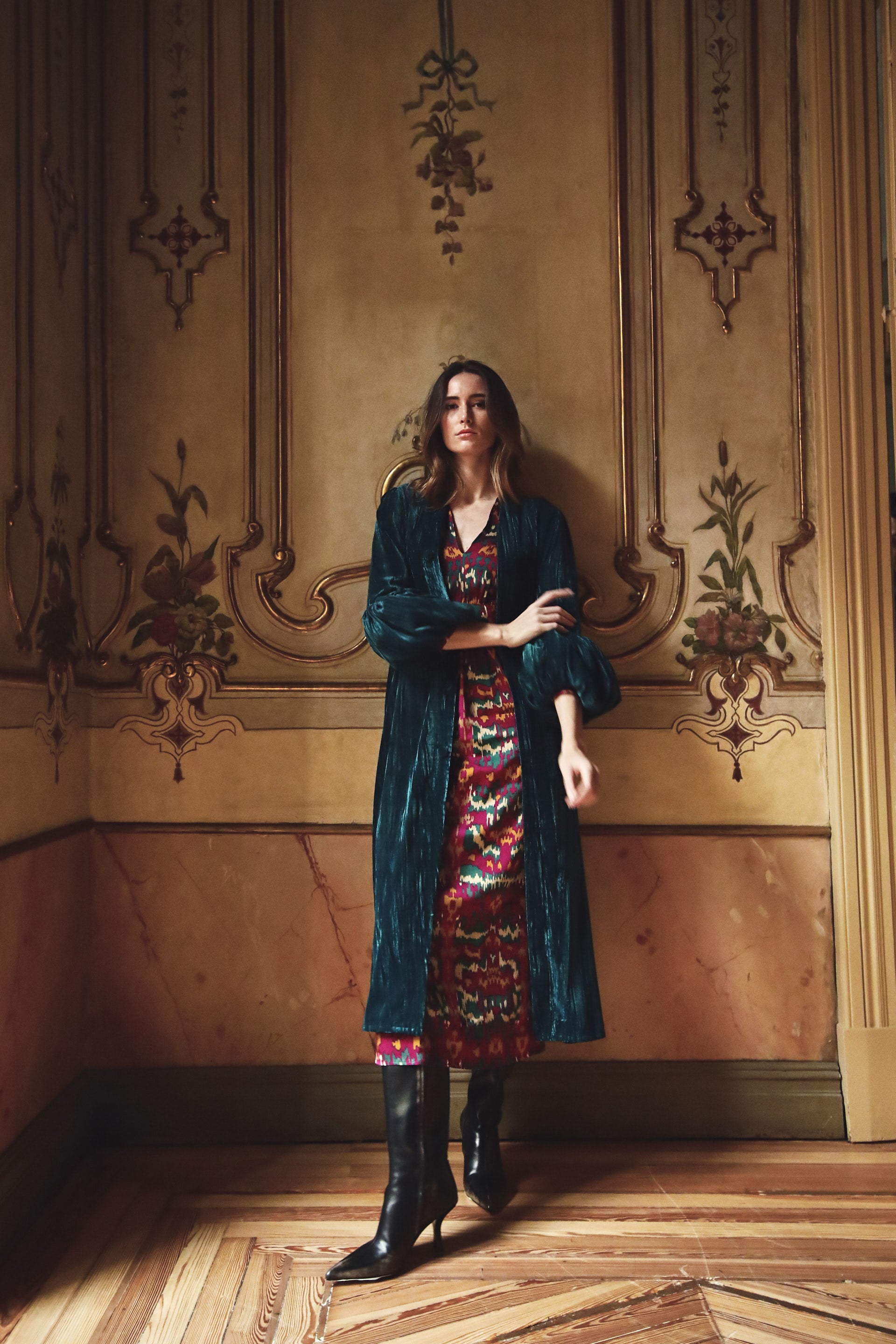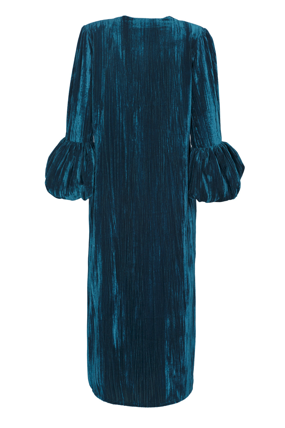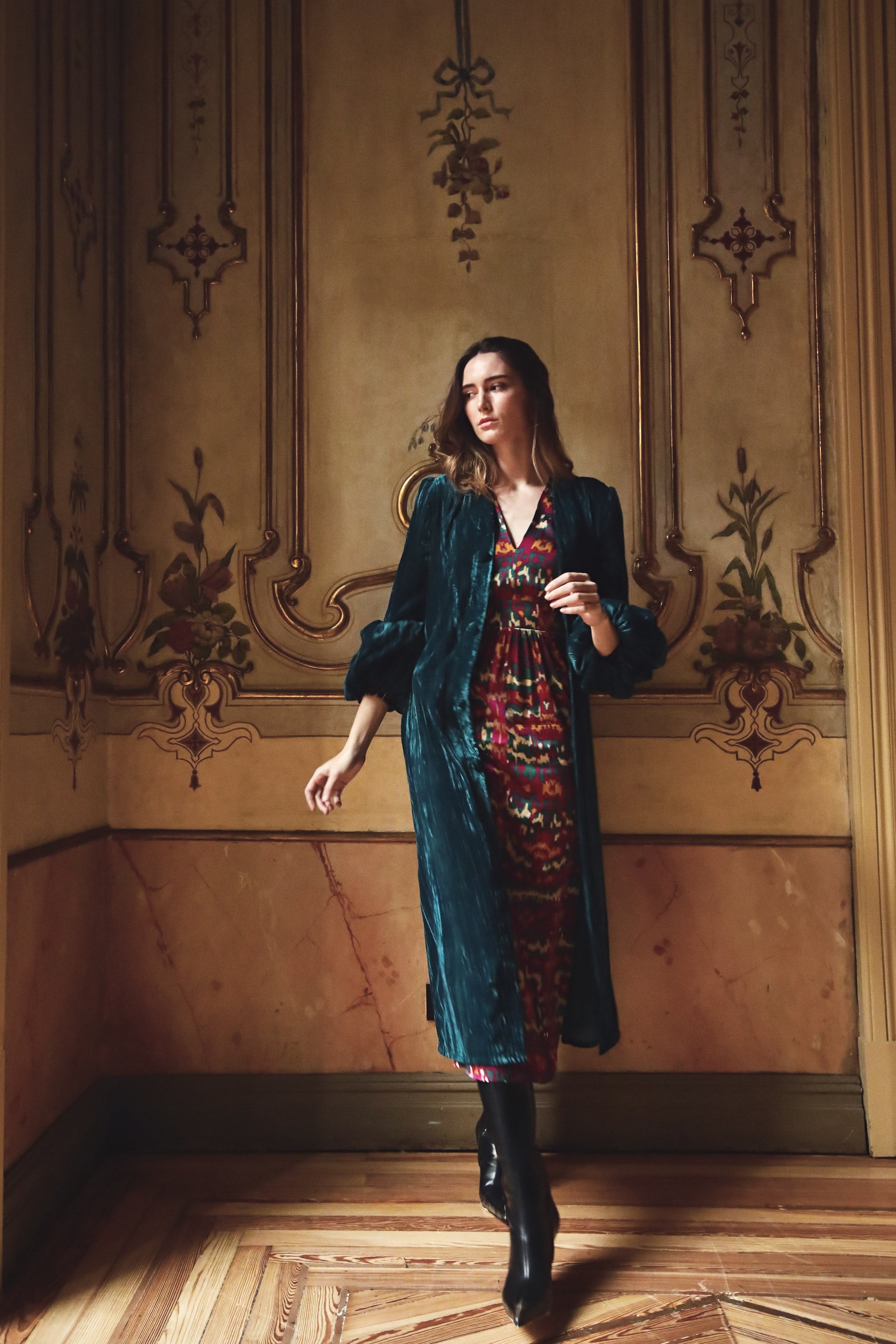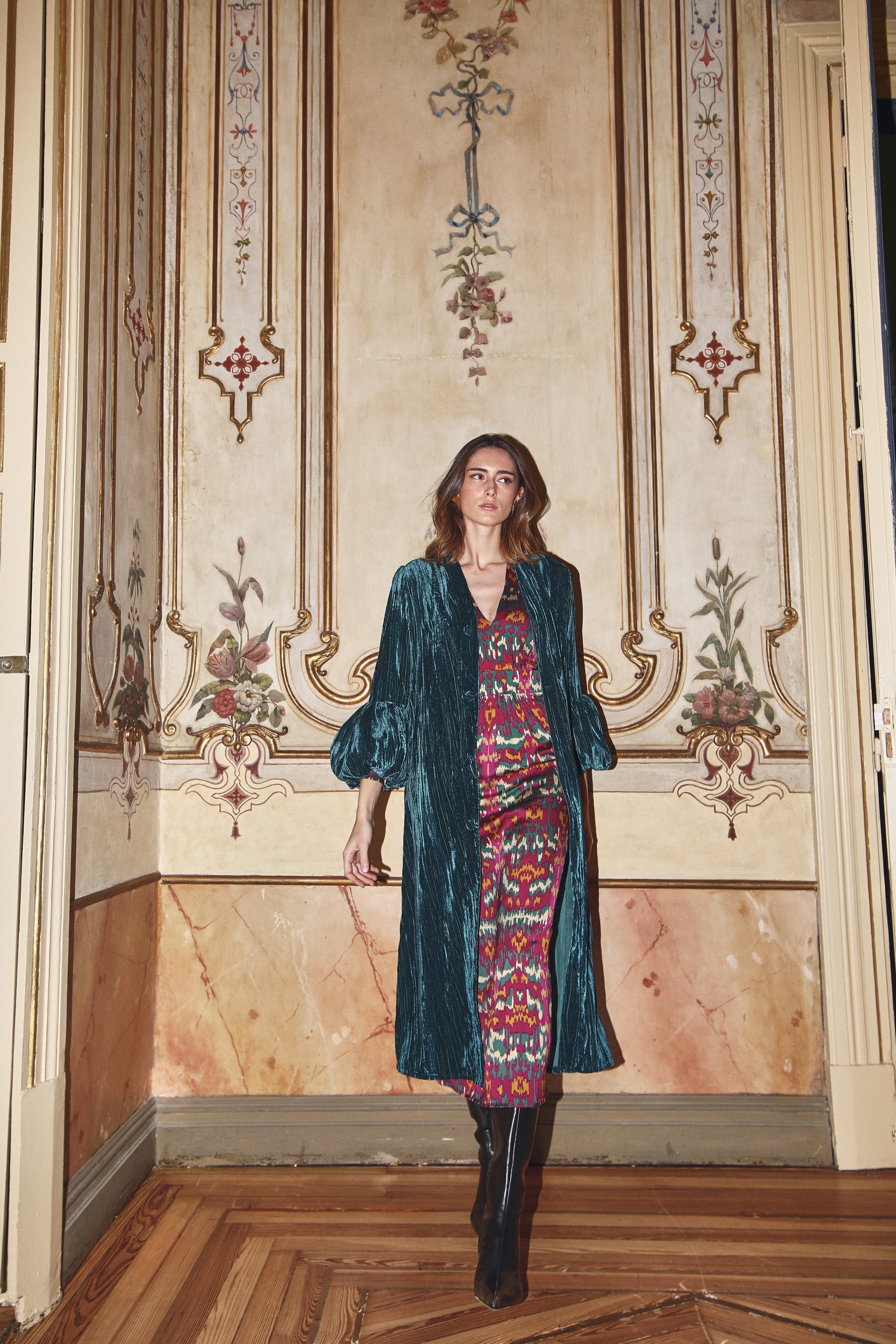 Long coat with V-neckline and long sleeves with puffed cuffs.