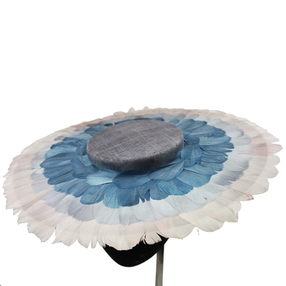 Pamela in parasisal lined with blue and nude tricolor goose feathers