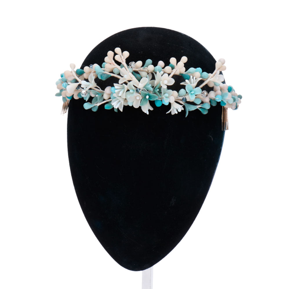 Tiara of cold porcelain flowers and pistils in blue and white tones, combined with blue crystals.