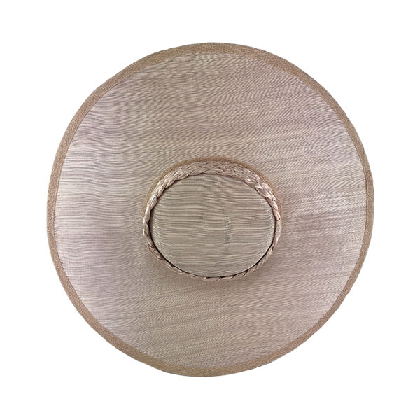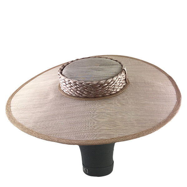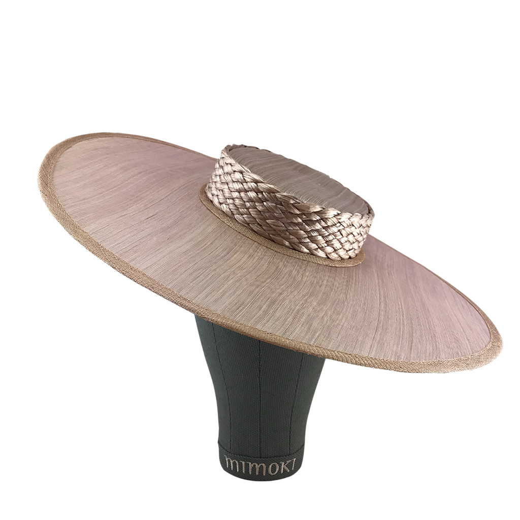 Wide-brimmed boater in pink silk raffia with braided raffia crown in the same colour