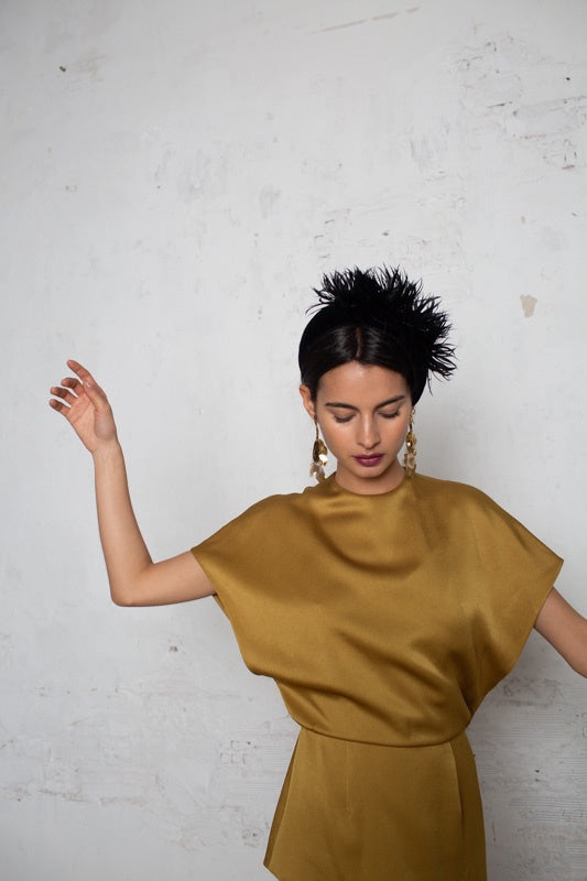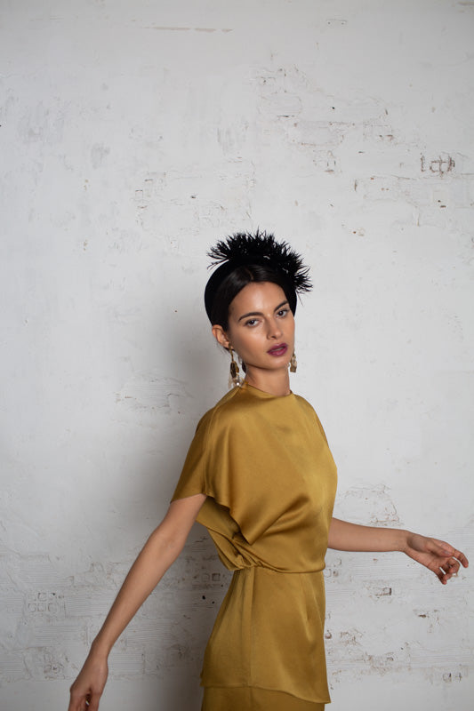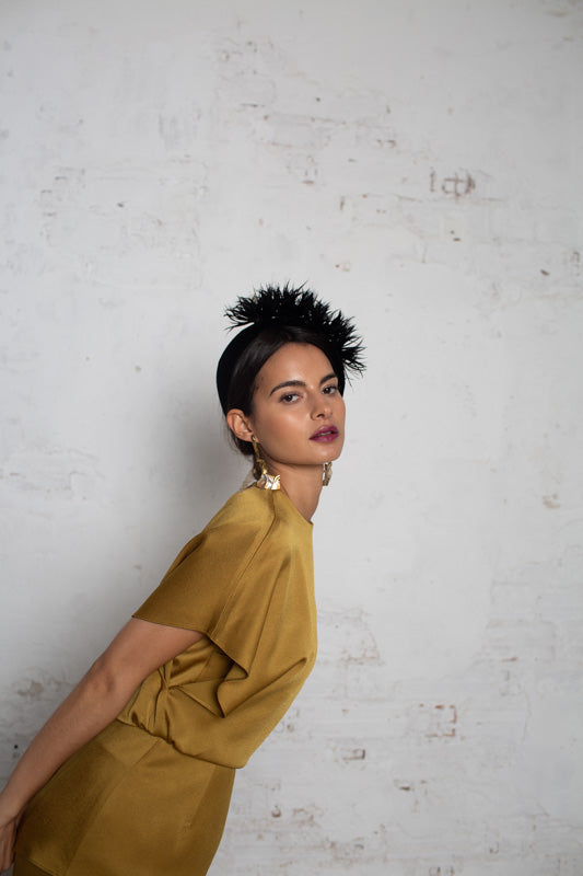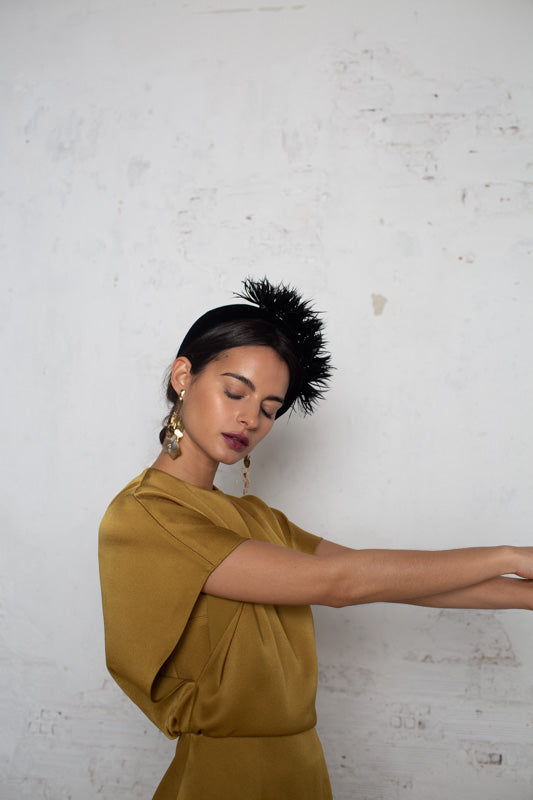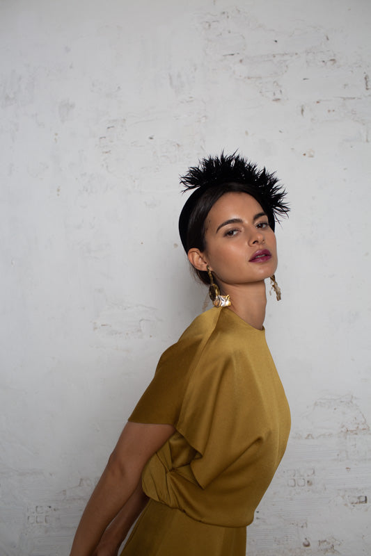 Rigid structure of wide black velvet headband with tone-on-tone trimmed feathers