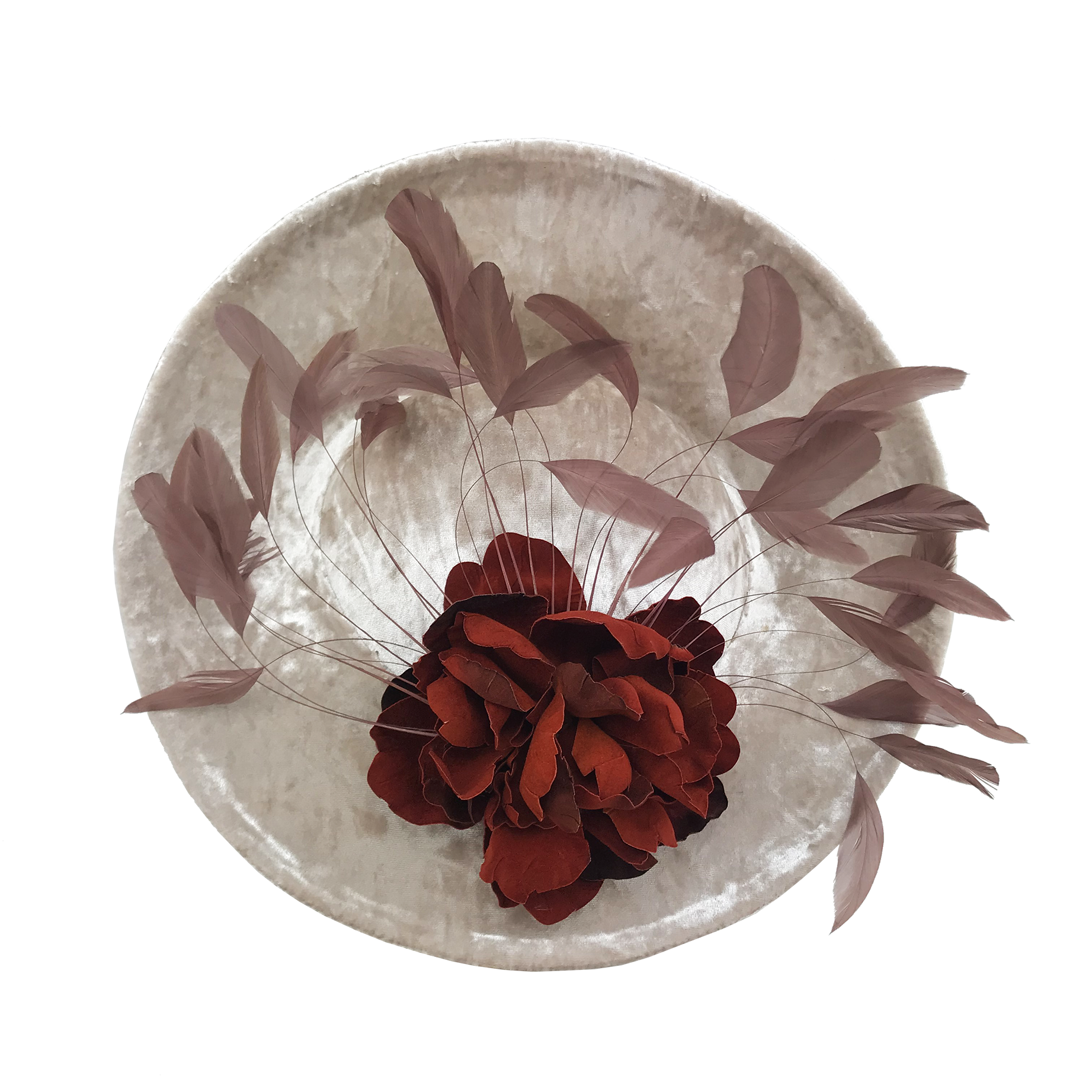 Maxi nude pink velvet dulcinea with kettle flower and taupe antennae.
