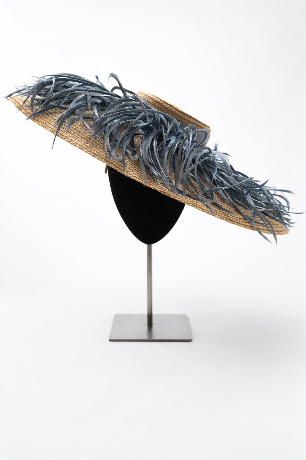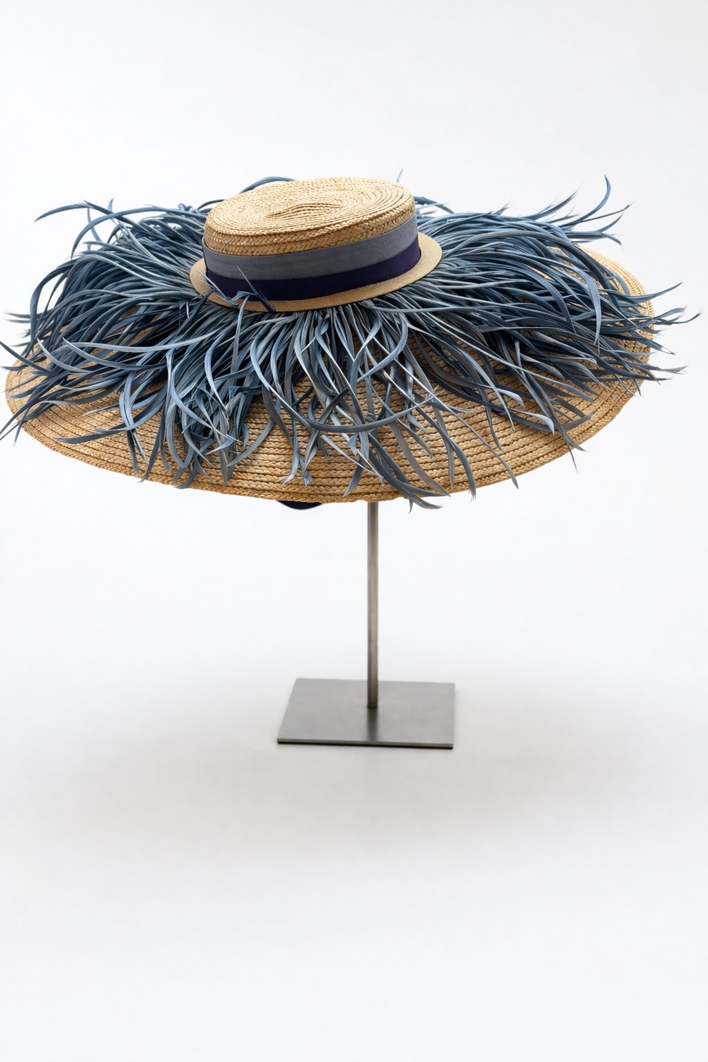 Pamela en rafia trenzada crudo con sierras azul en el ala y gros grain en 2 tonos de azul