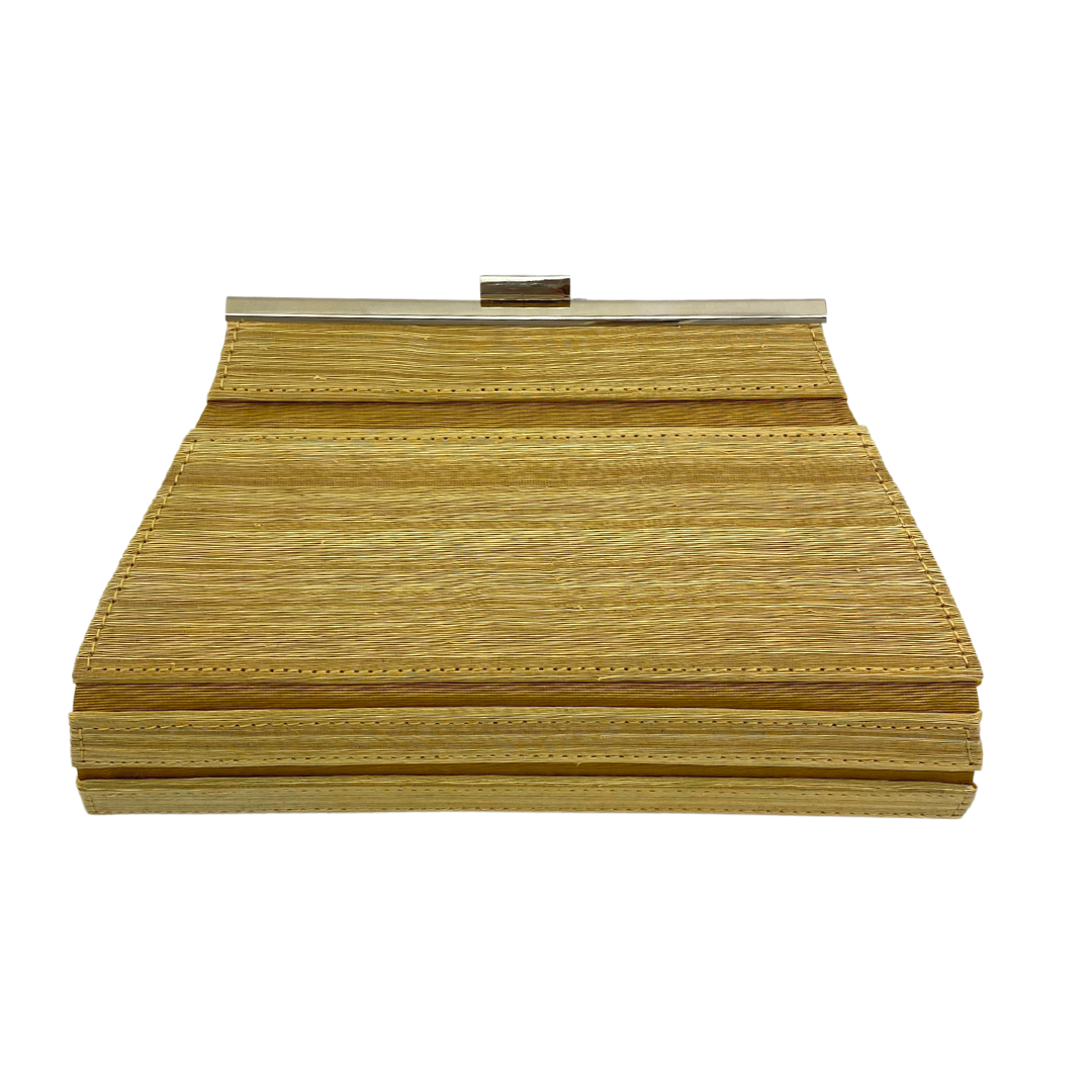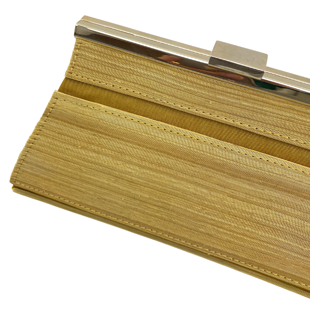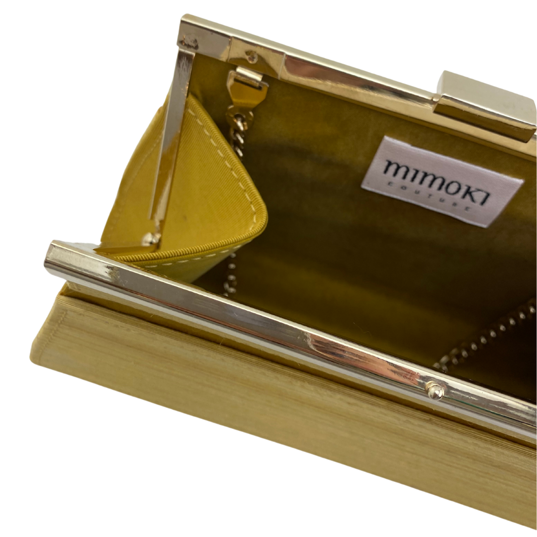 Shell bag in mustard silk raffia and matching fabric with a rectangular gold nozzle.