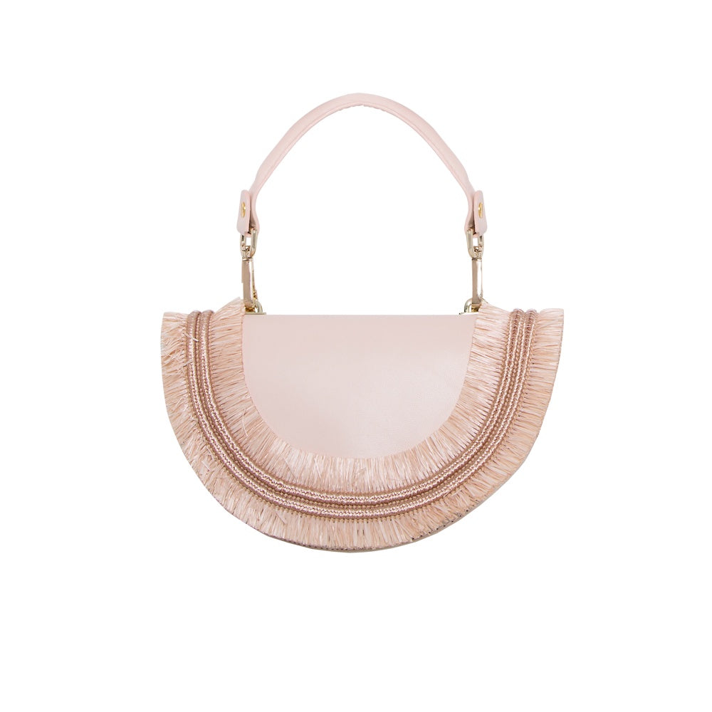 Semicircular bag in nude pink leather with raffia on the edge and handle.