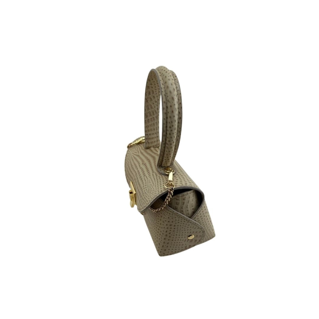 Folded bag in beige crocodile-effect leather with matching handle.