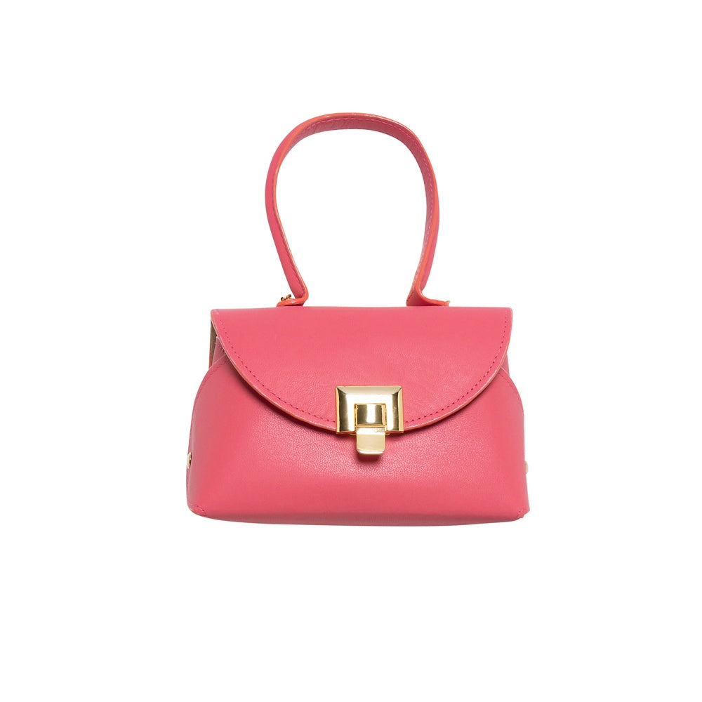 Folded bag in fuchsia pink leather with matching handle and gold metal clasp.