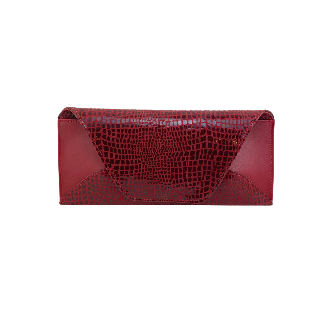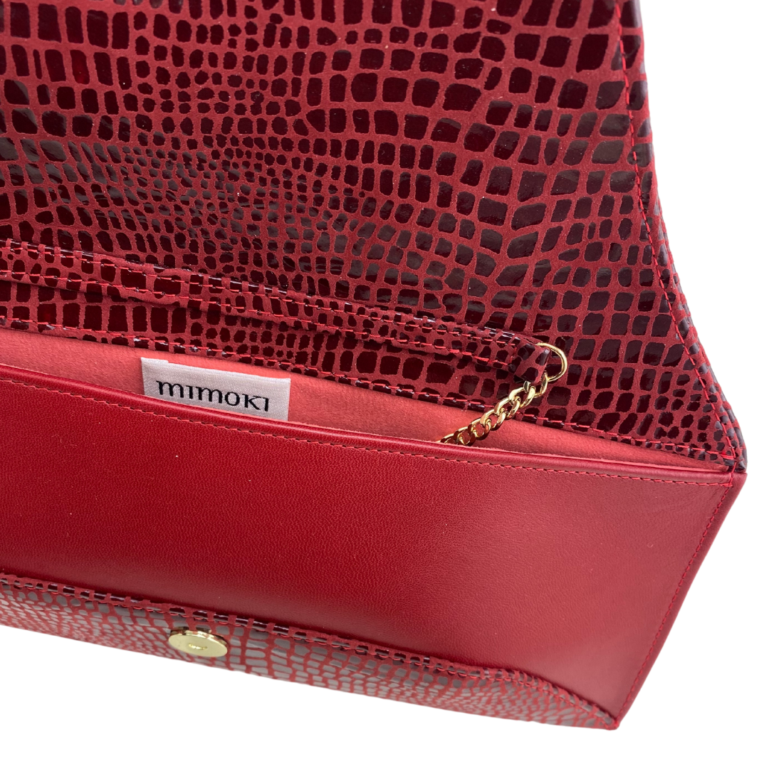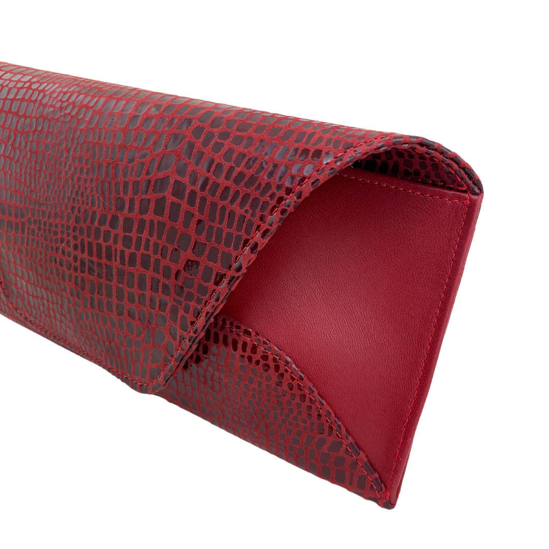 Envelope-style bag in red crocodile-effect leather with a smooth base.