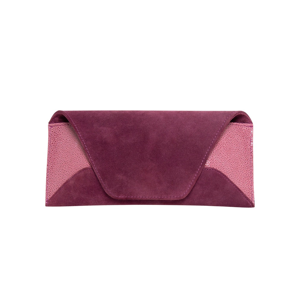 Eggplant-coloured suede envelope bag with a printed shiny fabric bottom