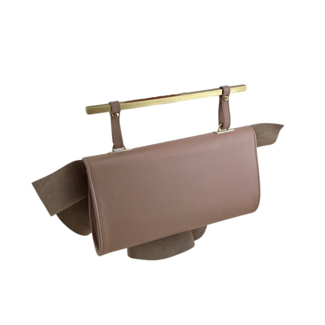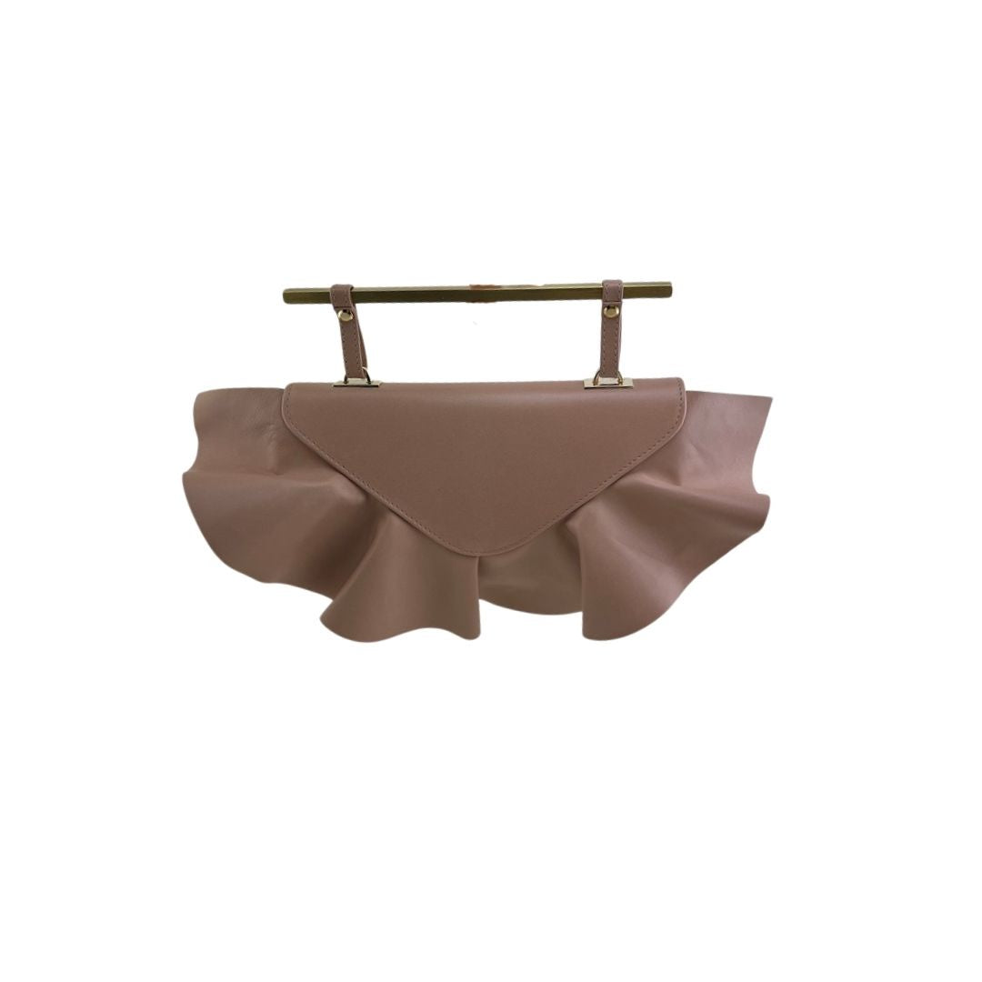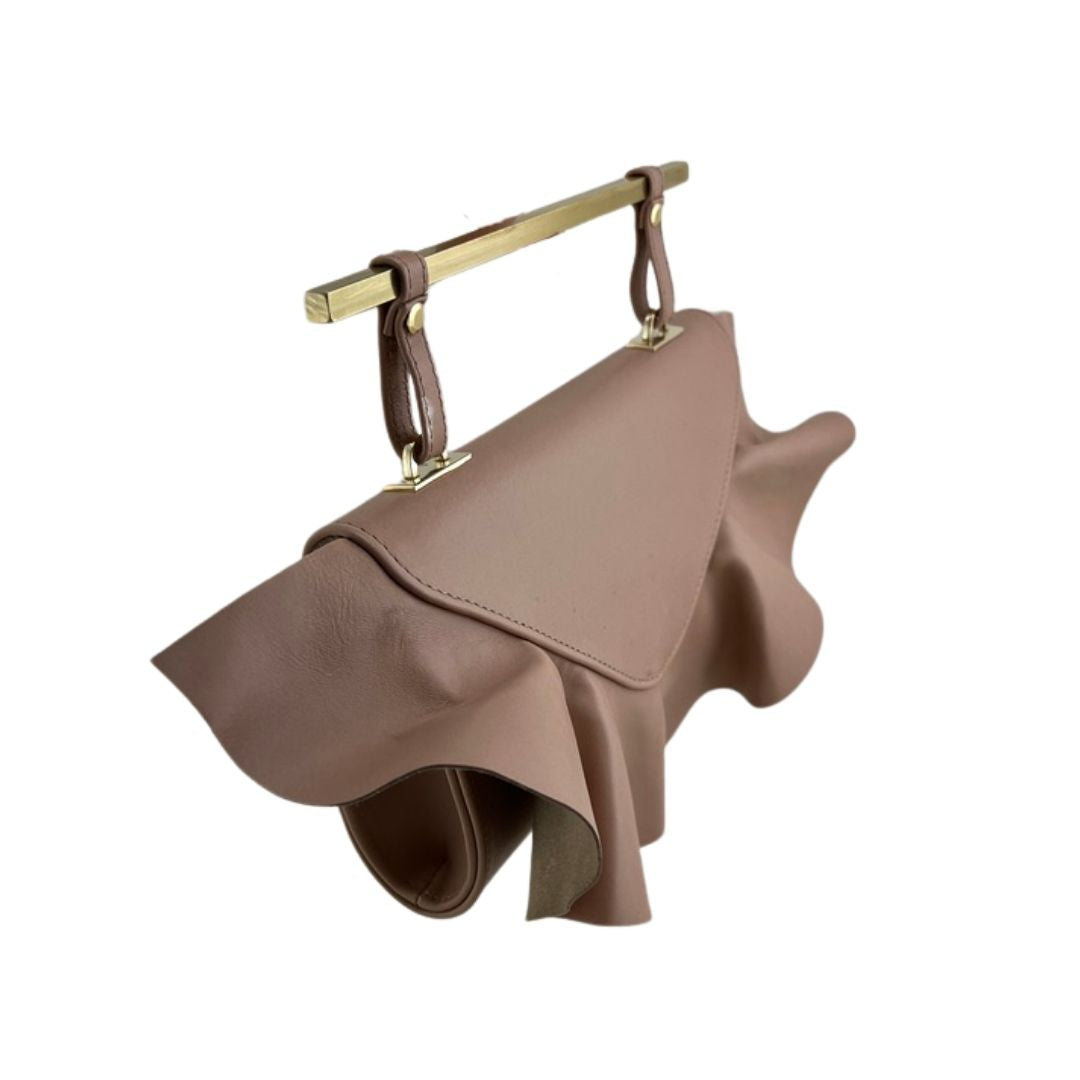 Nude pink leather ruffle bag with gold handle.