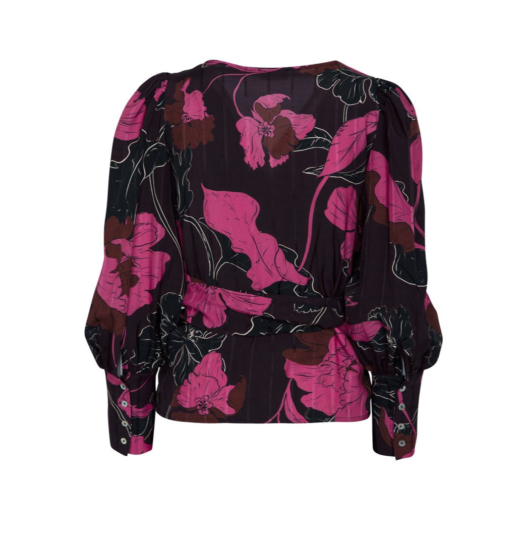 Puffed sleeve shirt with a V-neck tied at the waist.