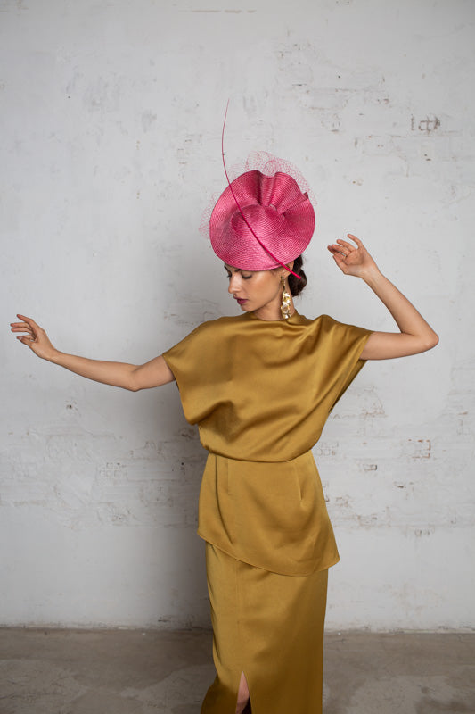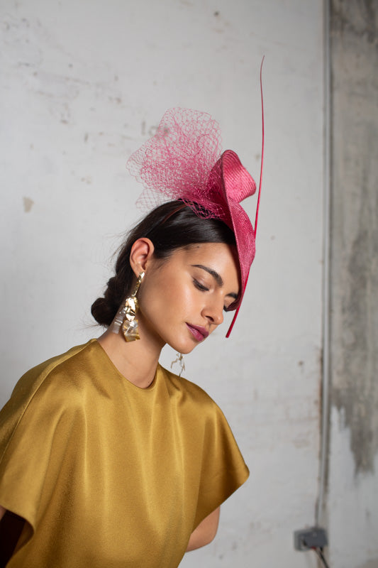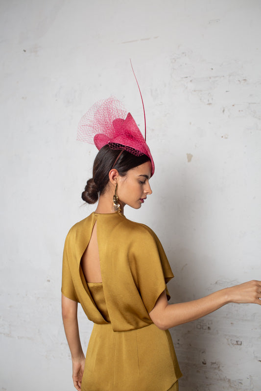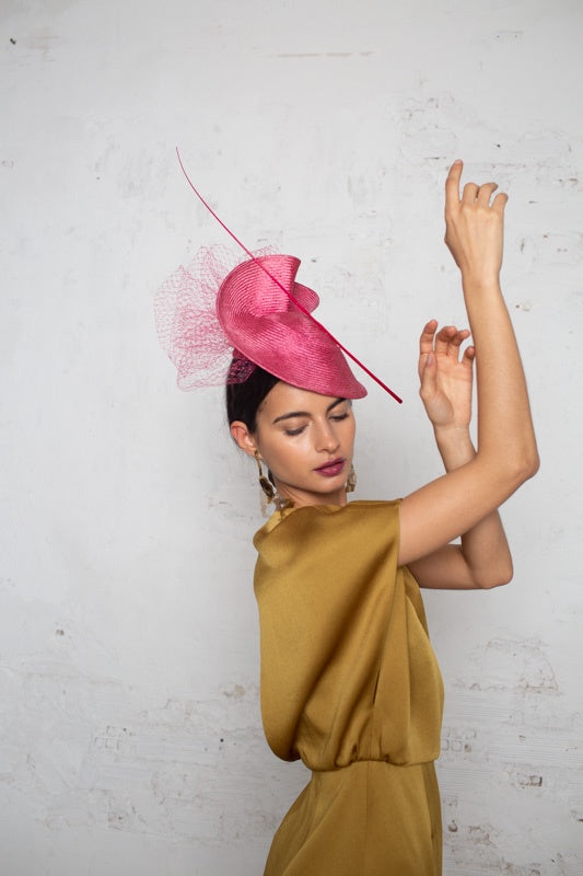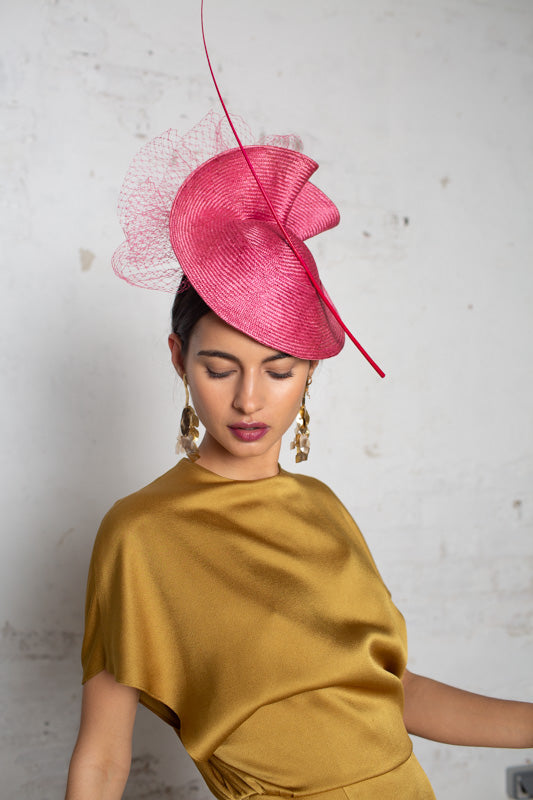 Bubblegum pink parasisal cap with wavy brim, veil and rachis in the same colour