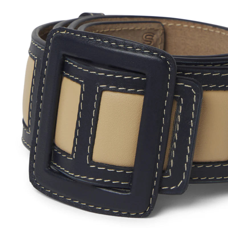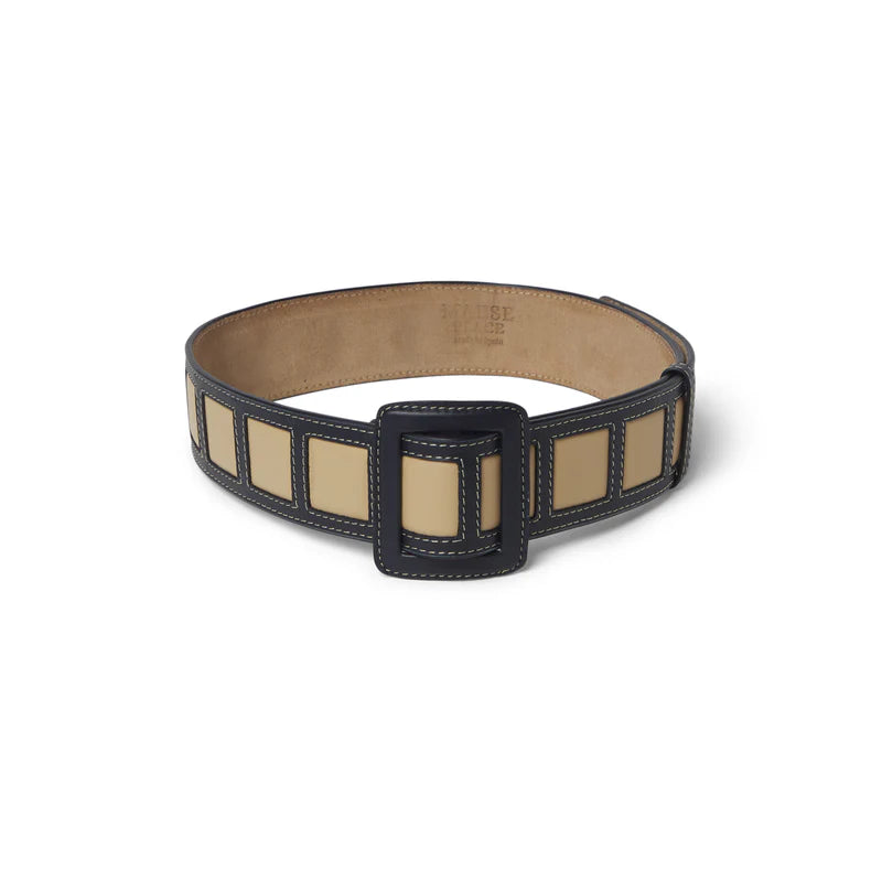 El diseño en cuadrícula juega con el contraste de dos tipos de piel, aportando textura y profundidad visual. La hebilla, también forrada en piel, completa el conjunto con un acabado sofisticado y atemporal. Además, incorpora una presilla móvil que permite ajustar el cinturón tanto a la cintura como a la cadera, adaptándose a diferentes estilos y siluetas.