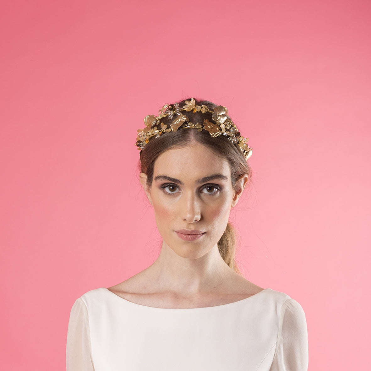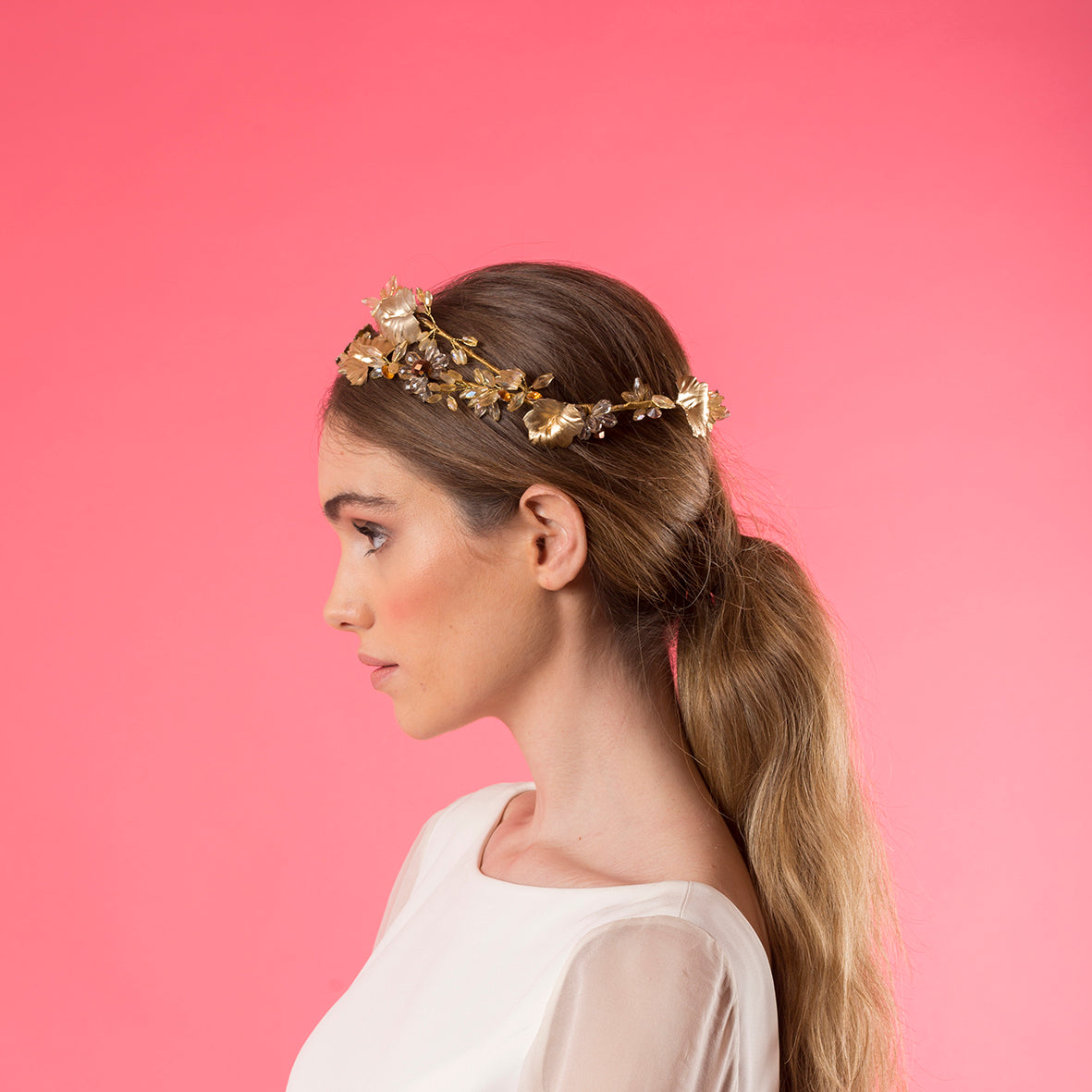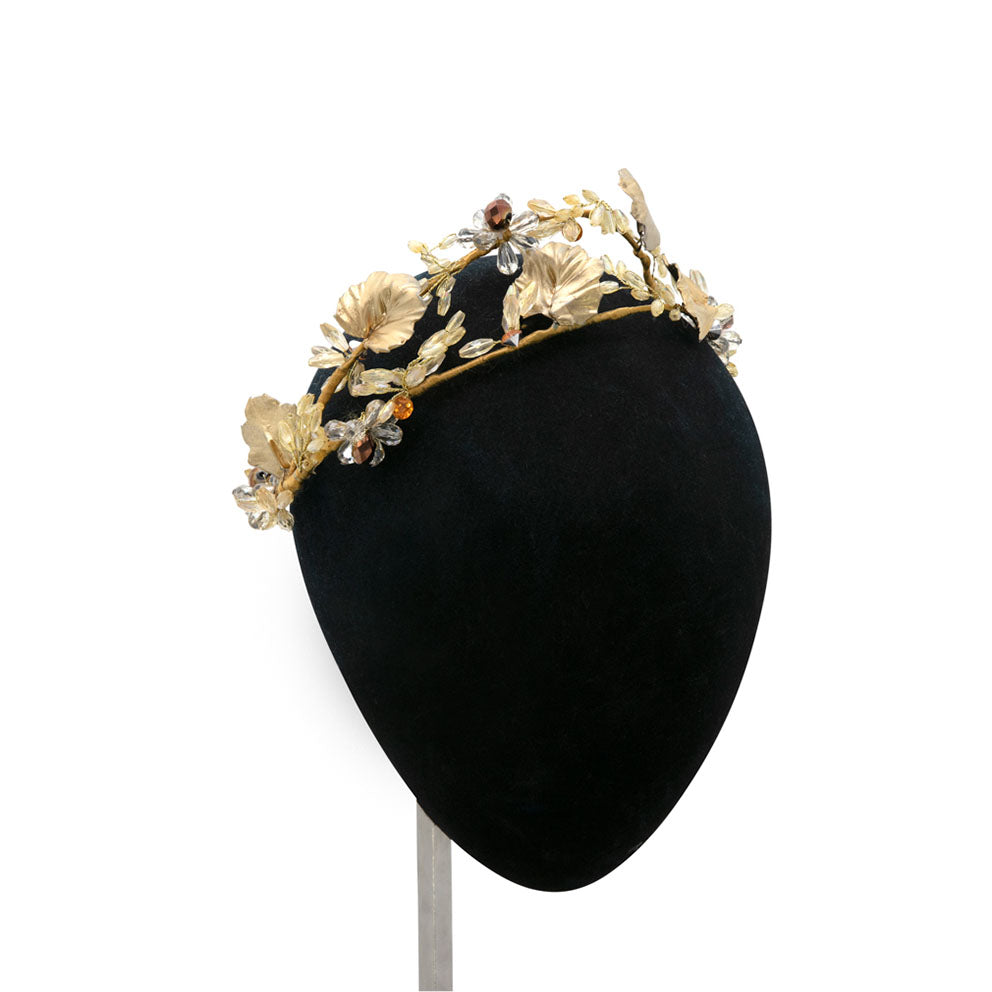 Crown of amber and greyish crystals with champagne porcelain fig leaves.