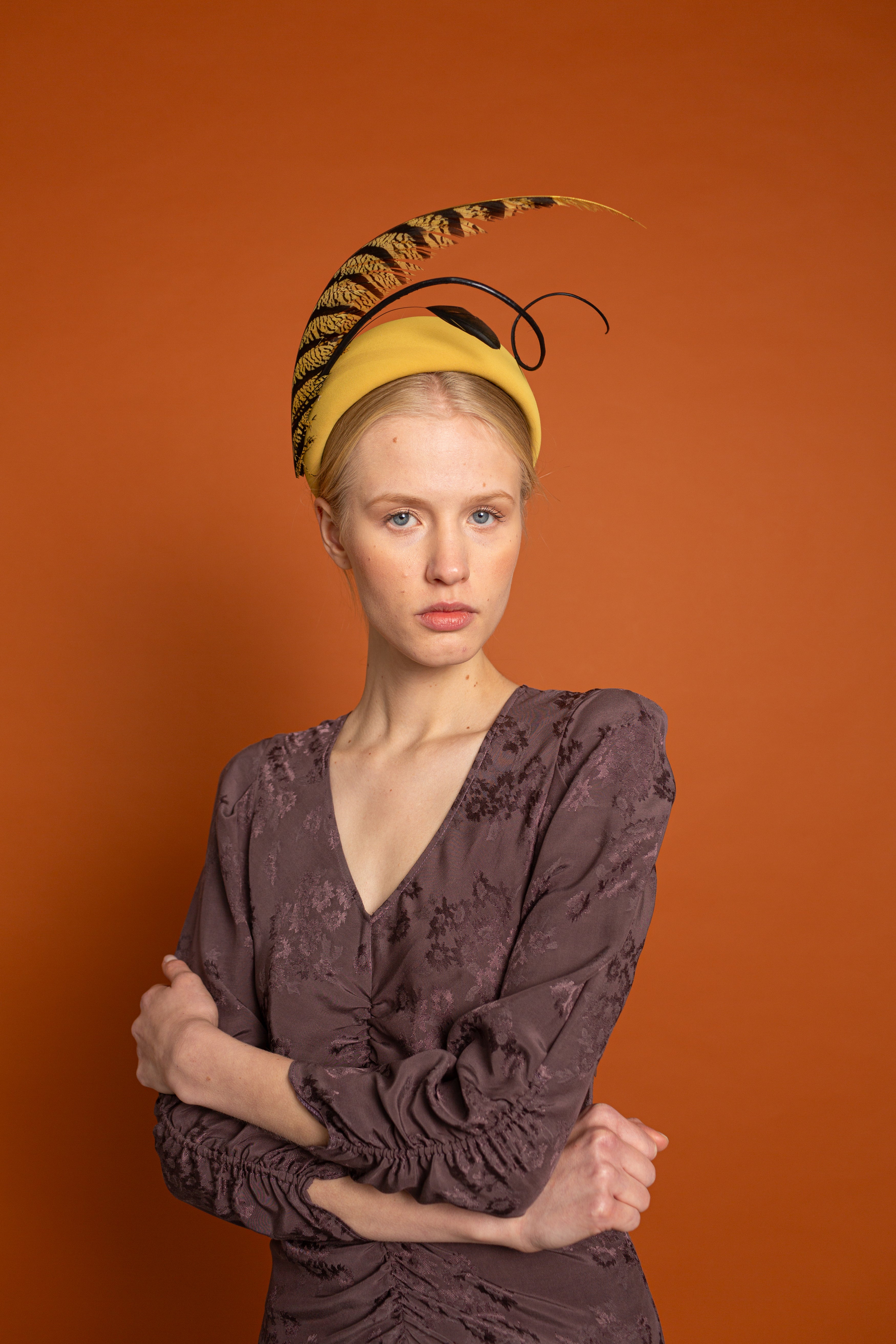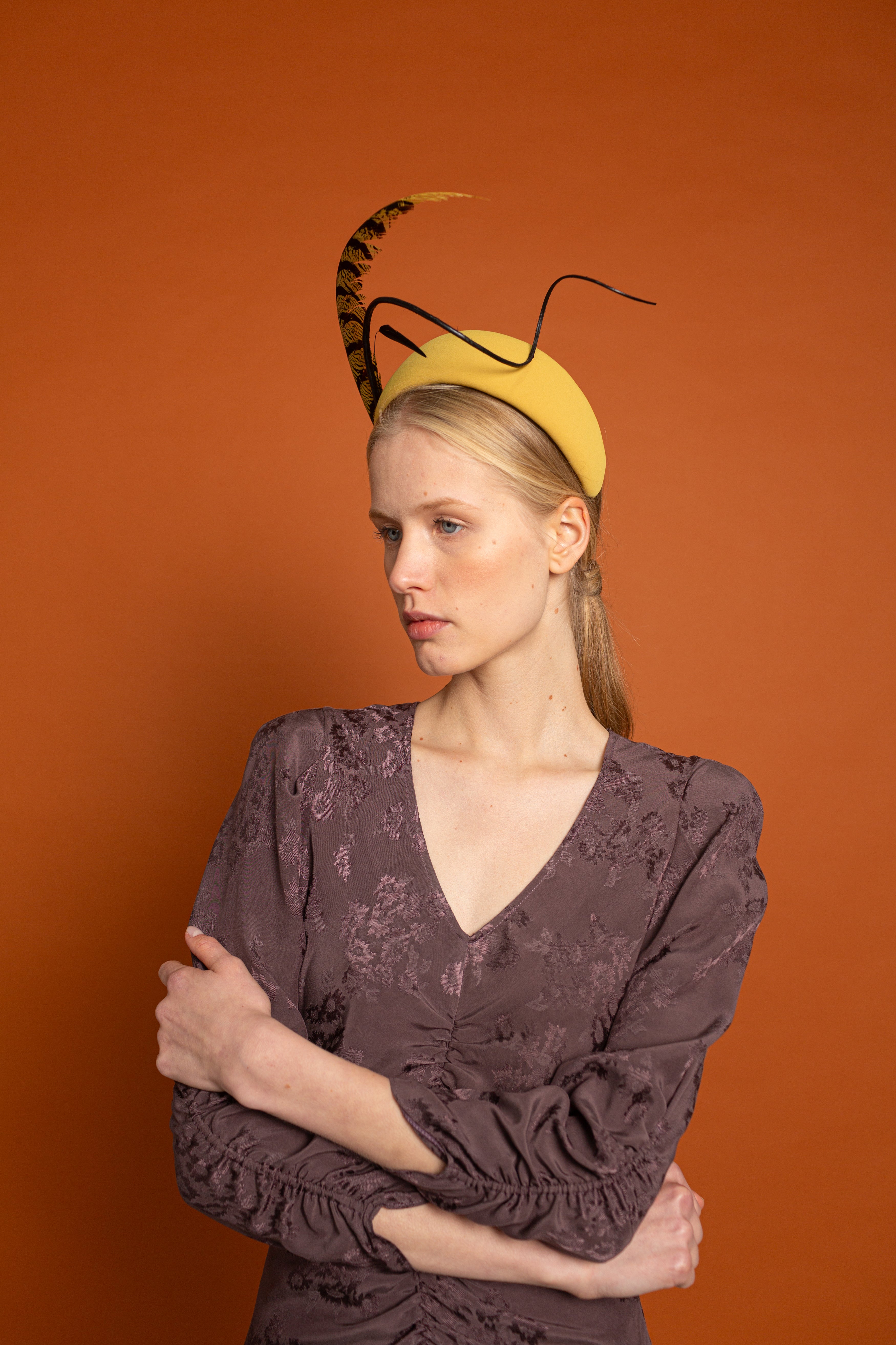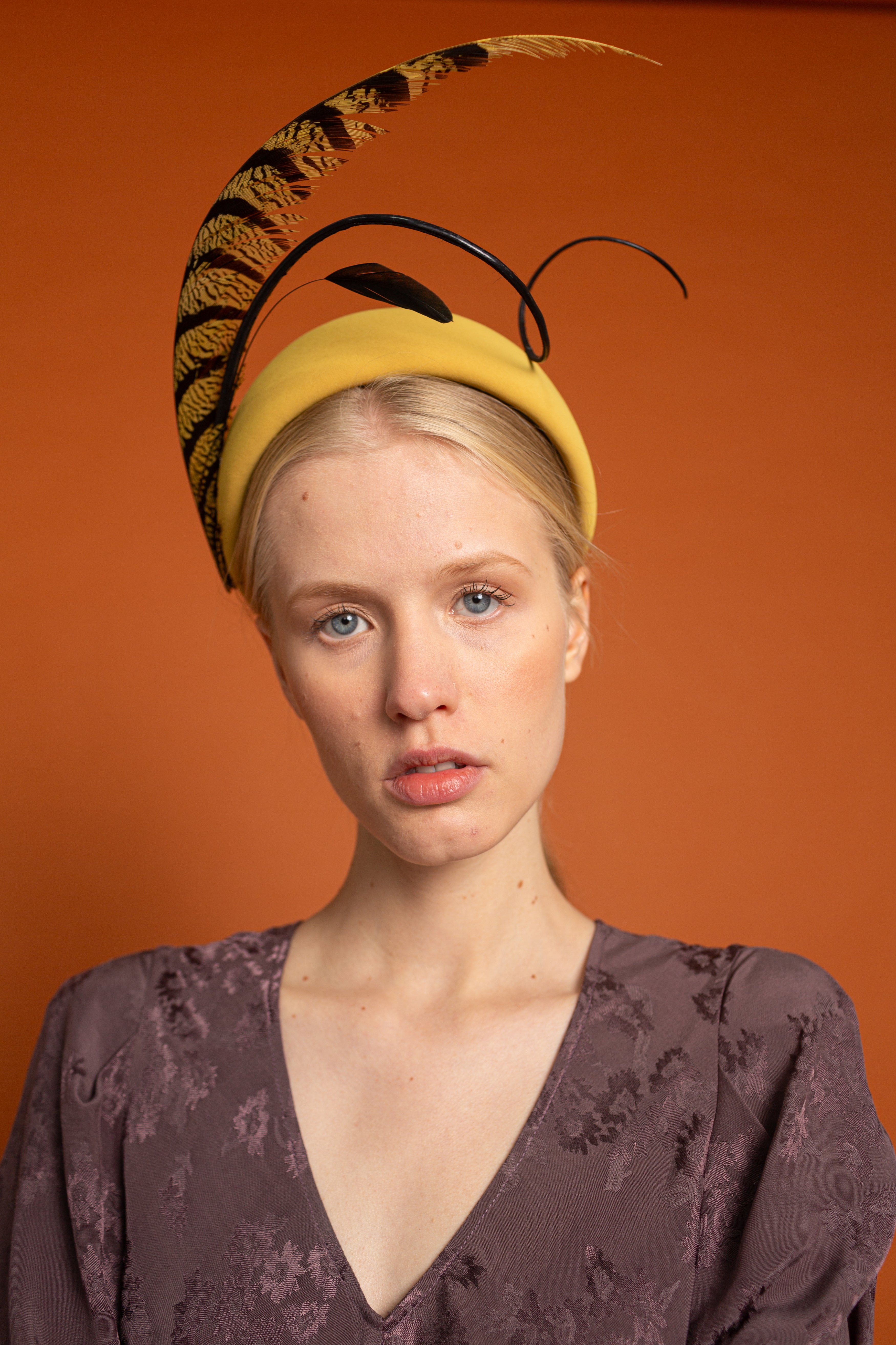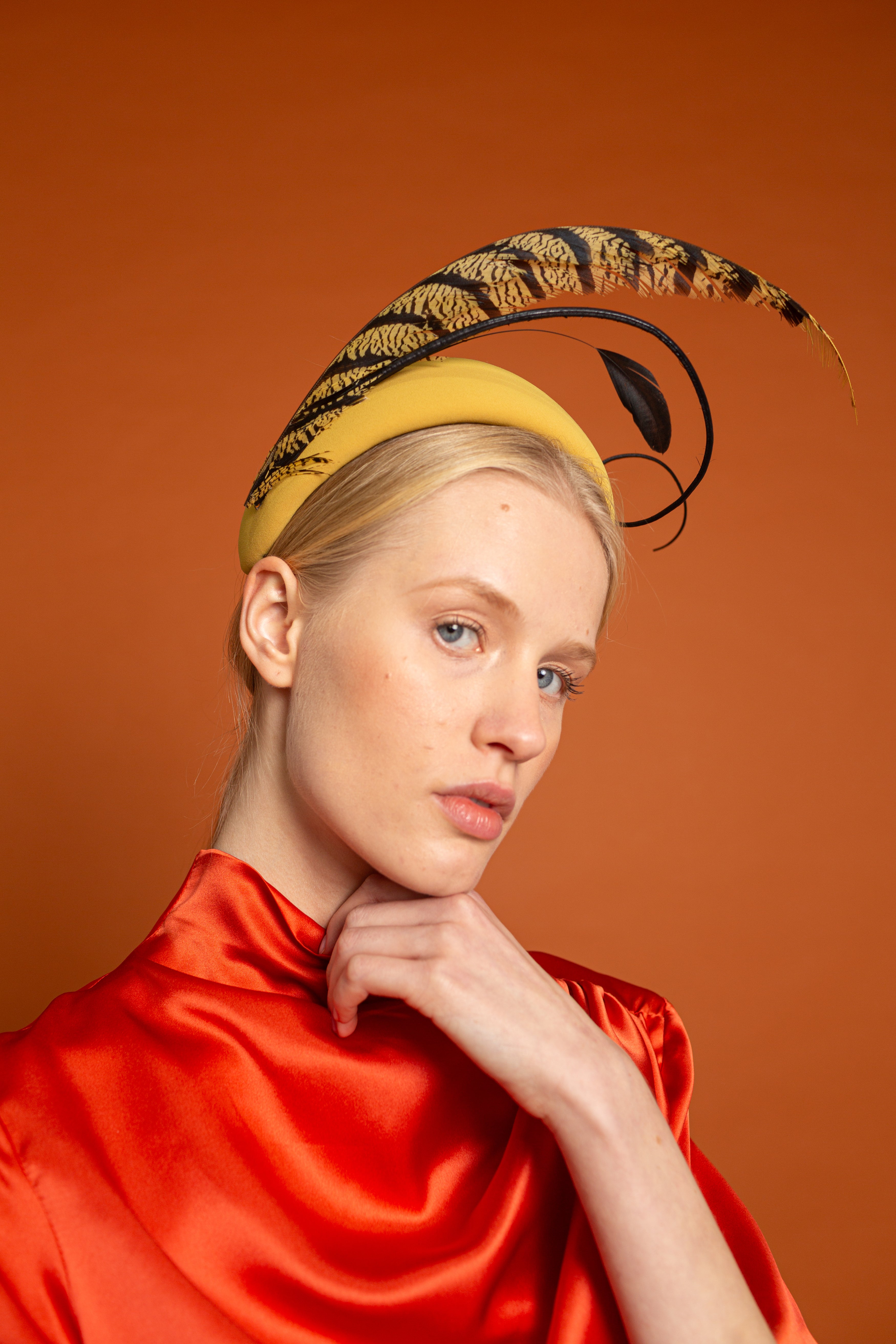 Wide headband lined in mustard crepe with matching pheasant. Black antenna and curved spine.