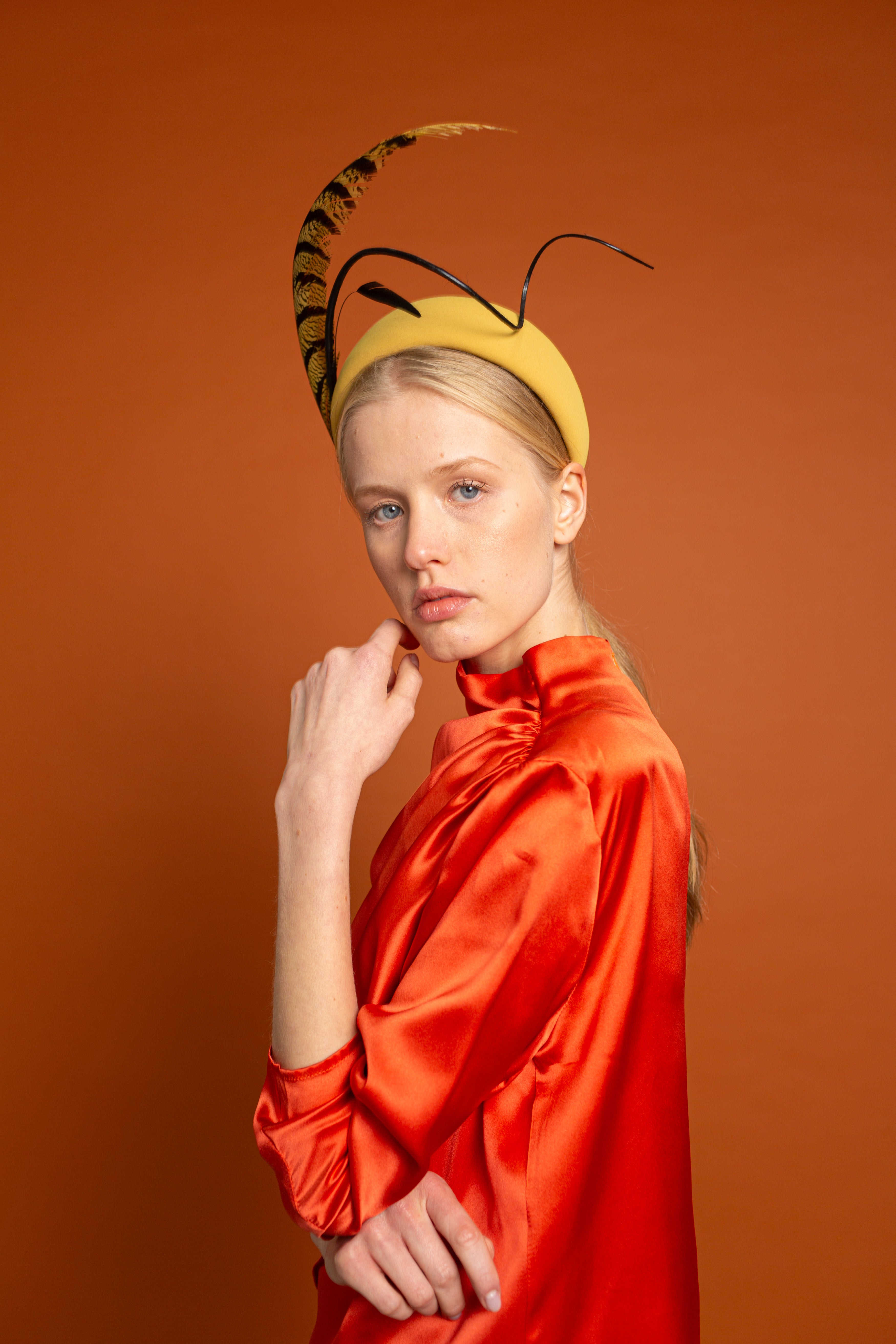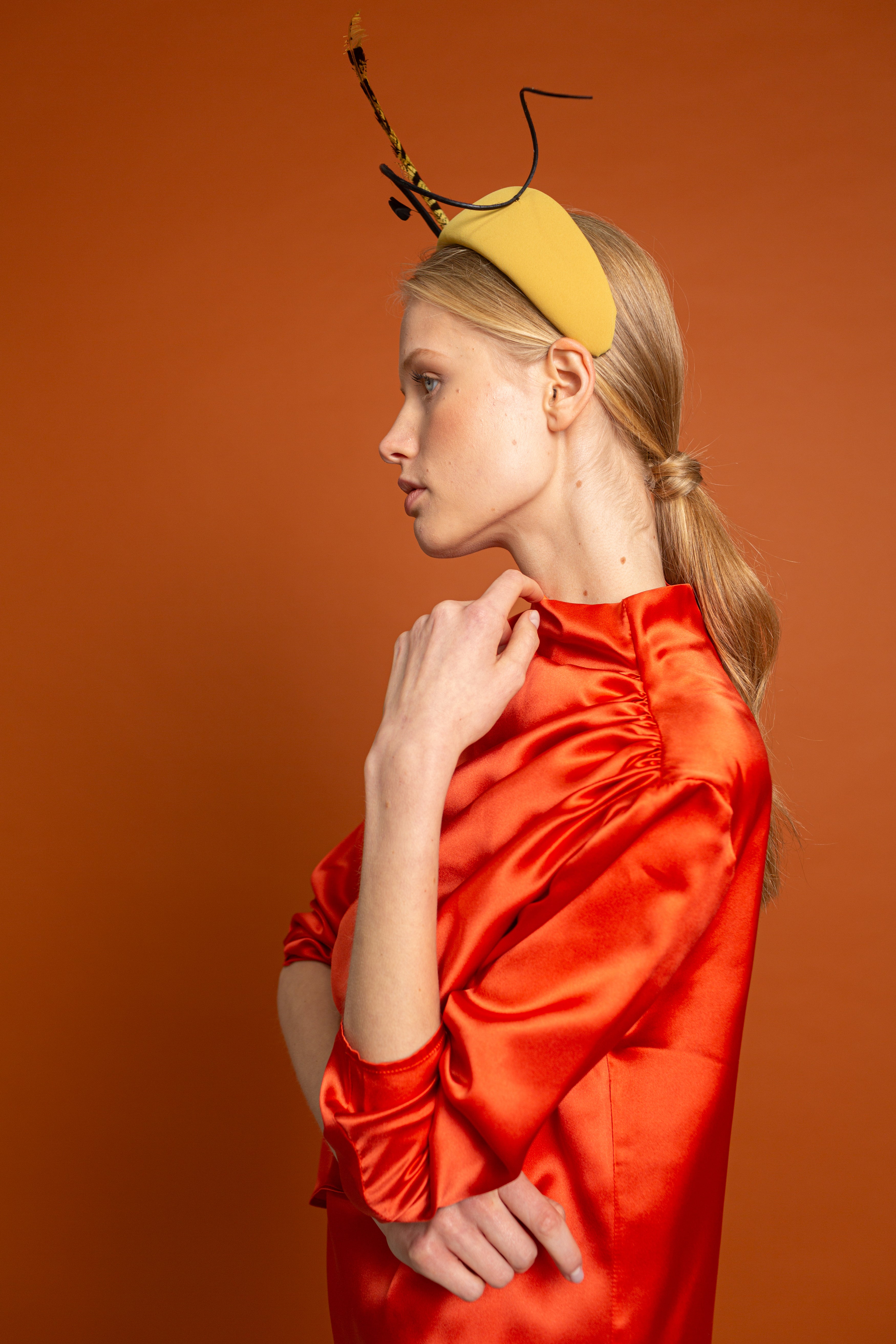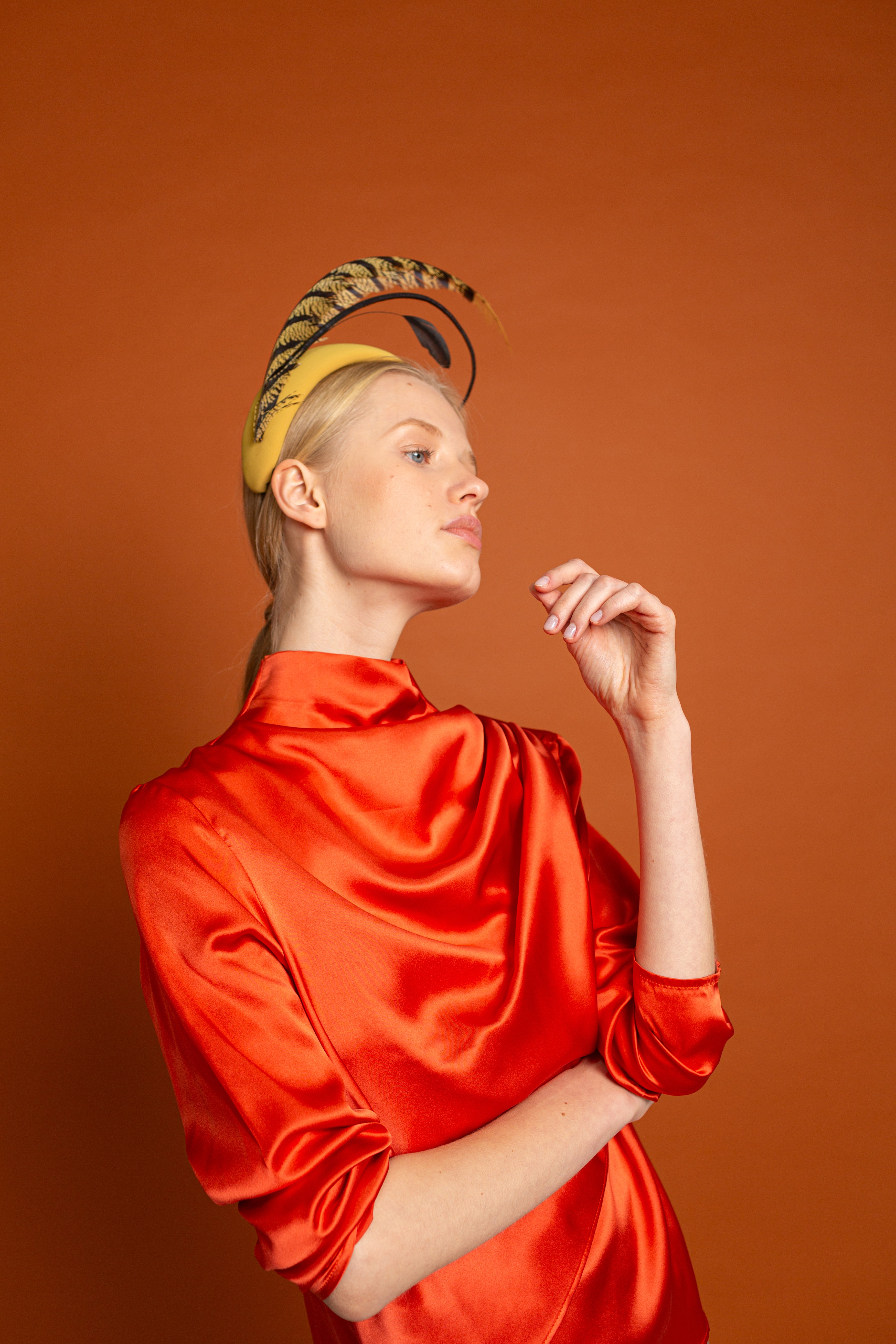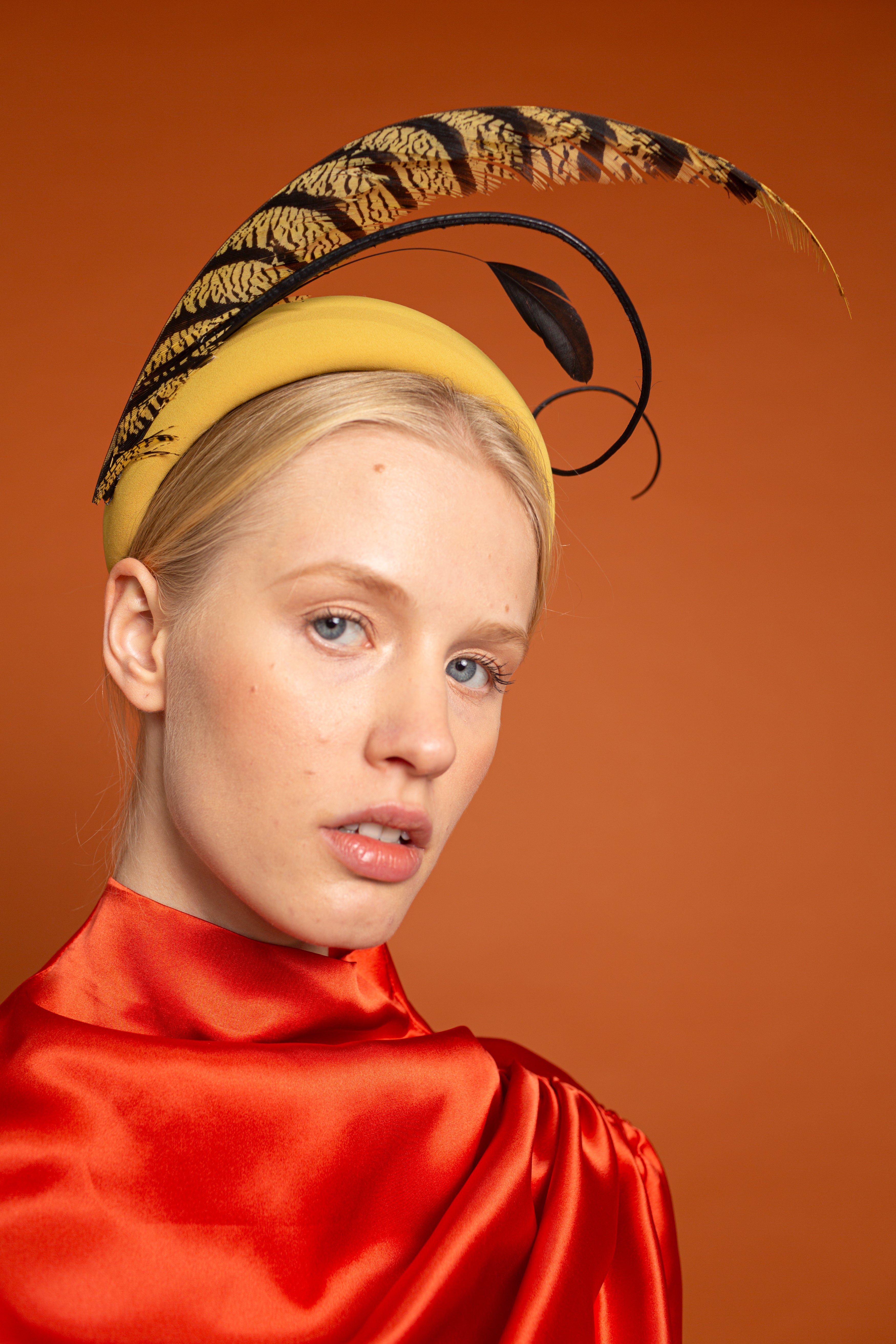 Wide headband lined in mustard crepe with matching pheasant. Black antenna and curved spine.