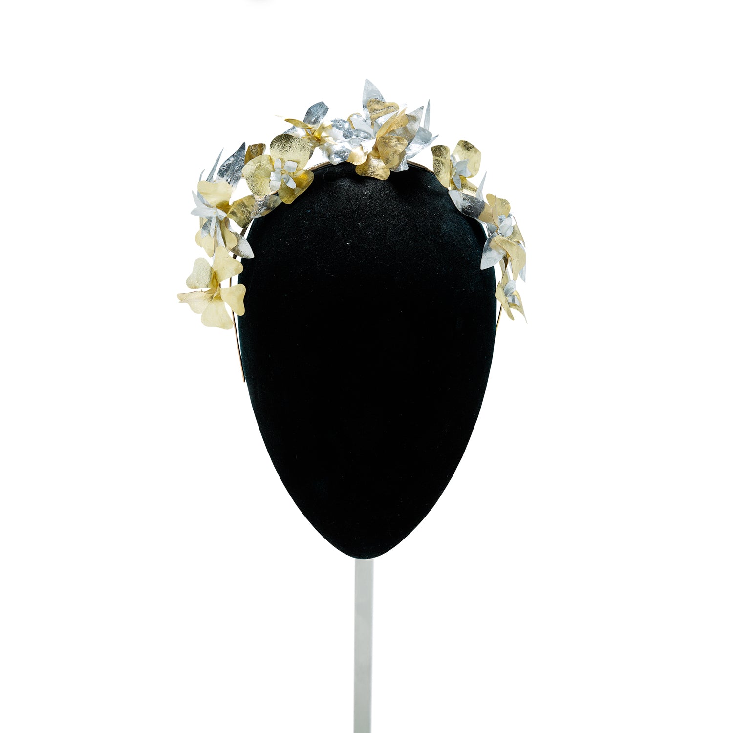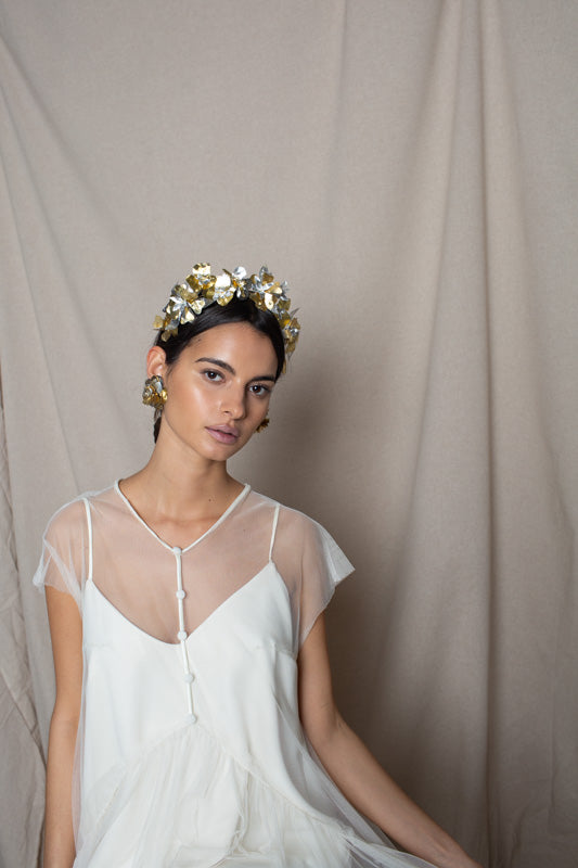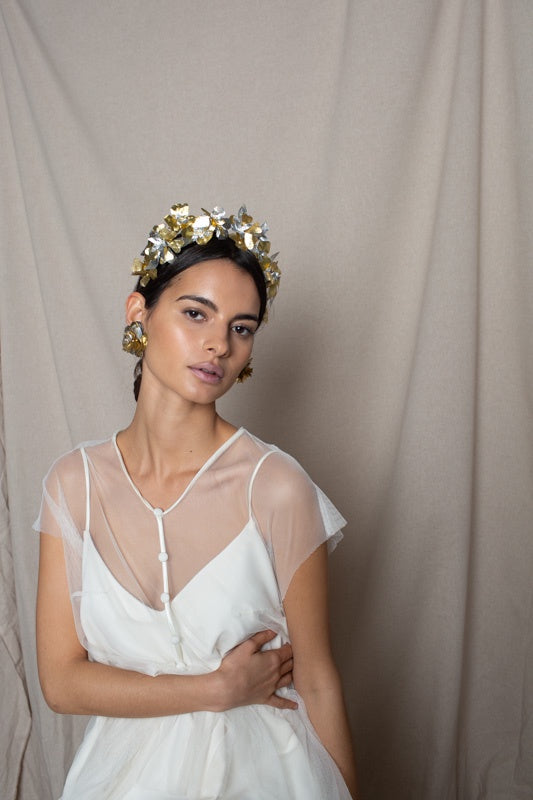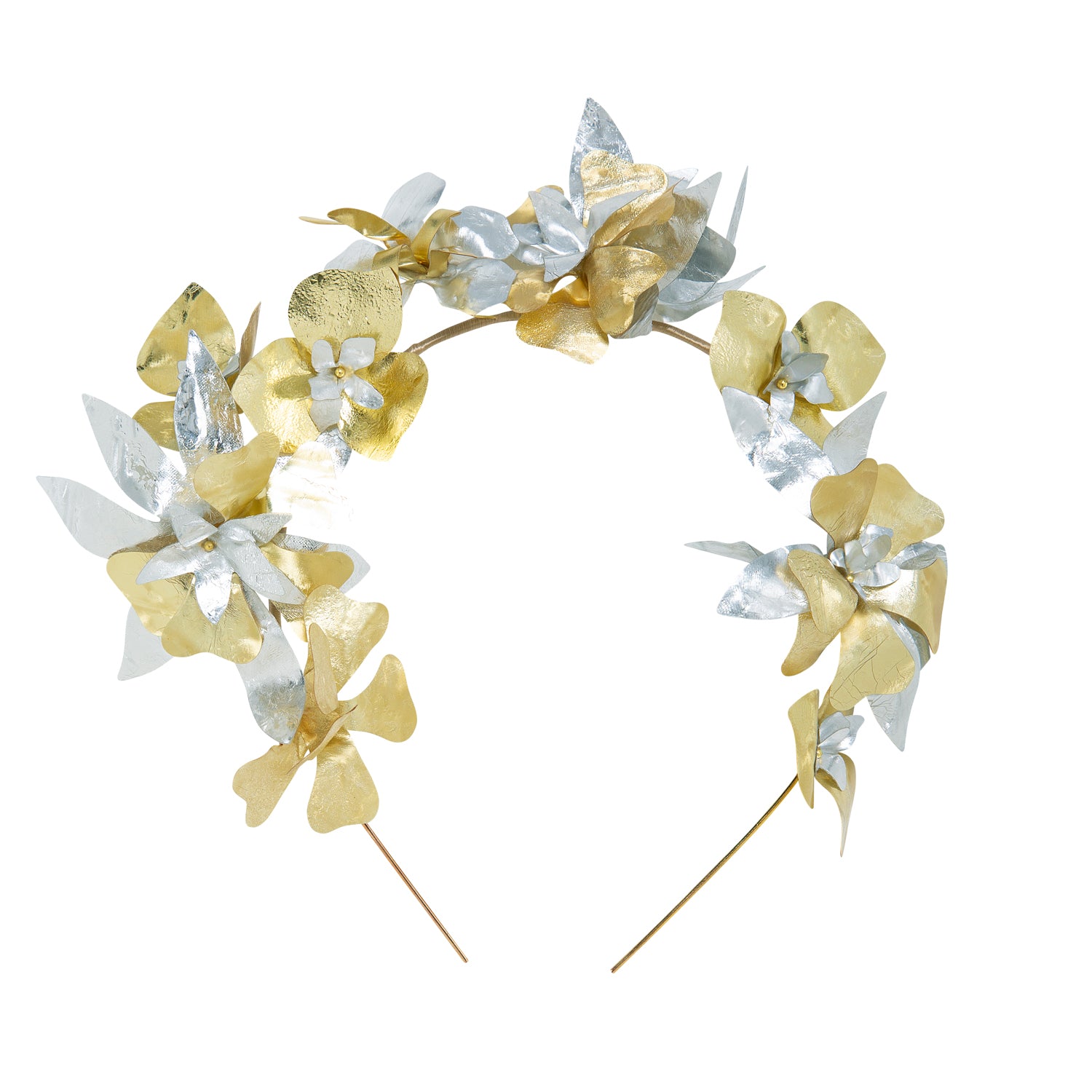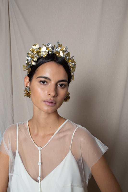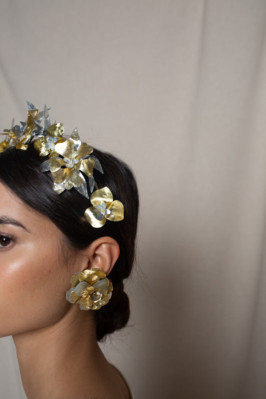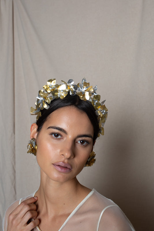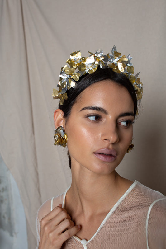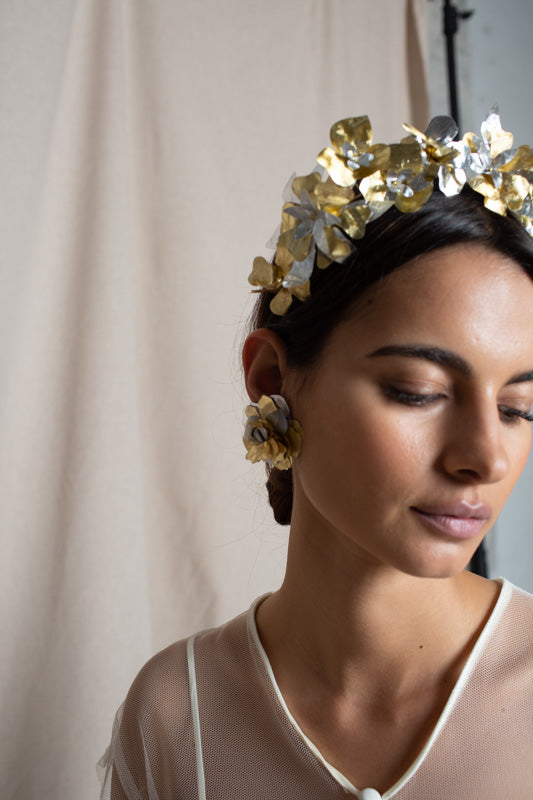 Recycled plastic flower headband in gold and silver