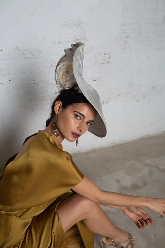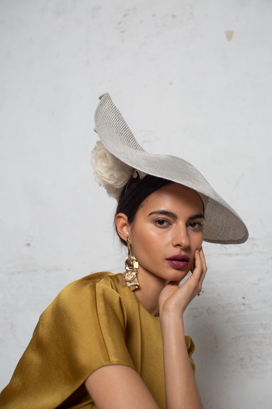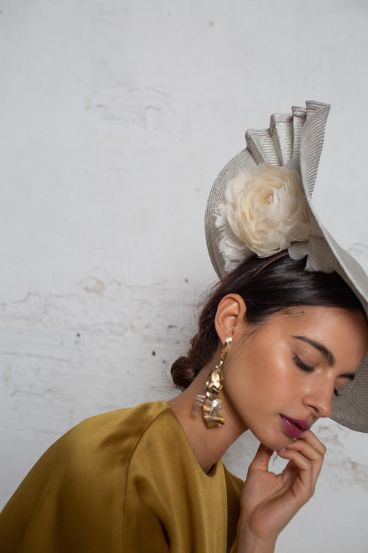 Pearl grey pleated parasisal wing with ecru feather flowers