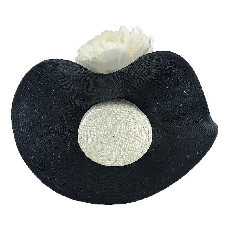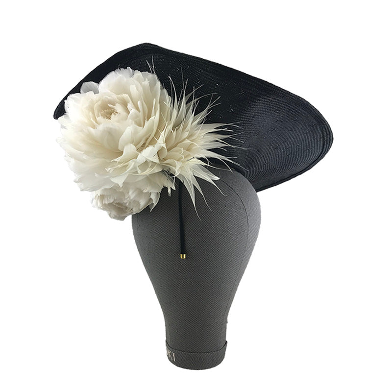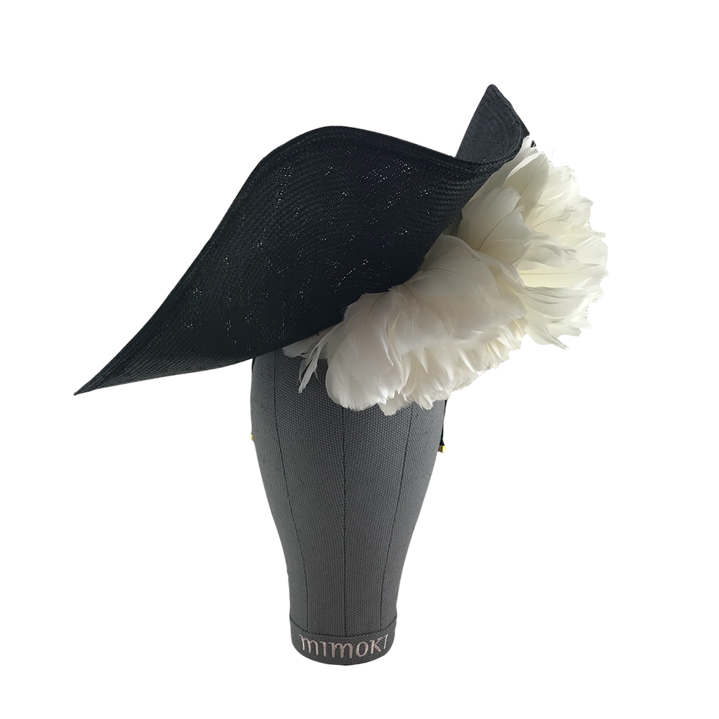 Medium black parasisal dulcinea with raised wing, white square crown and white feathery flowers