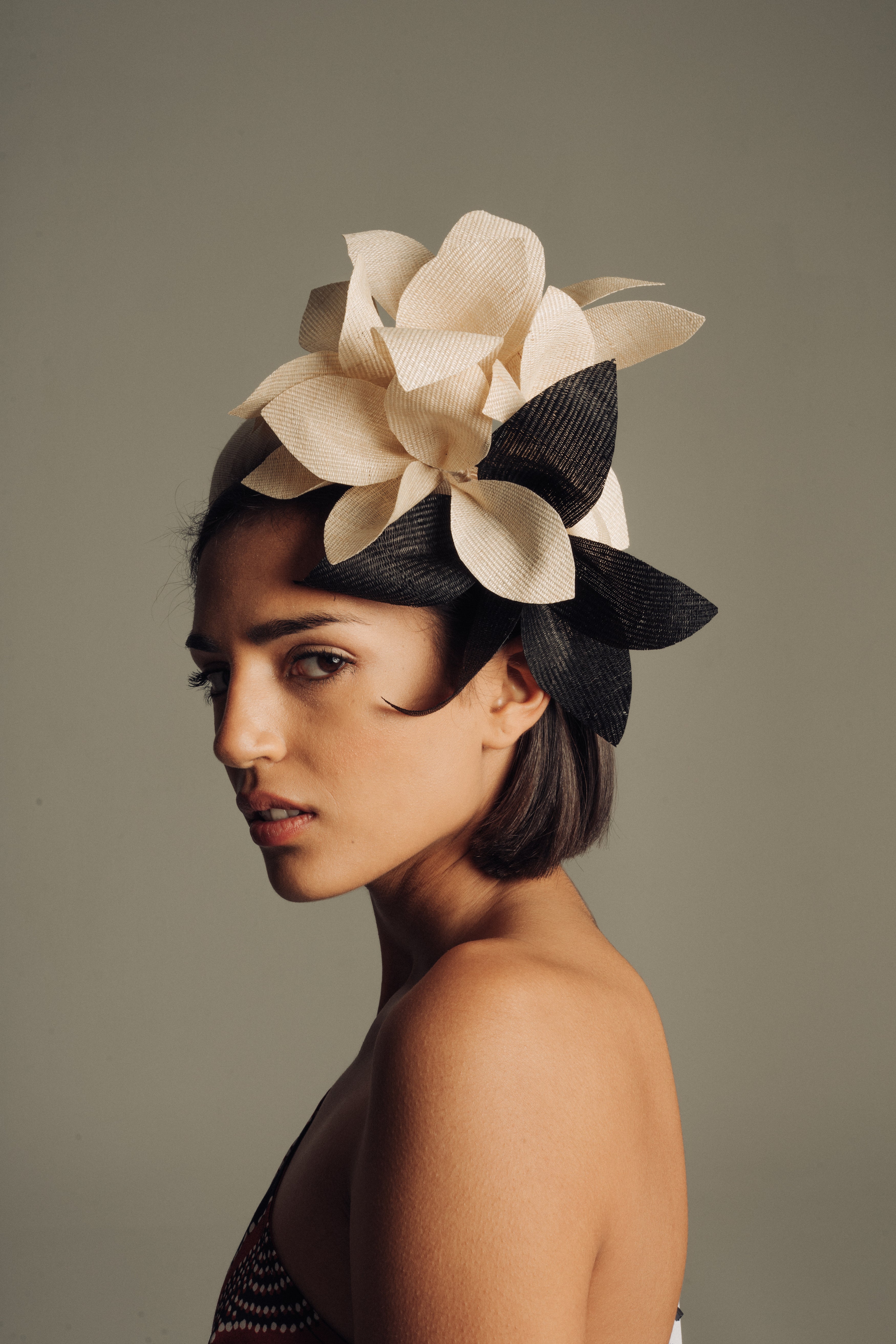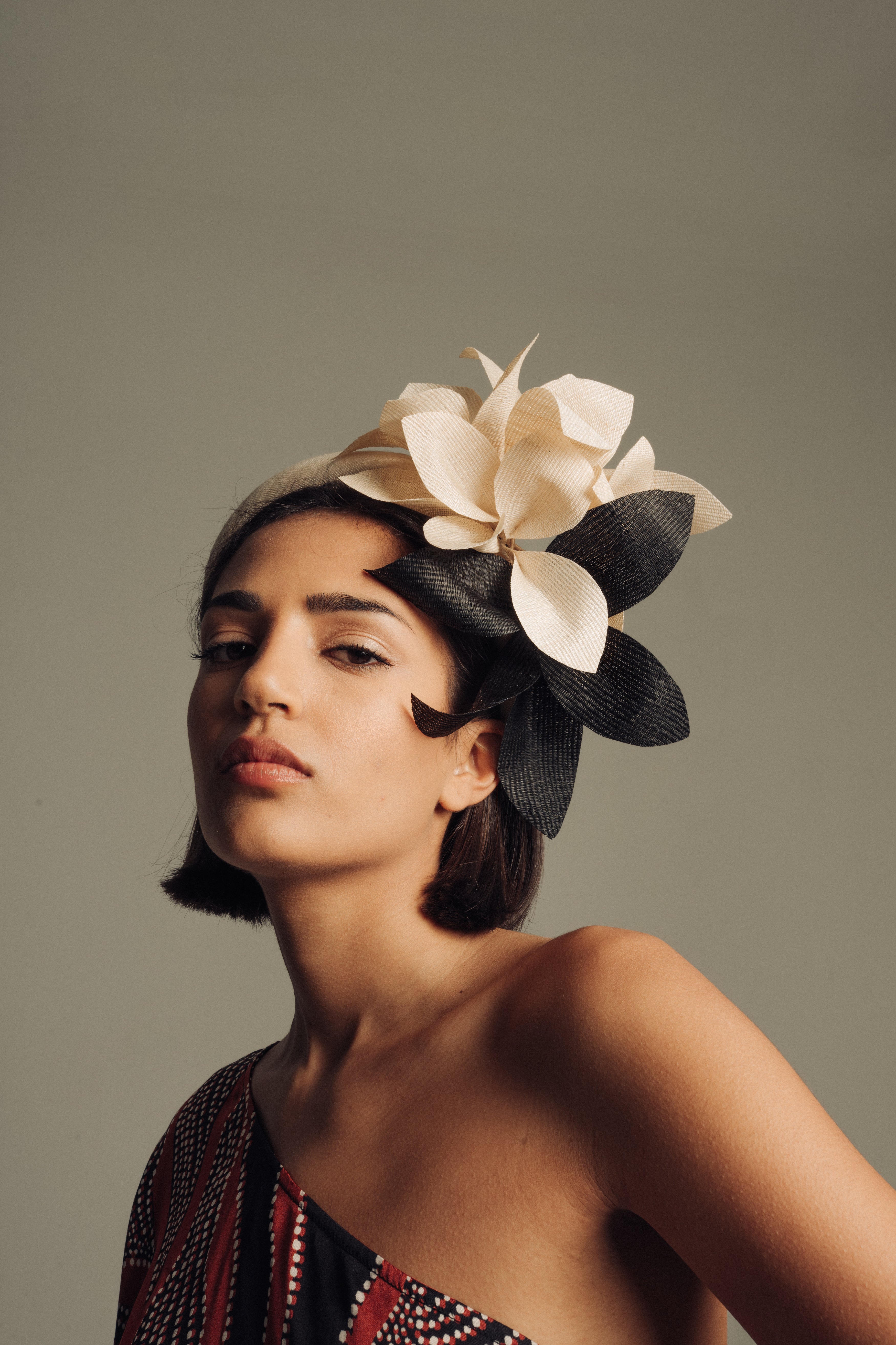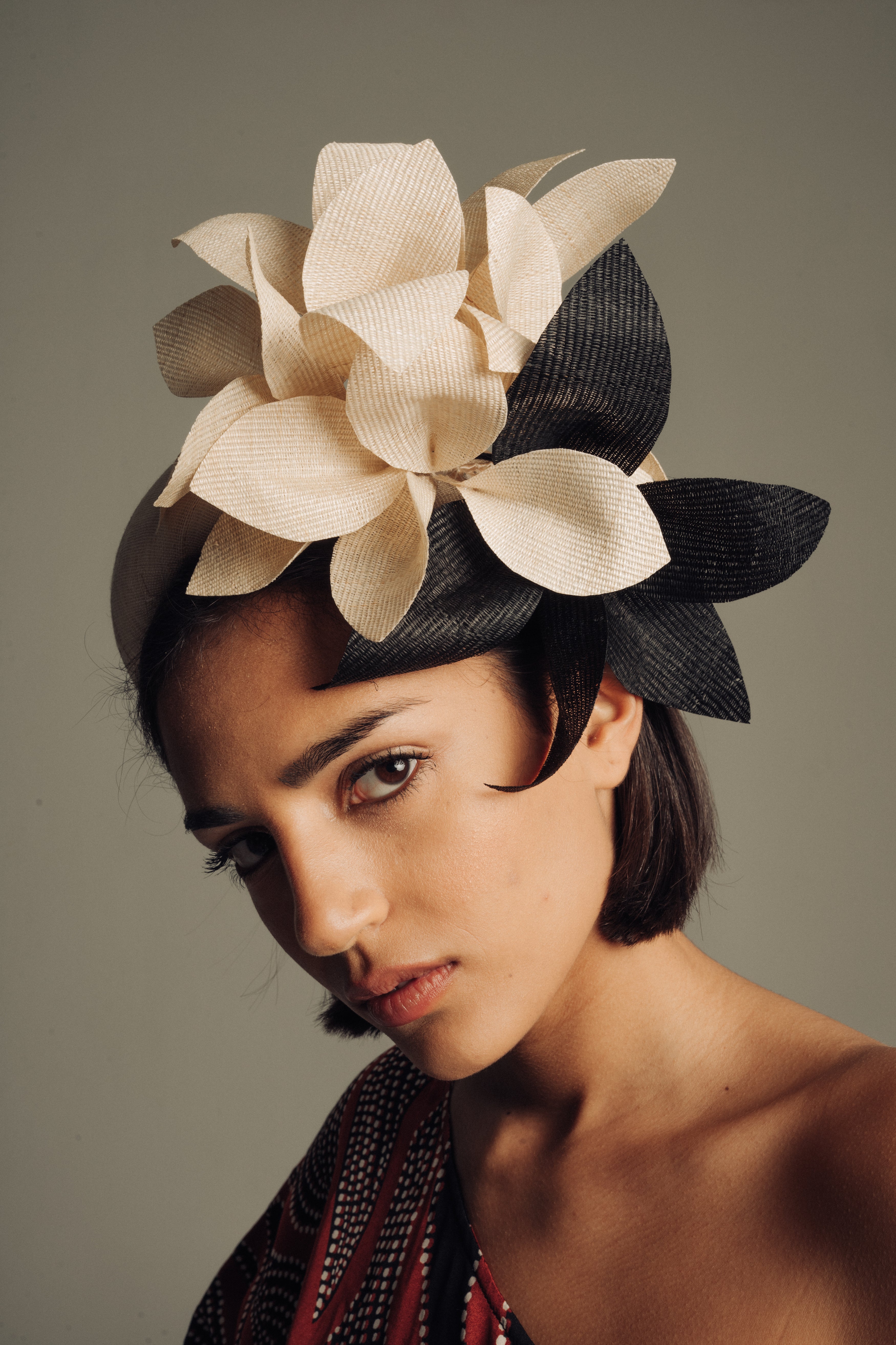 Wide headband lined with cotton raffia with a set of rigid beige and black tinalak flowers.
