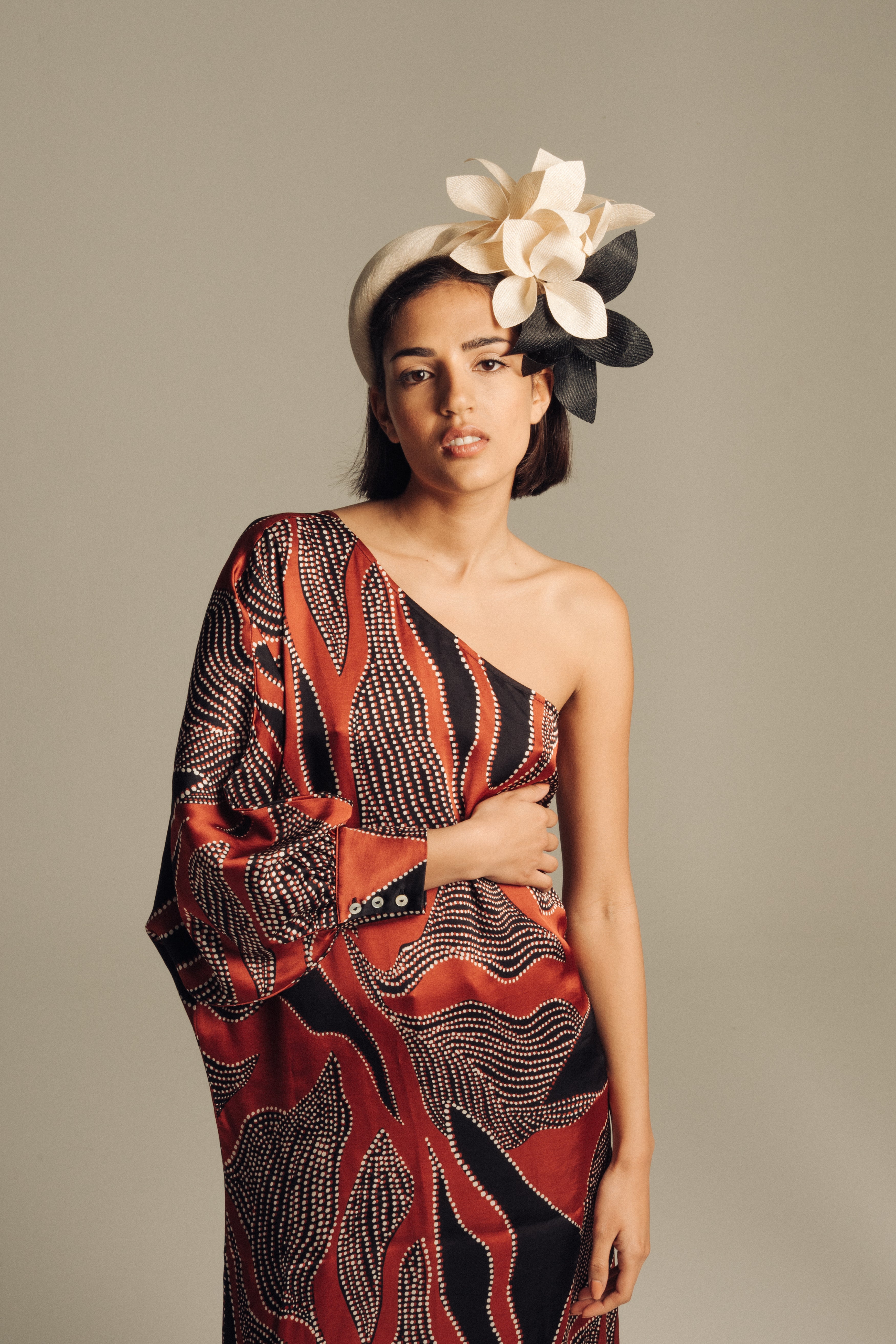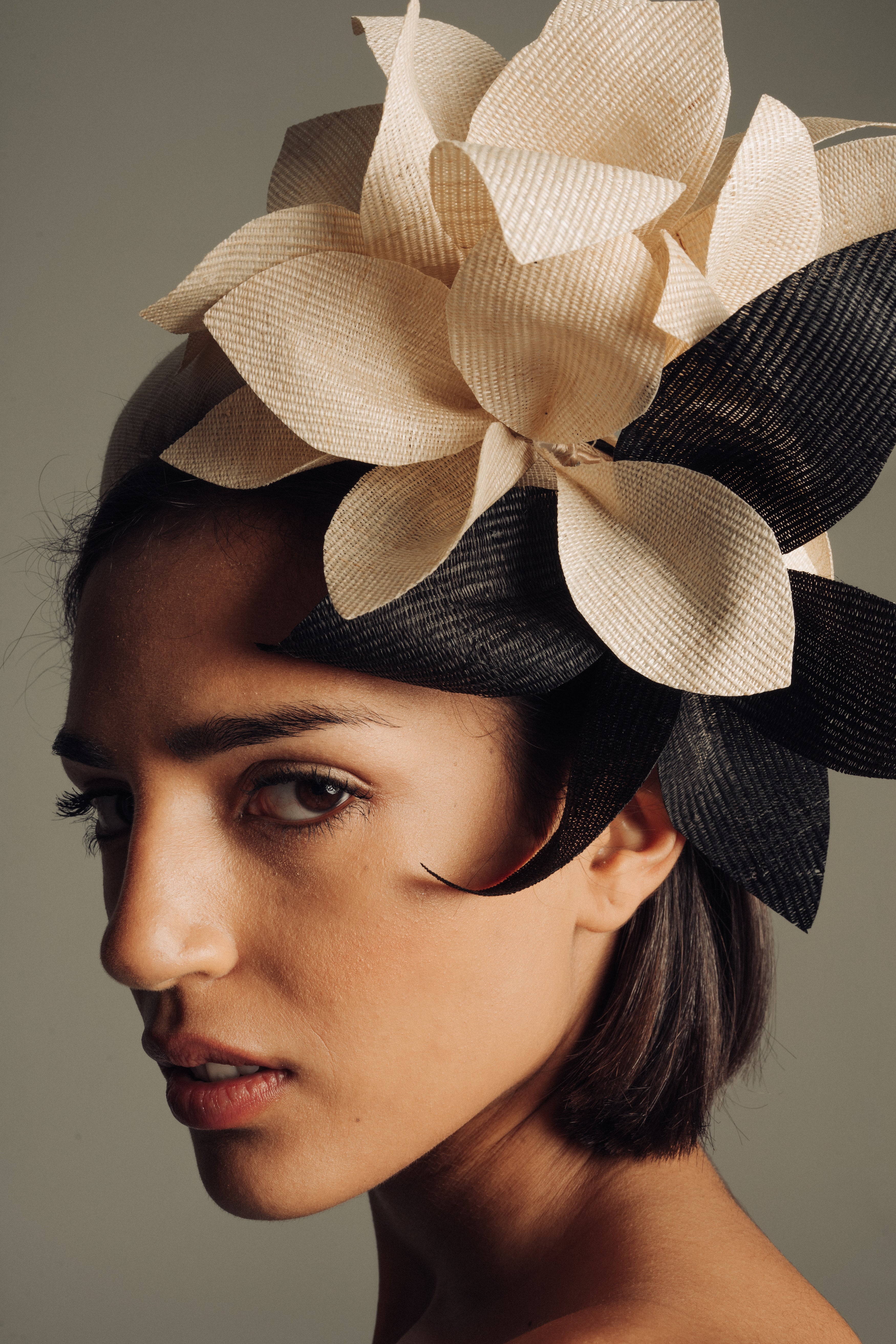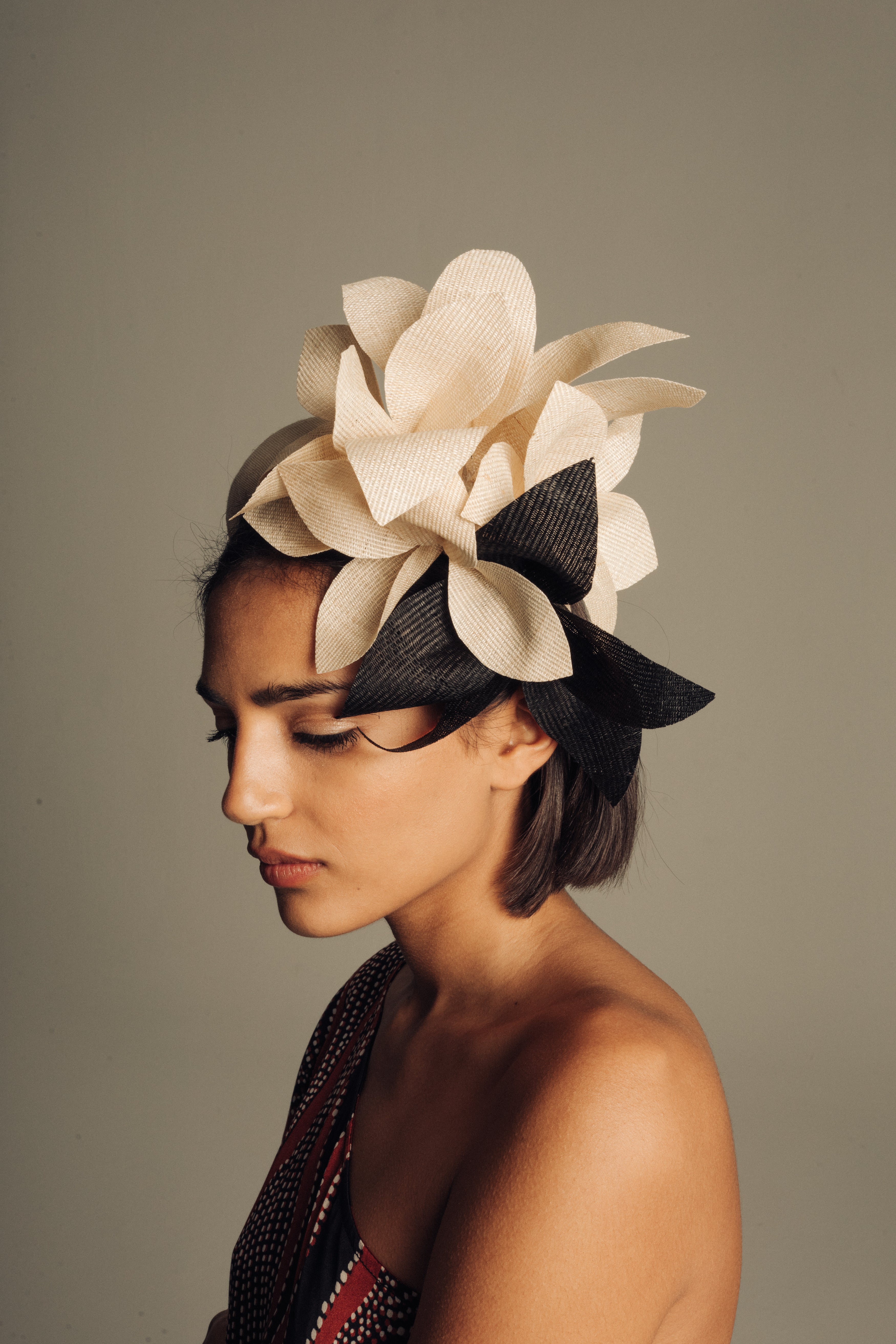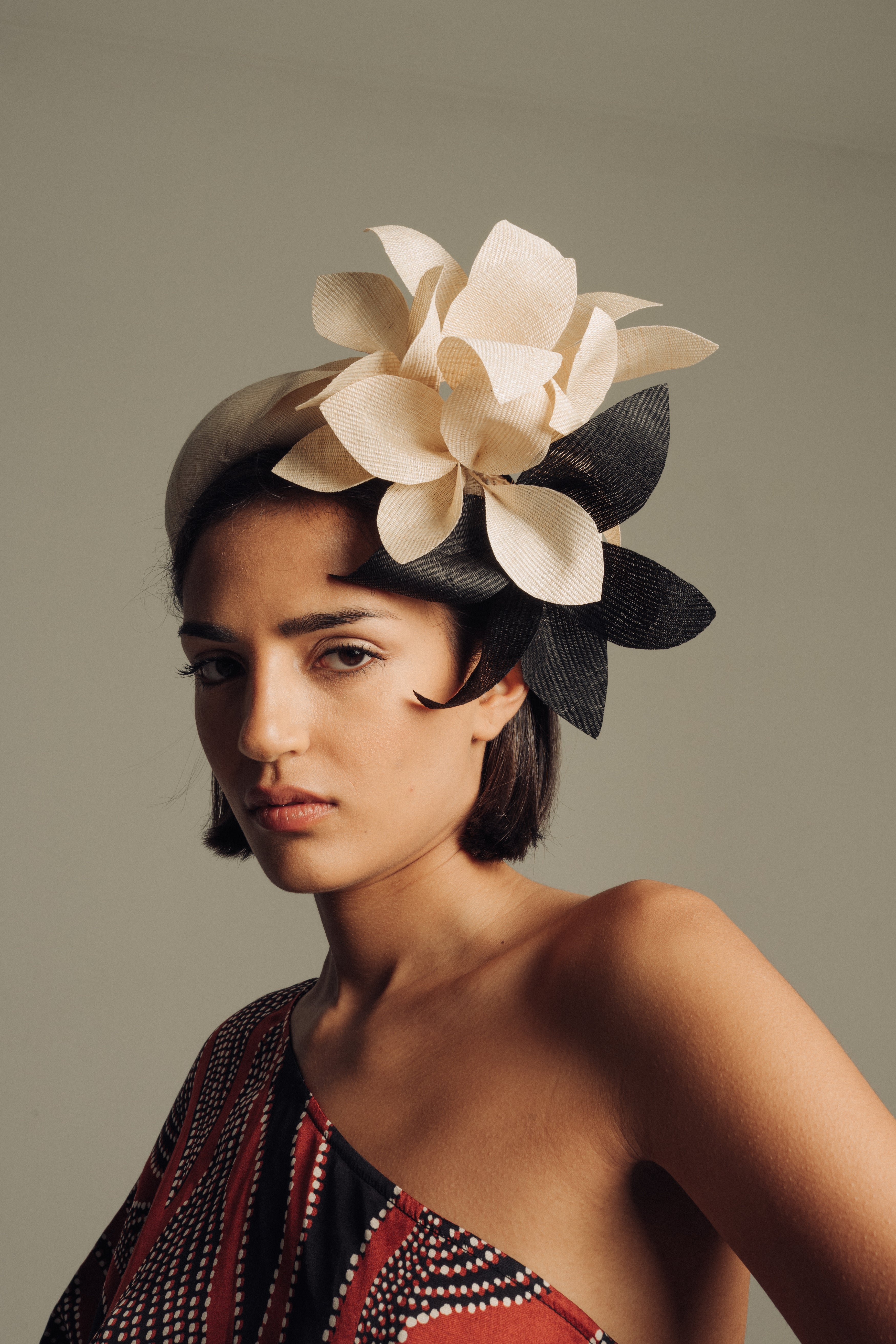 Wide headband lined with cotton raffia with a set of rigid beige and black tinalak flowers.