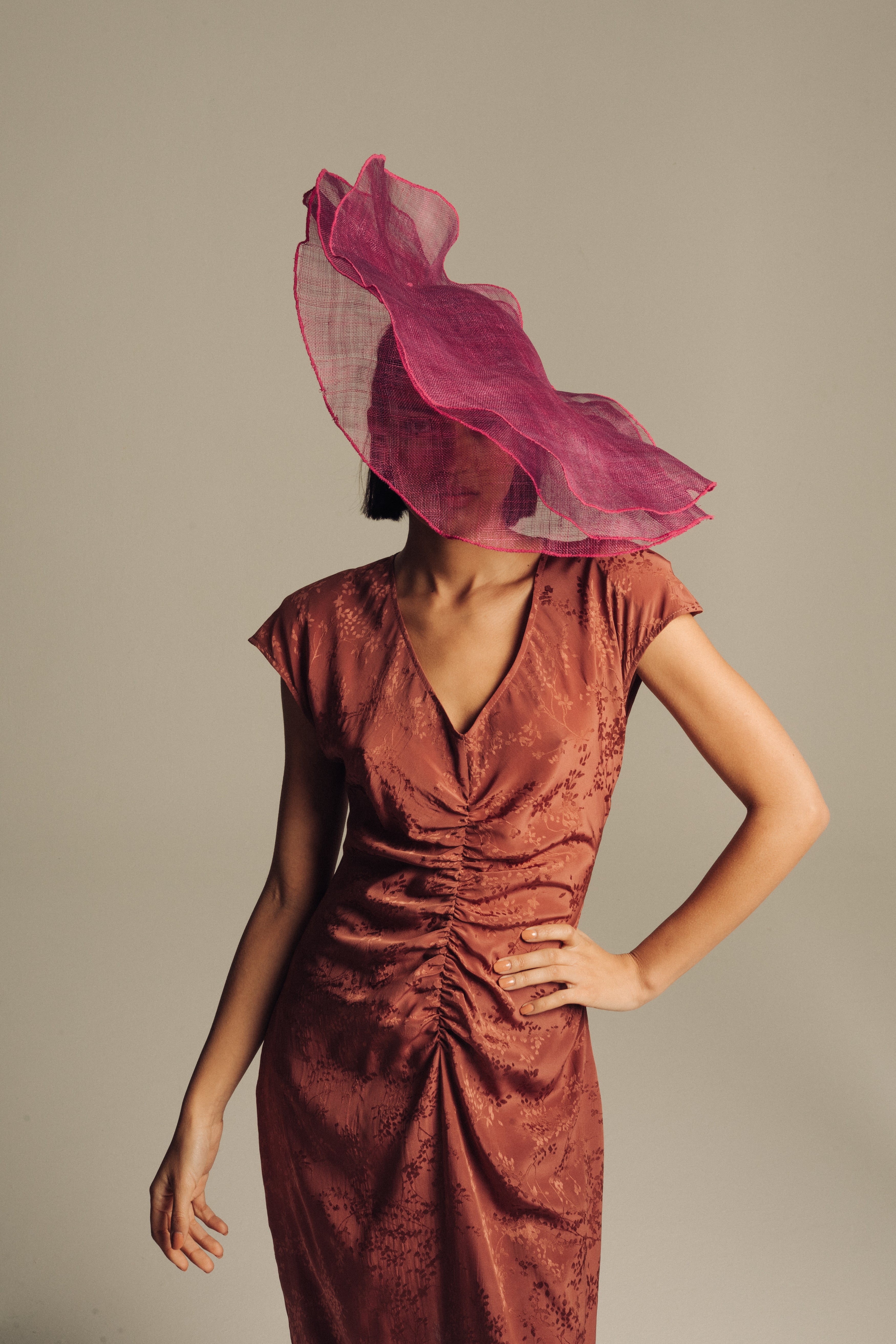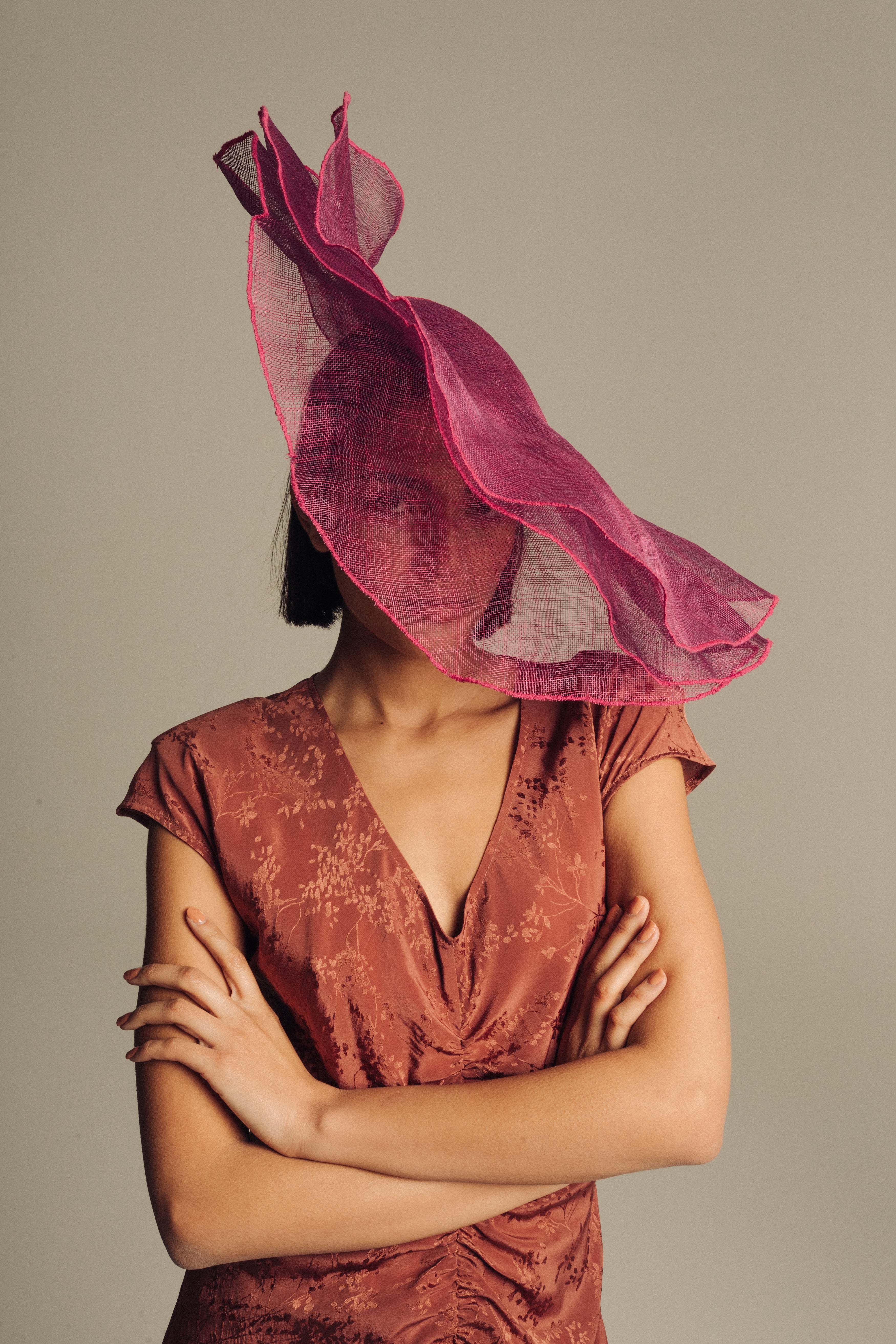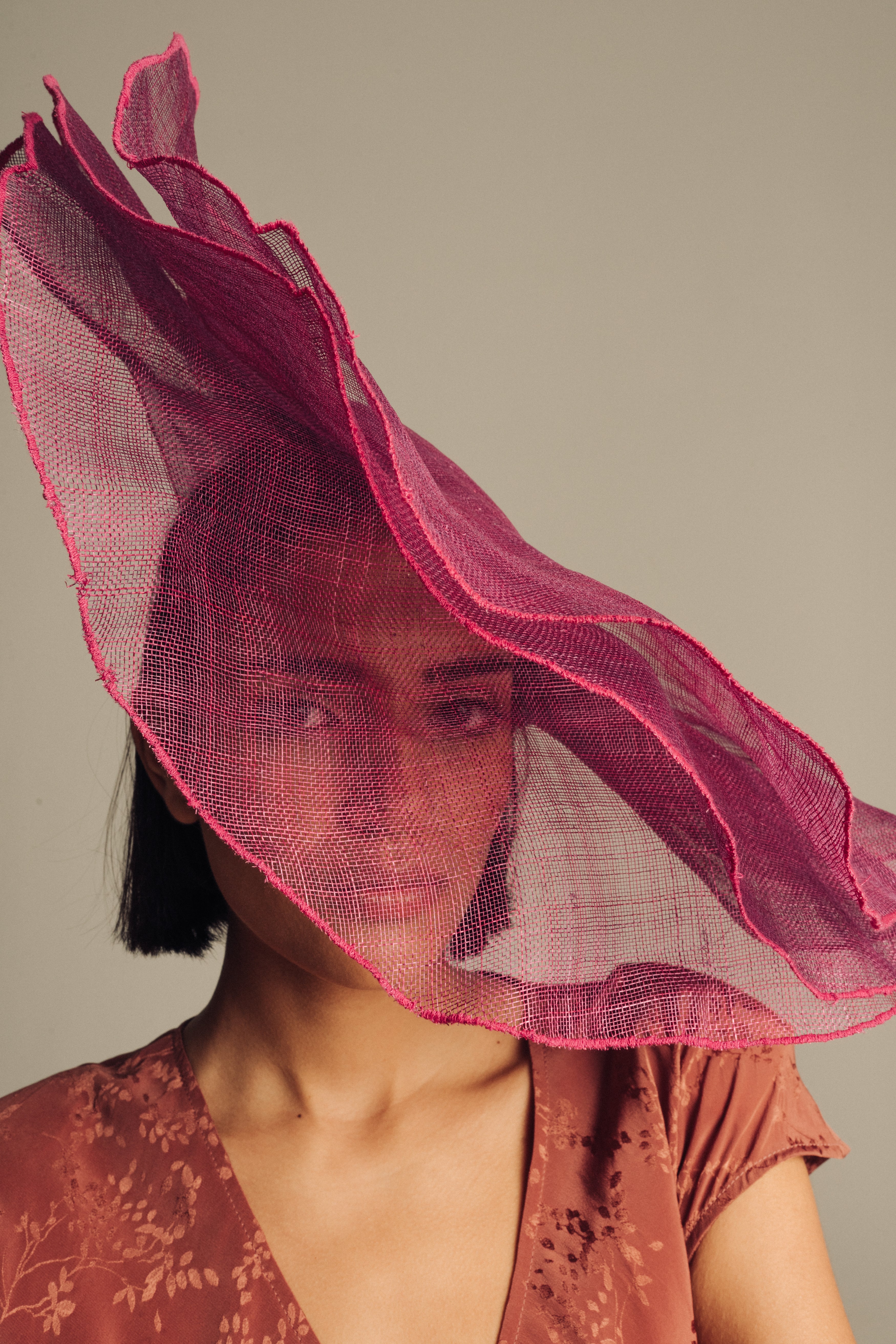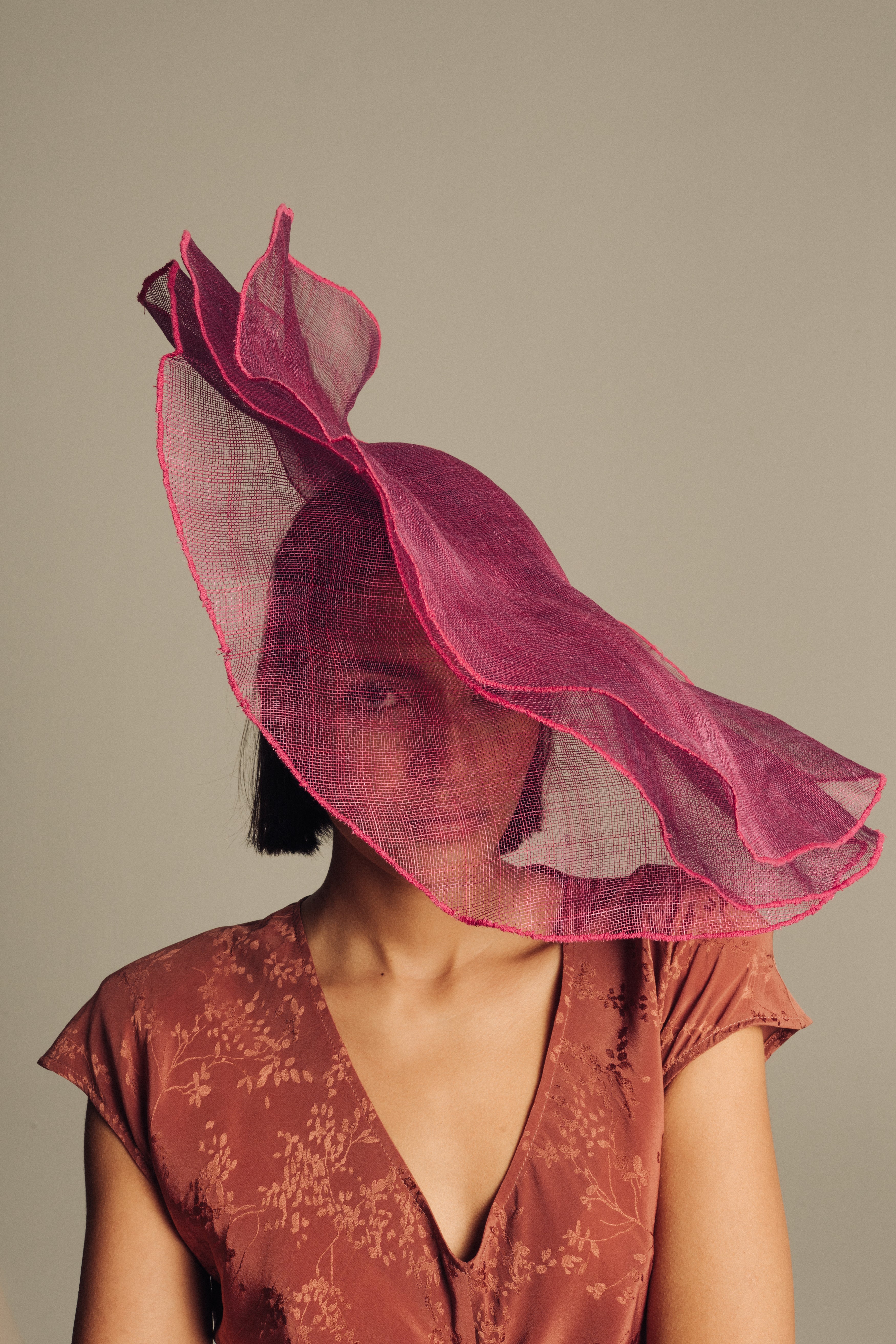 Maxi Dulcinea Bougainvillea made of three wavy layers of sinamay with matching embroidered trim.