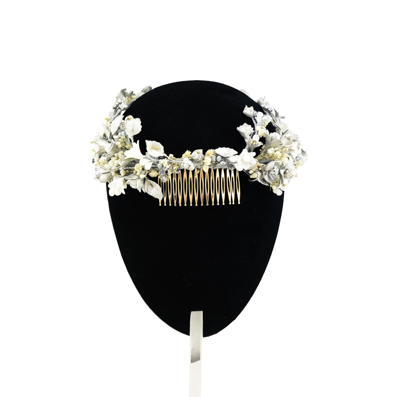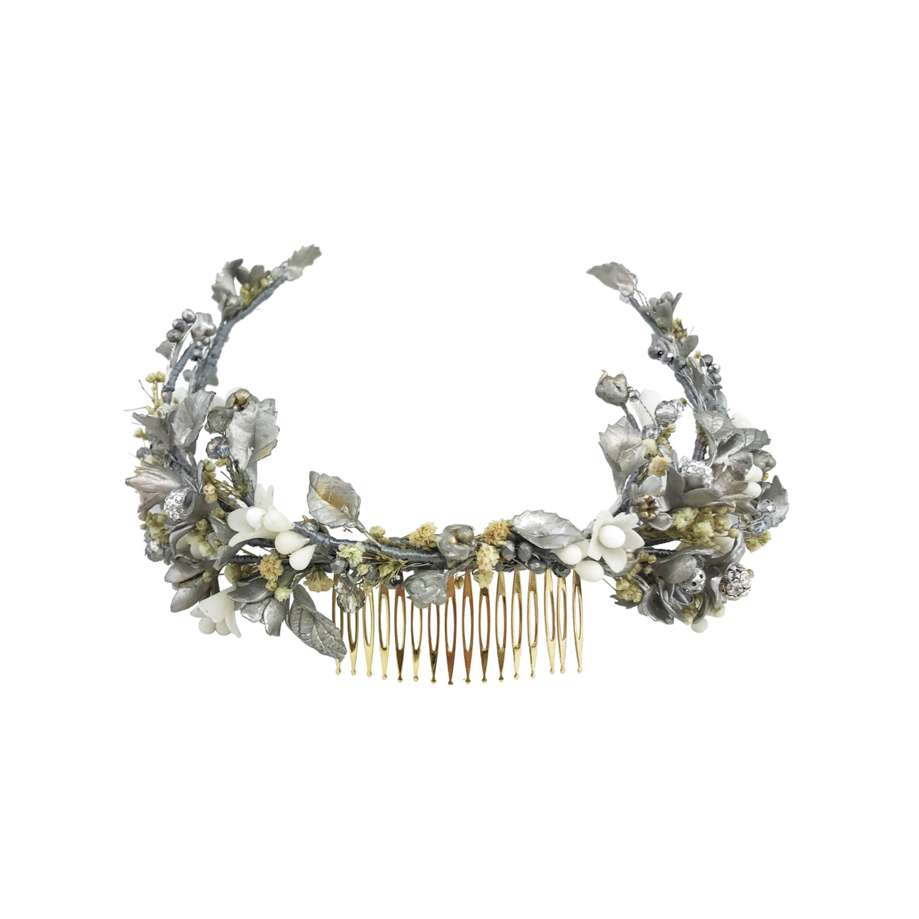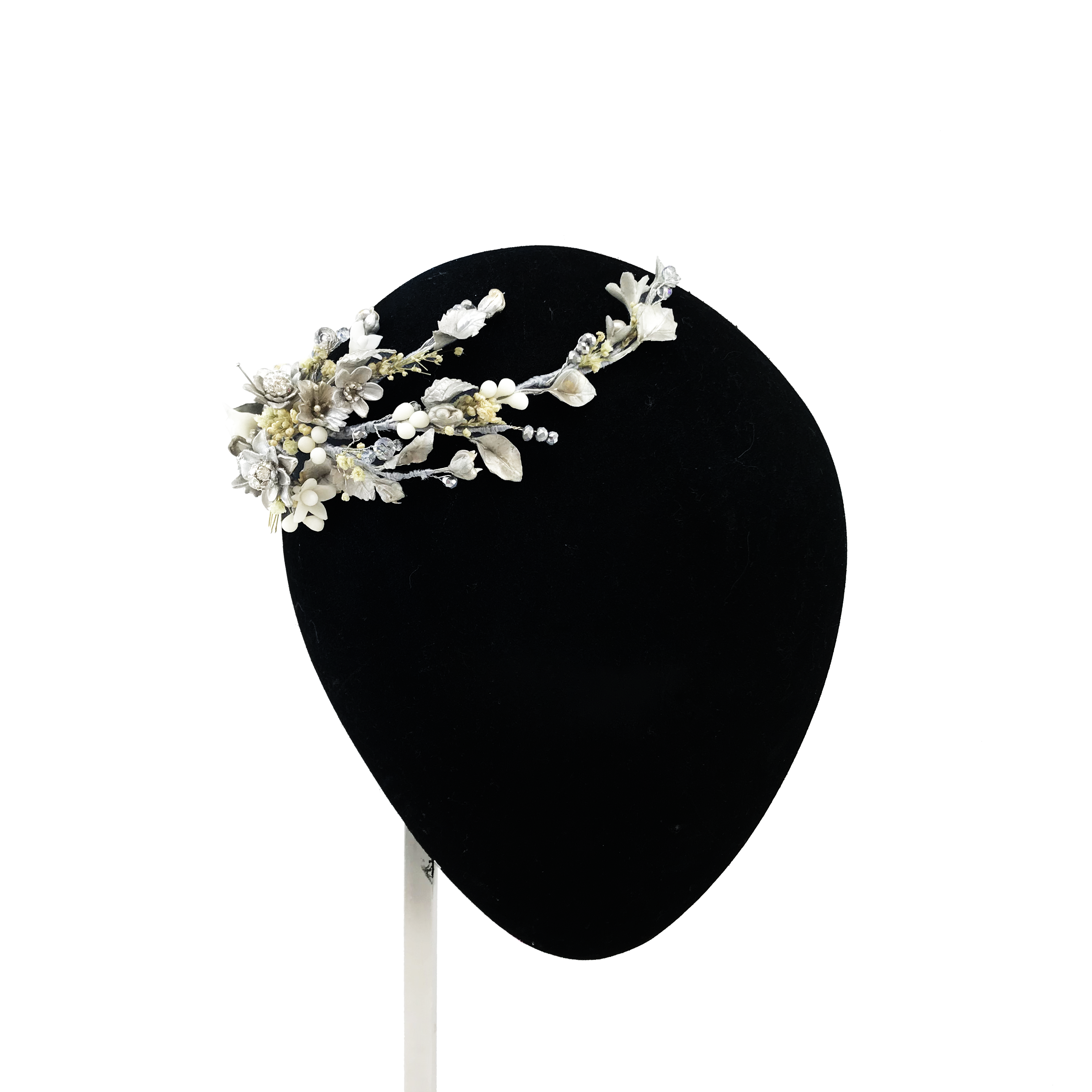 Asymmetrical rear vines of flowers, cold porcelain leaves in silver and raw with crystals and raw gypsophila