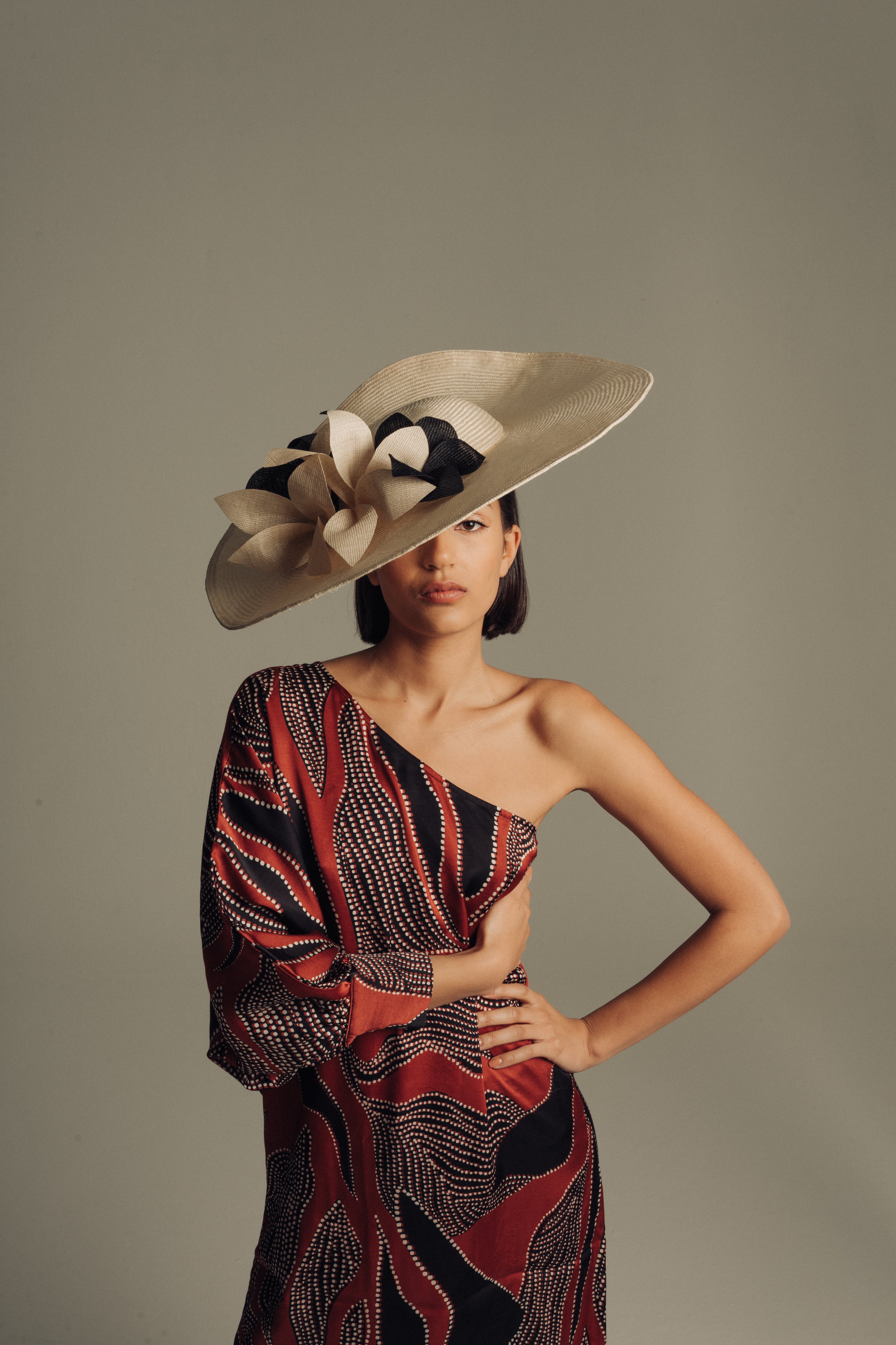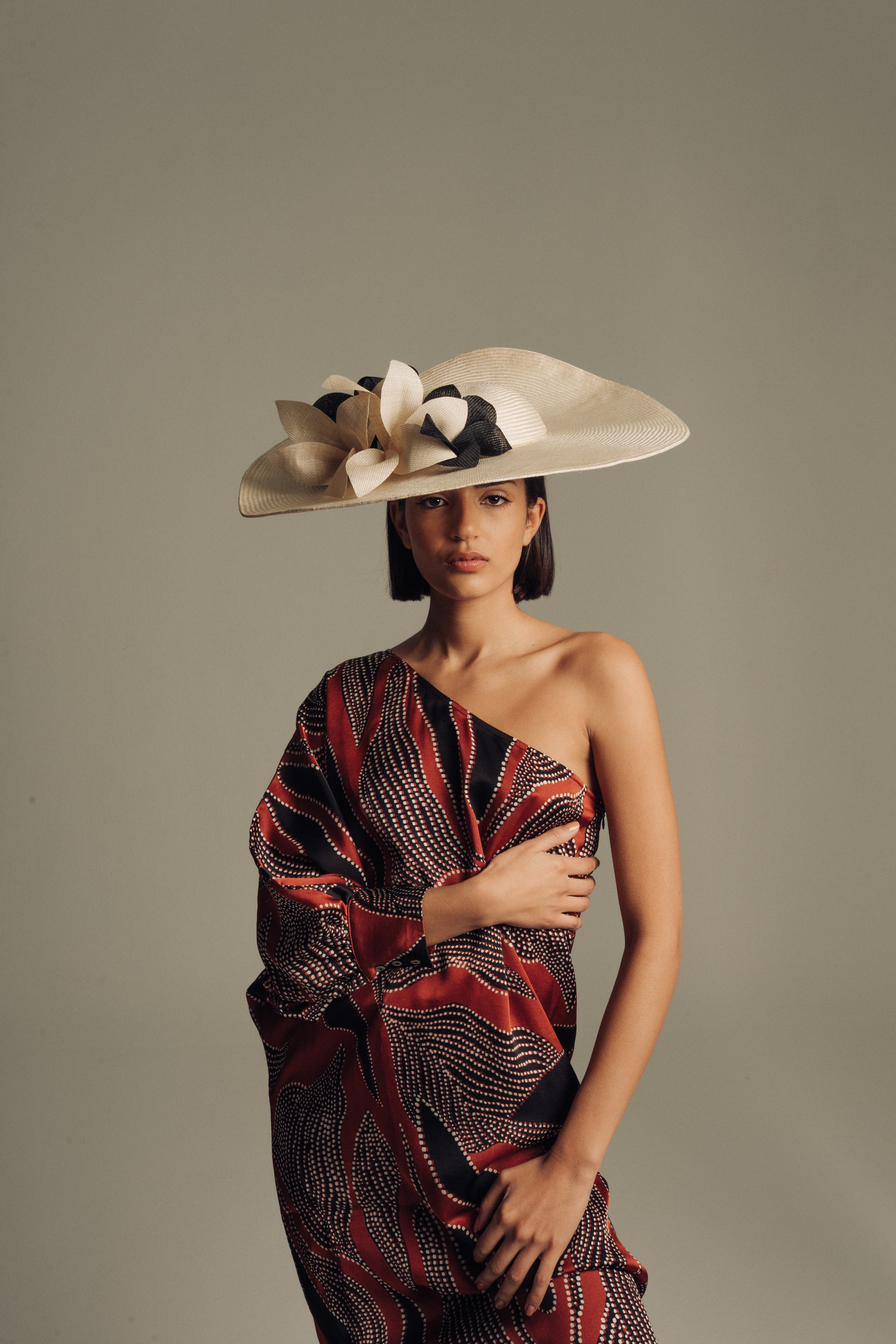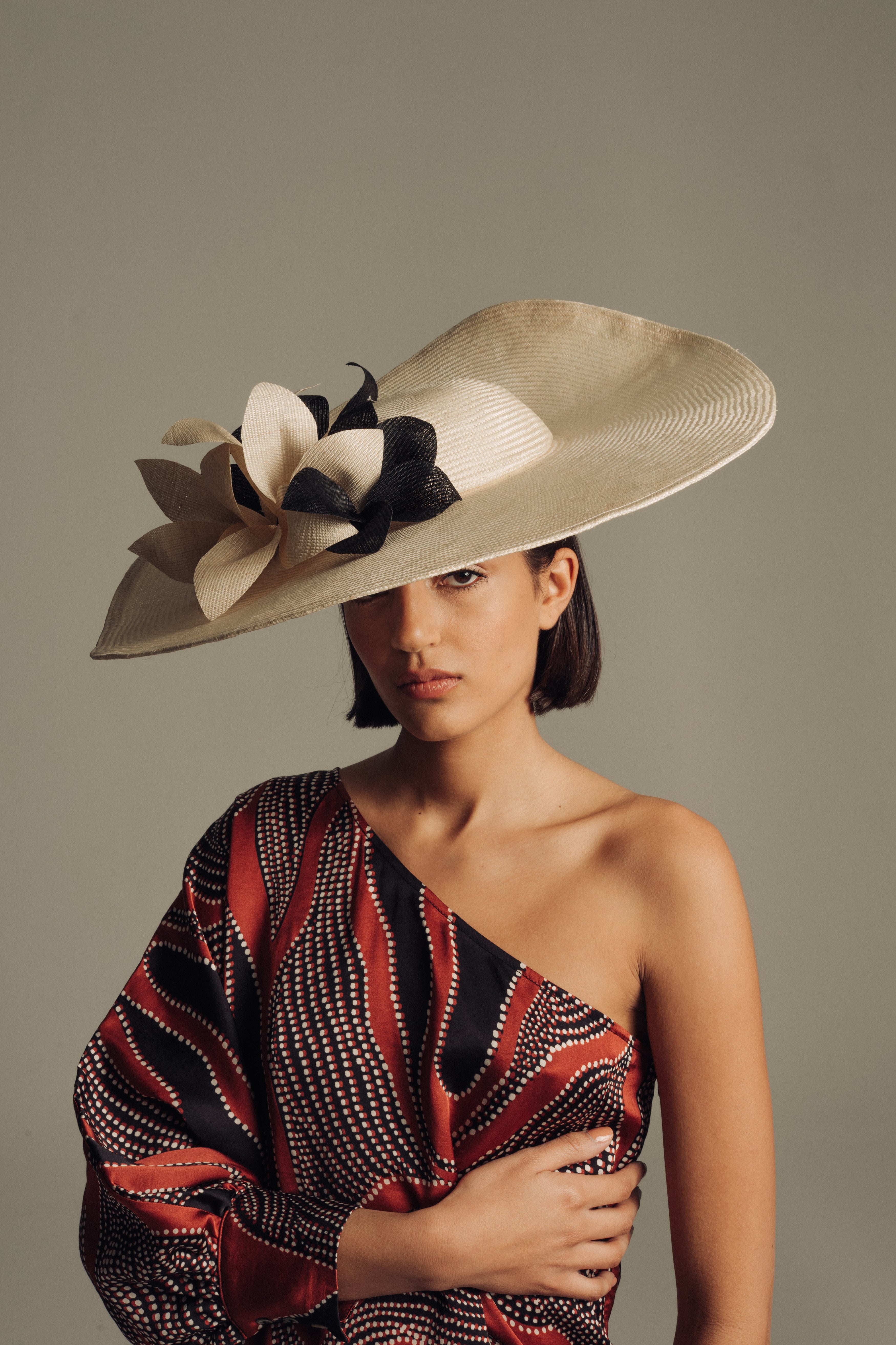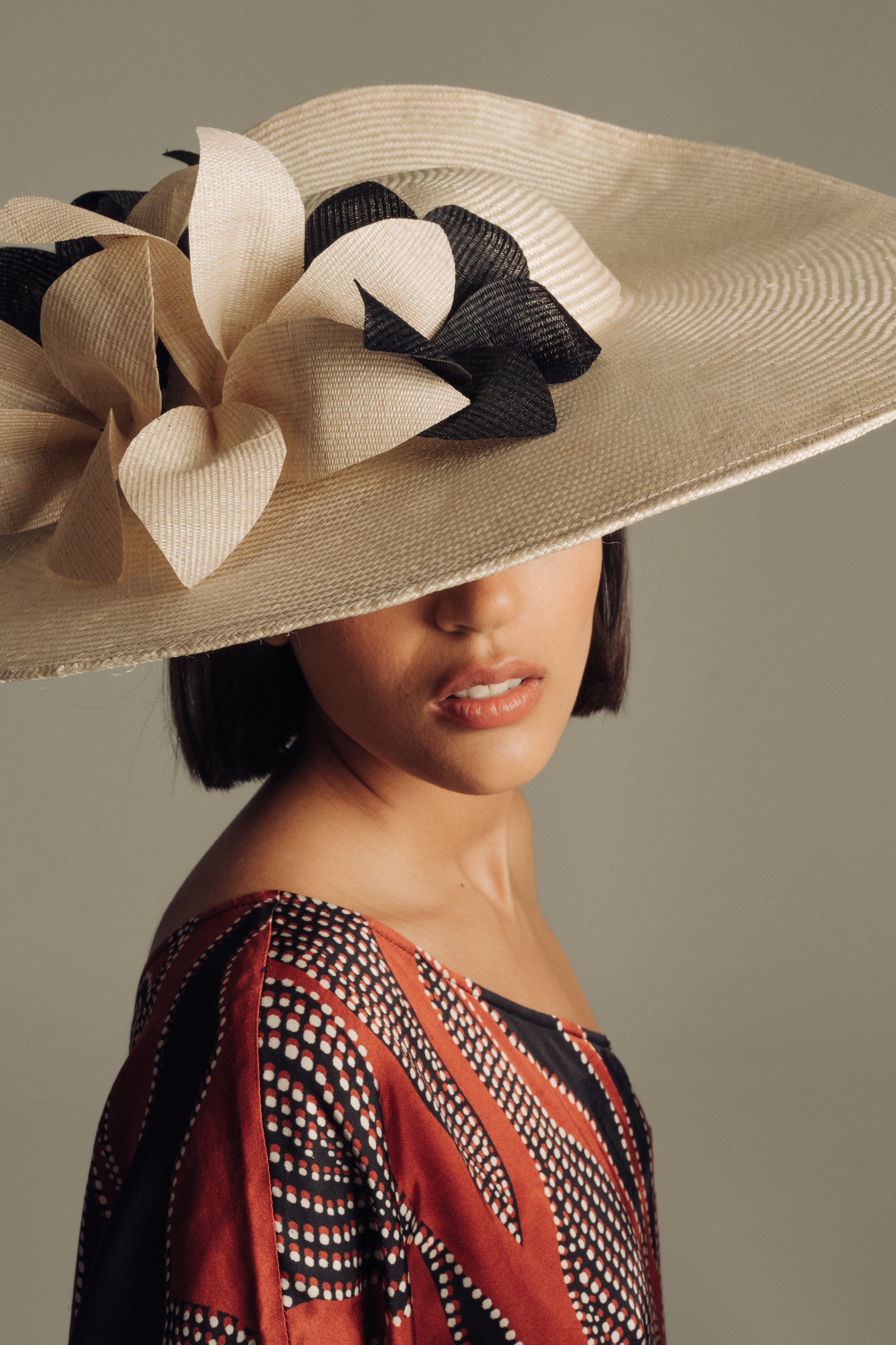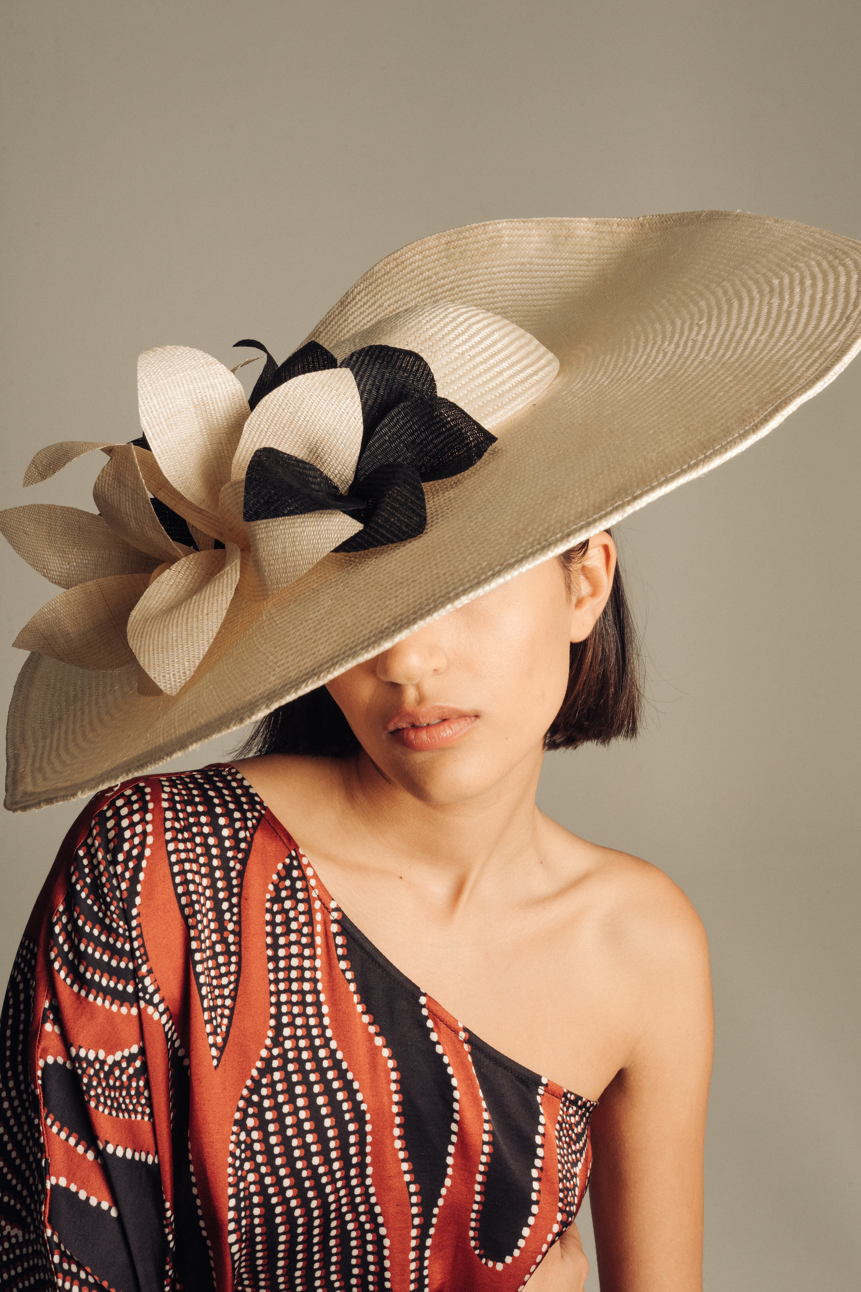 Parasisal hat with a set of rigid beige and black tinalak flowers.