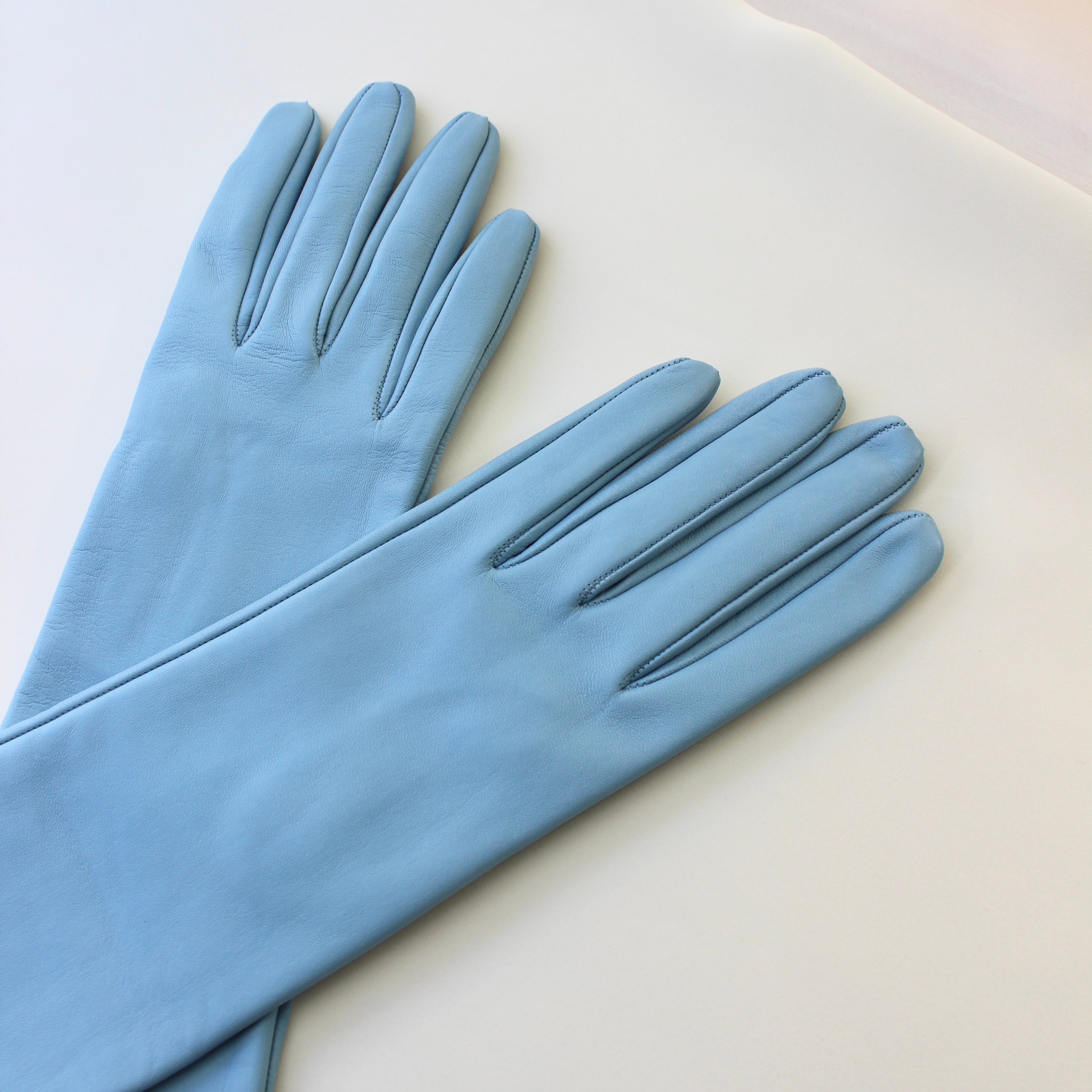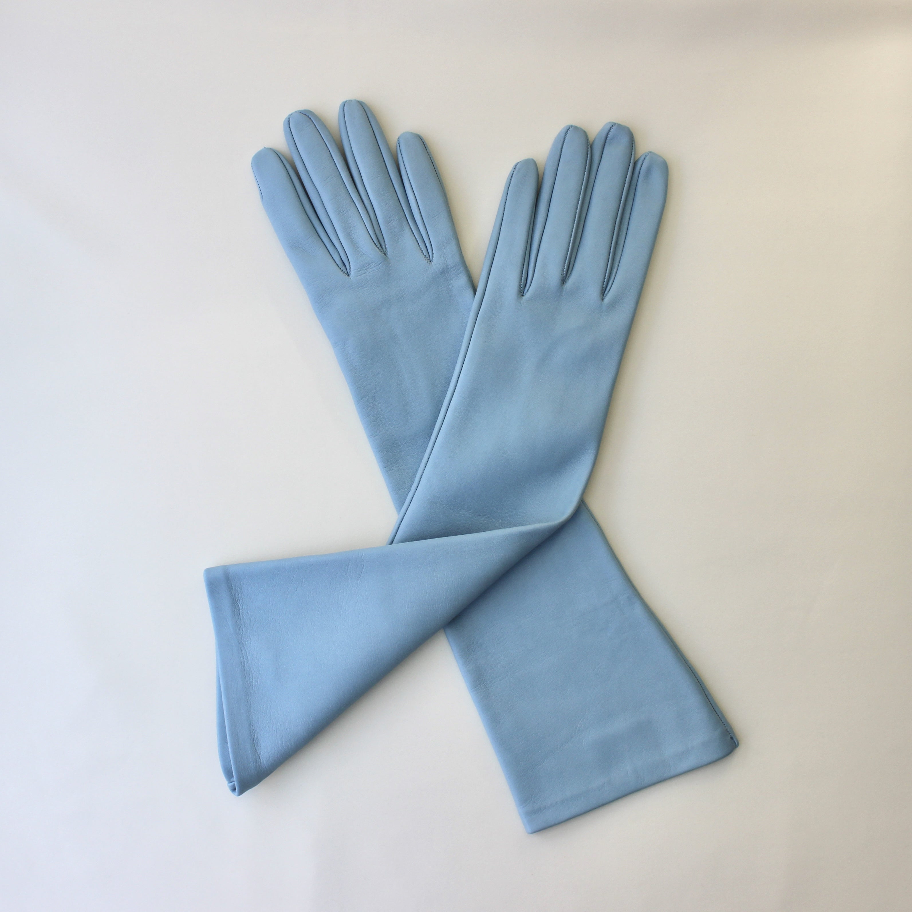 Light blue mid-calf leather gloves