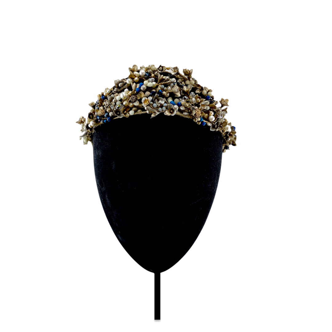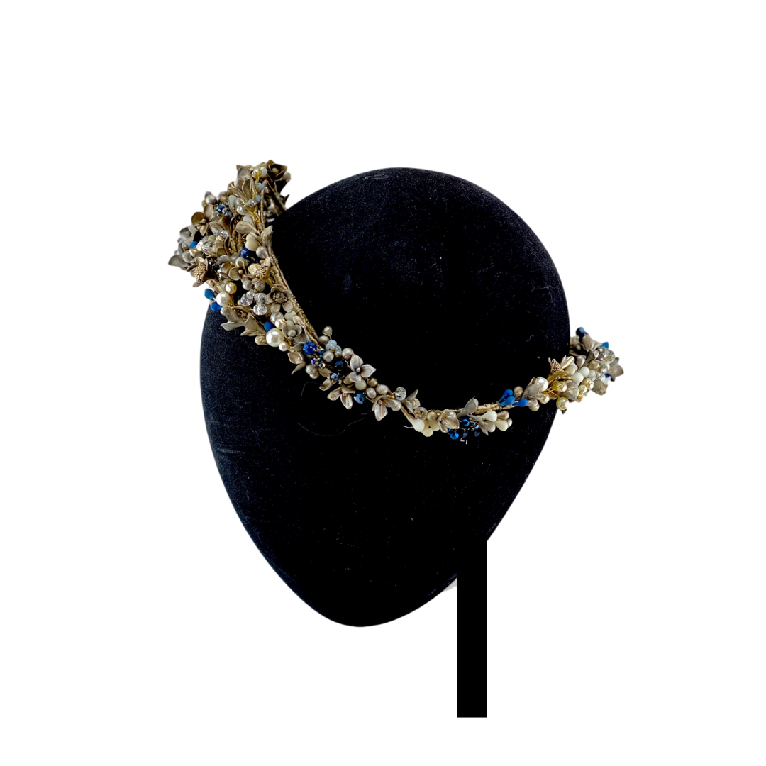 Crown of flowers and pistils in cold champagne, blue and ecru porcelain with blue crystals
