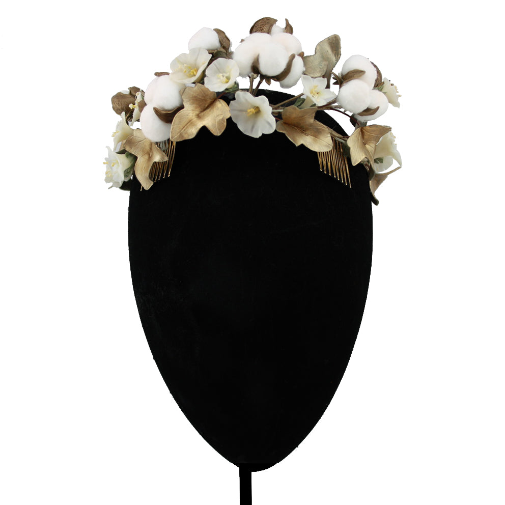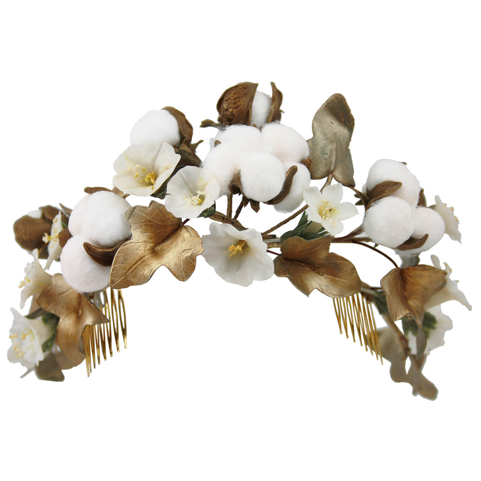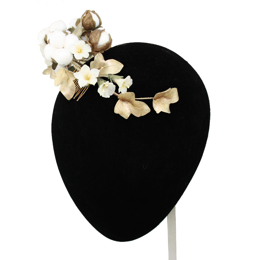 Comb with natural cotton flowers, gold porcelain leaves and raw flowers.