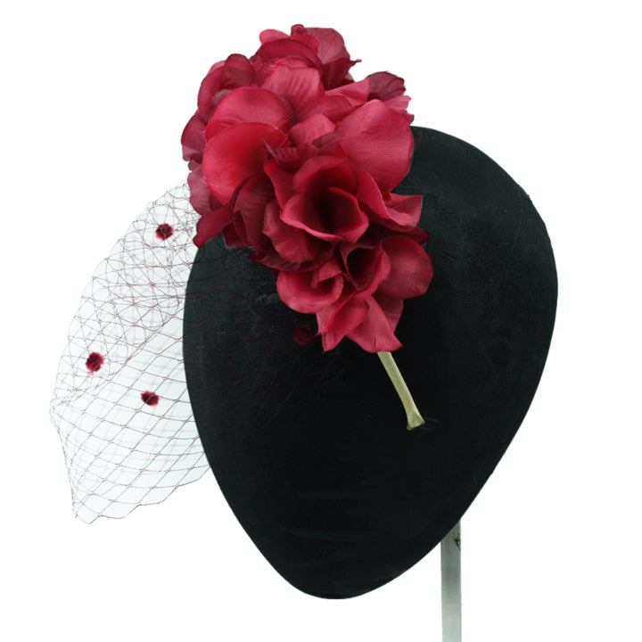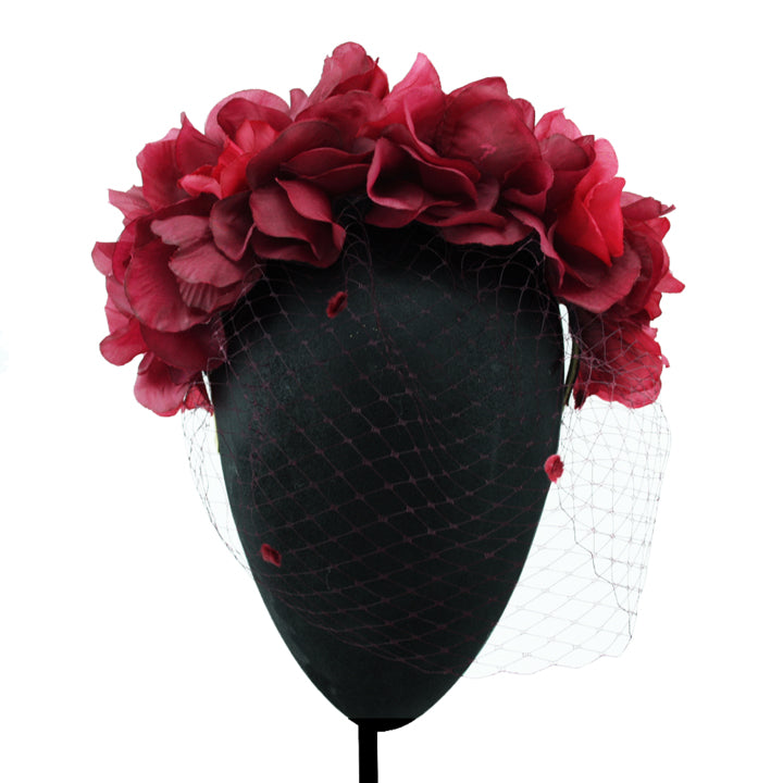 Burgundy chiffon flower headband with burgundy tulle on the face.