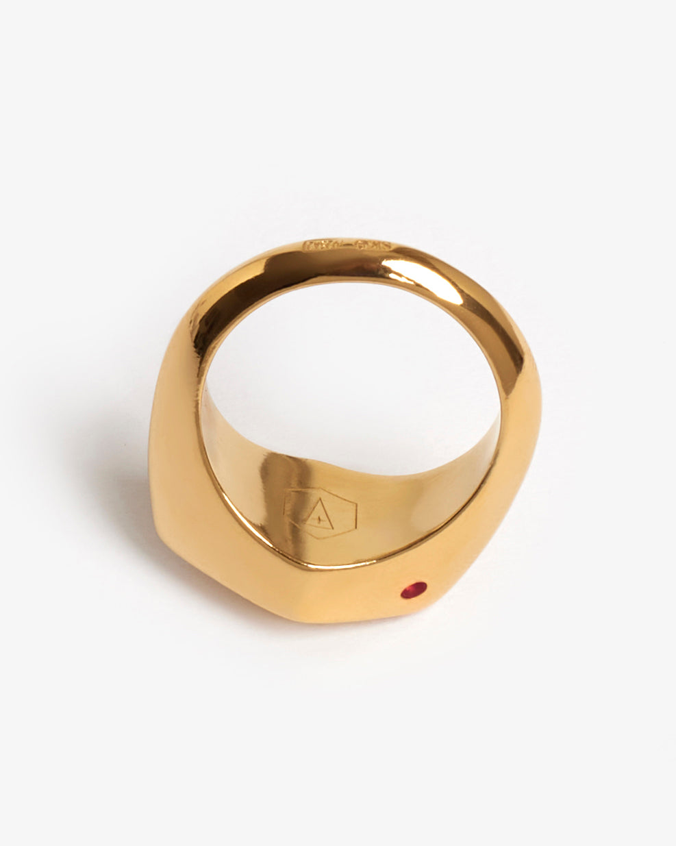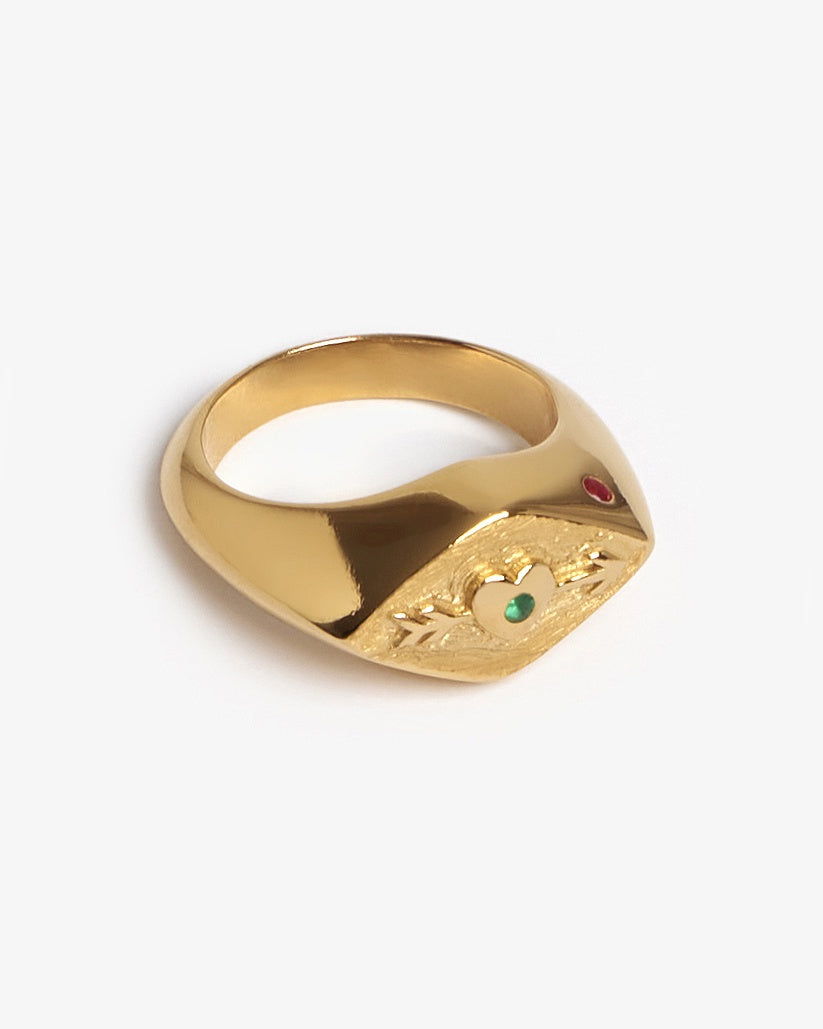 The YOU ring with its rhomboid shape and an arrow piercing the heart horizontally , with green central zirconia and Fuchsia-coloured zircons on the sides, this is an ideal jewel for strong women who value loyalty to themselves as a priority.