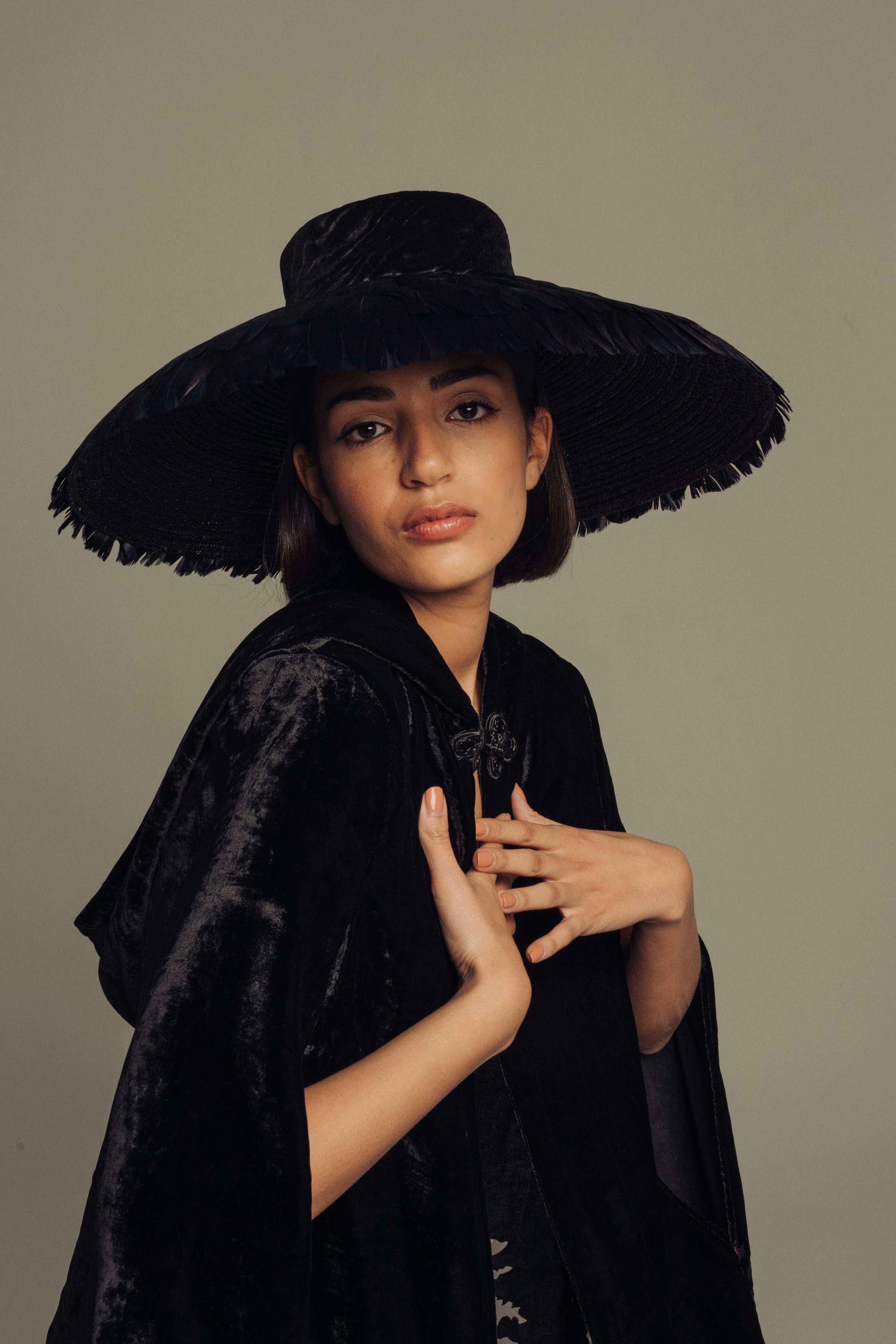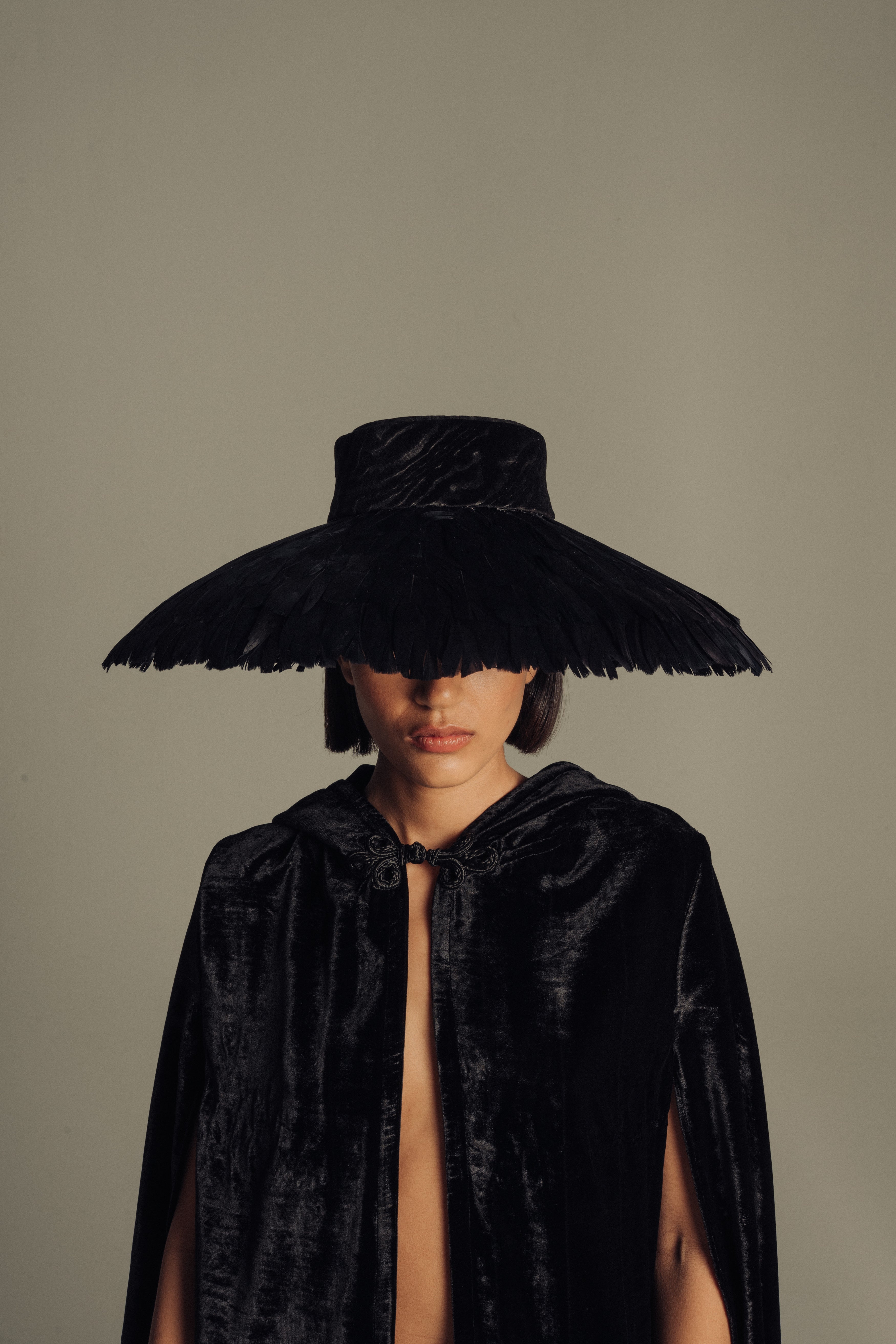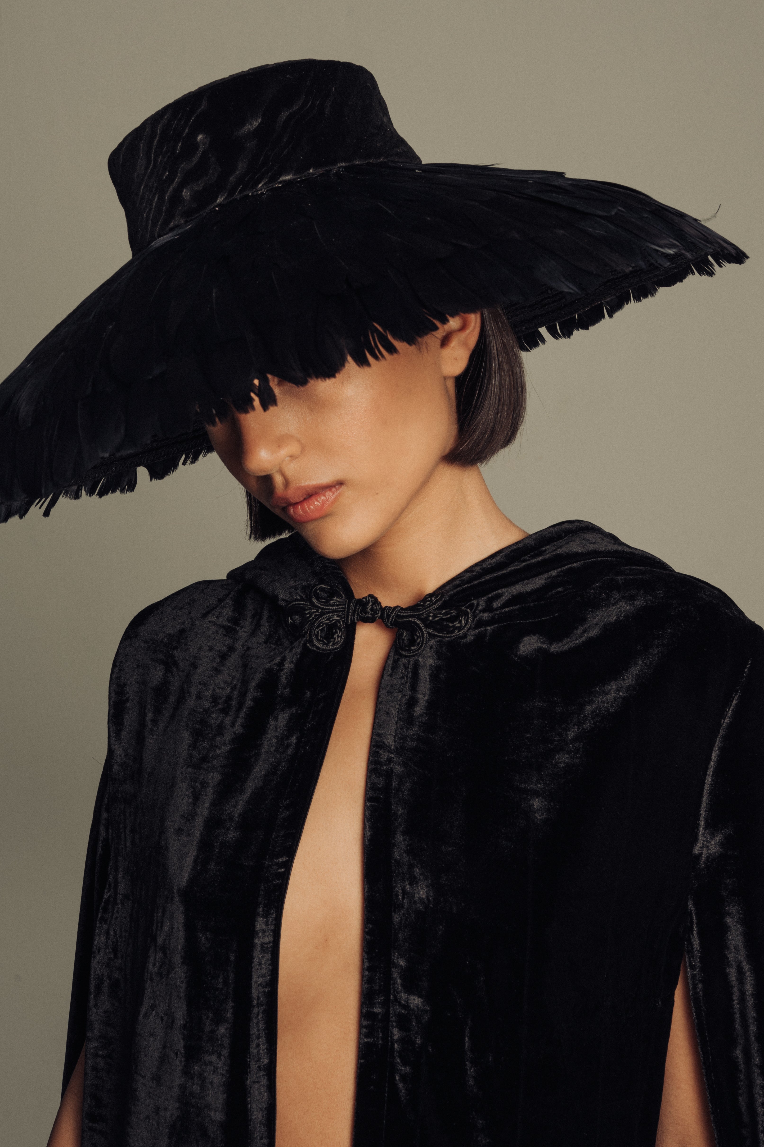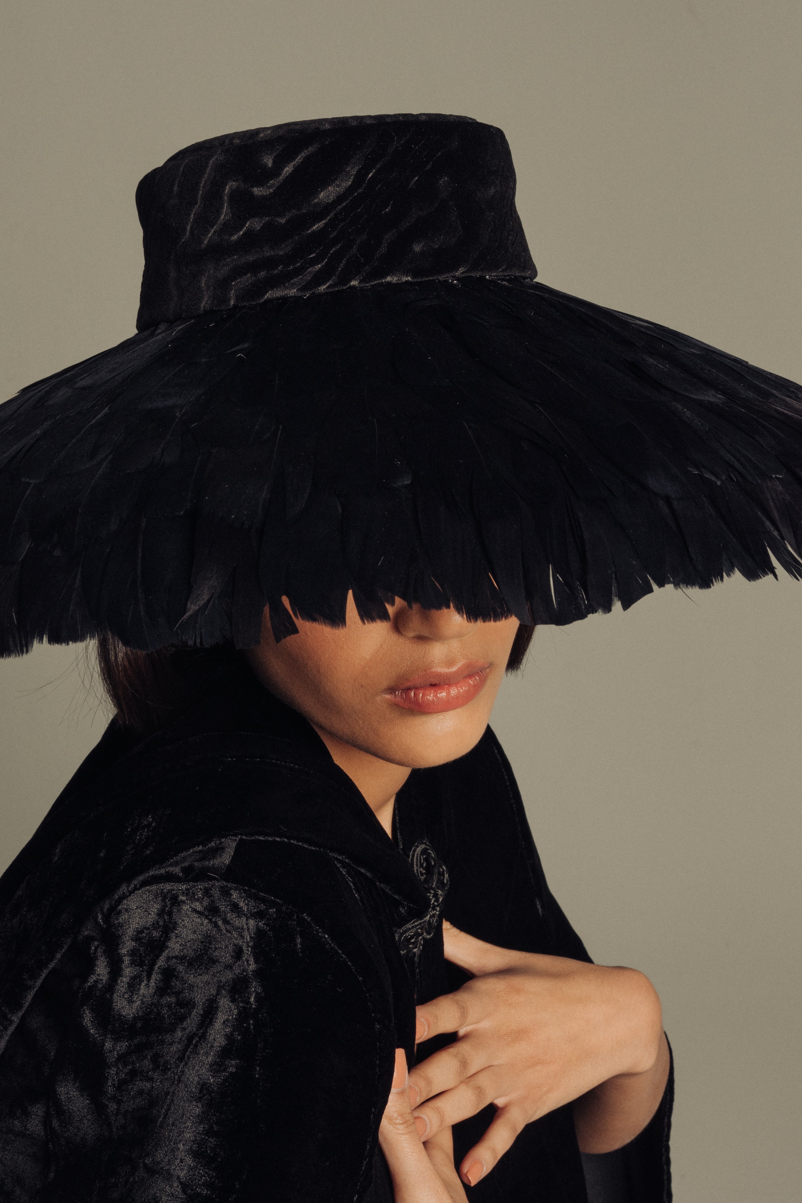 Pamela with flared brim of black feathers and crown lined in matching velvet moire.