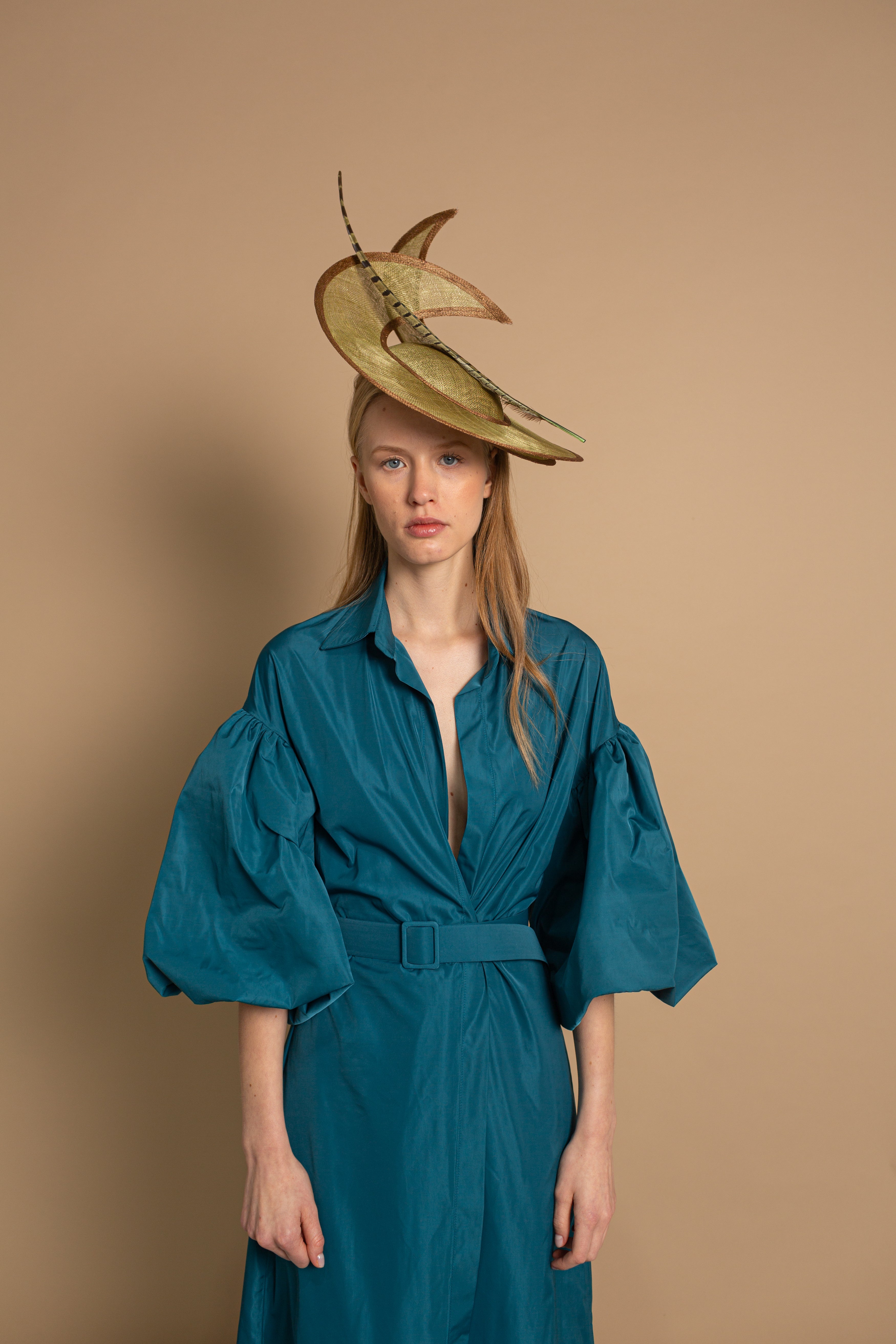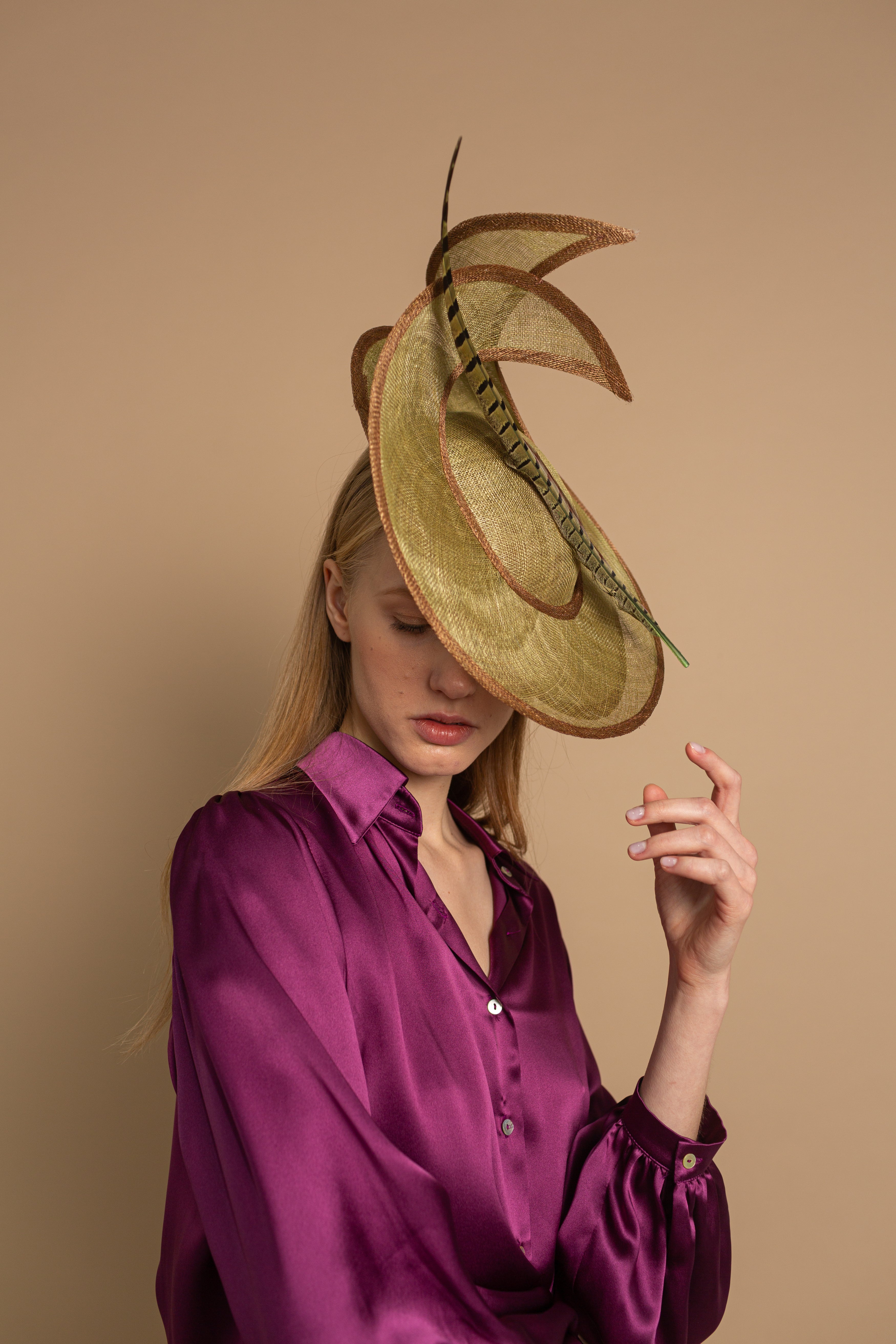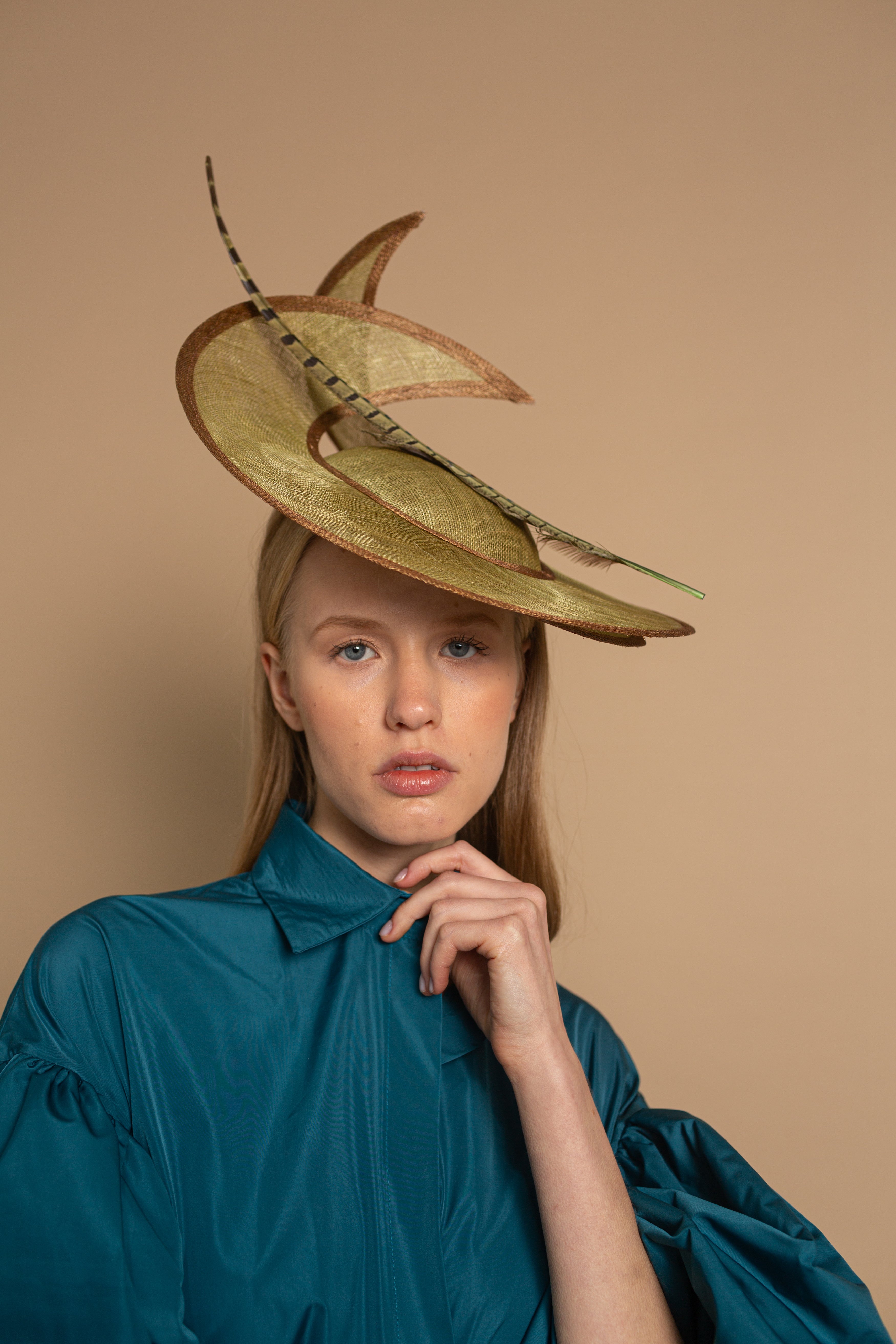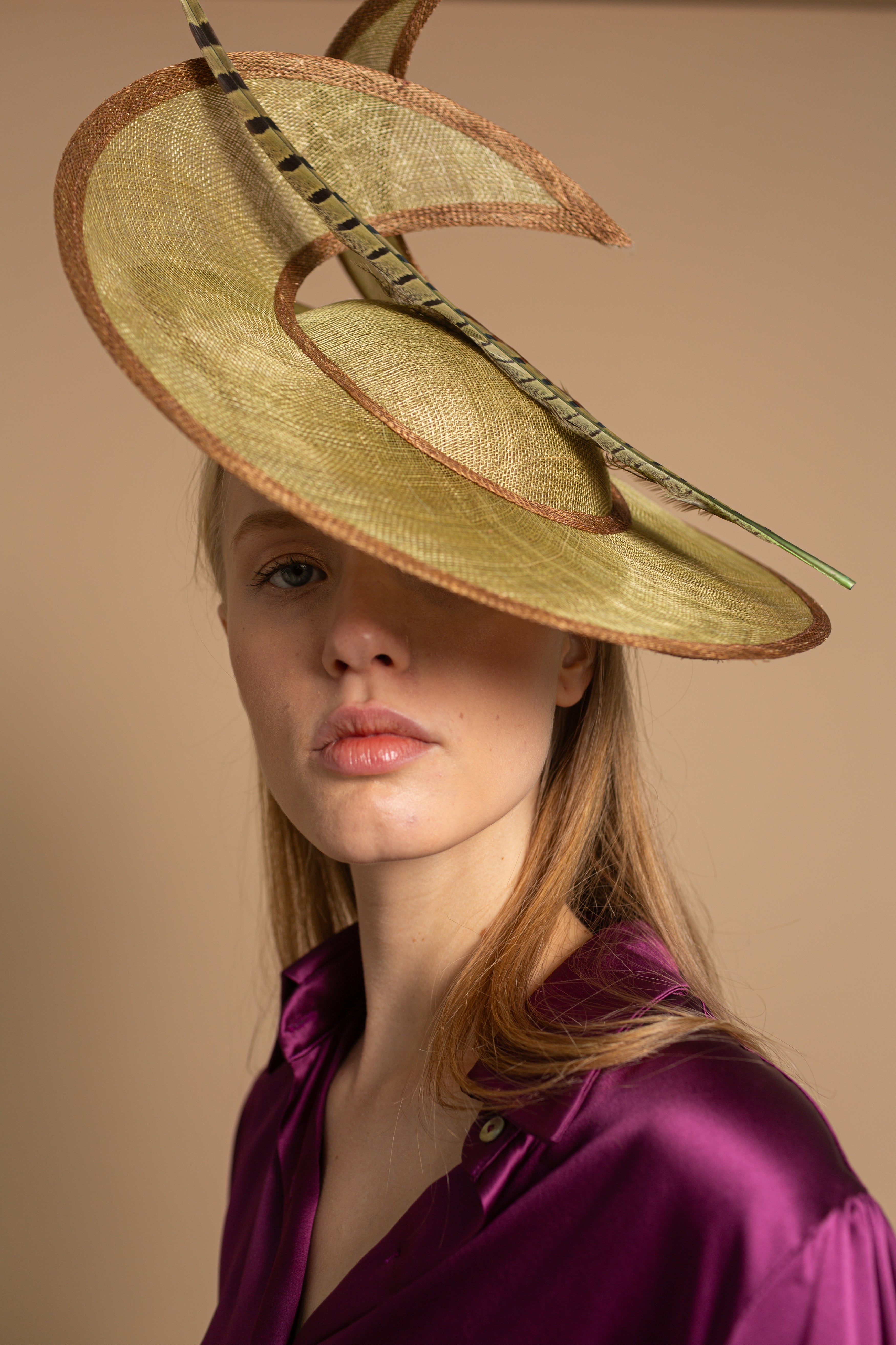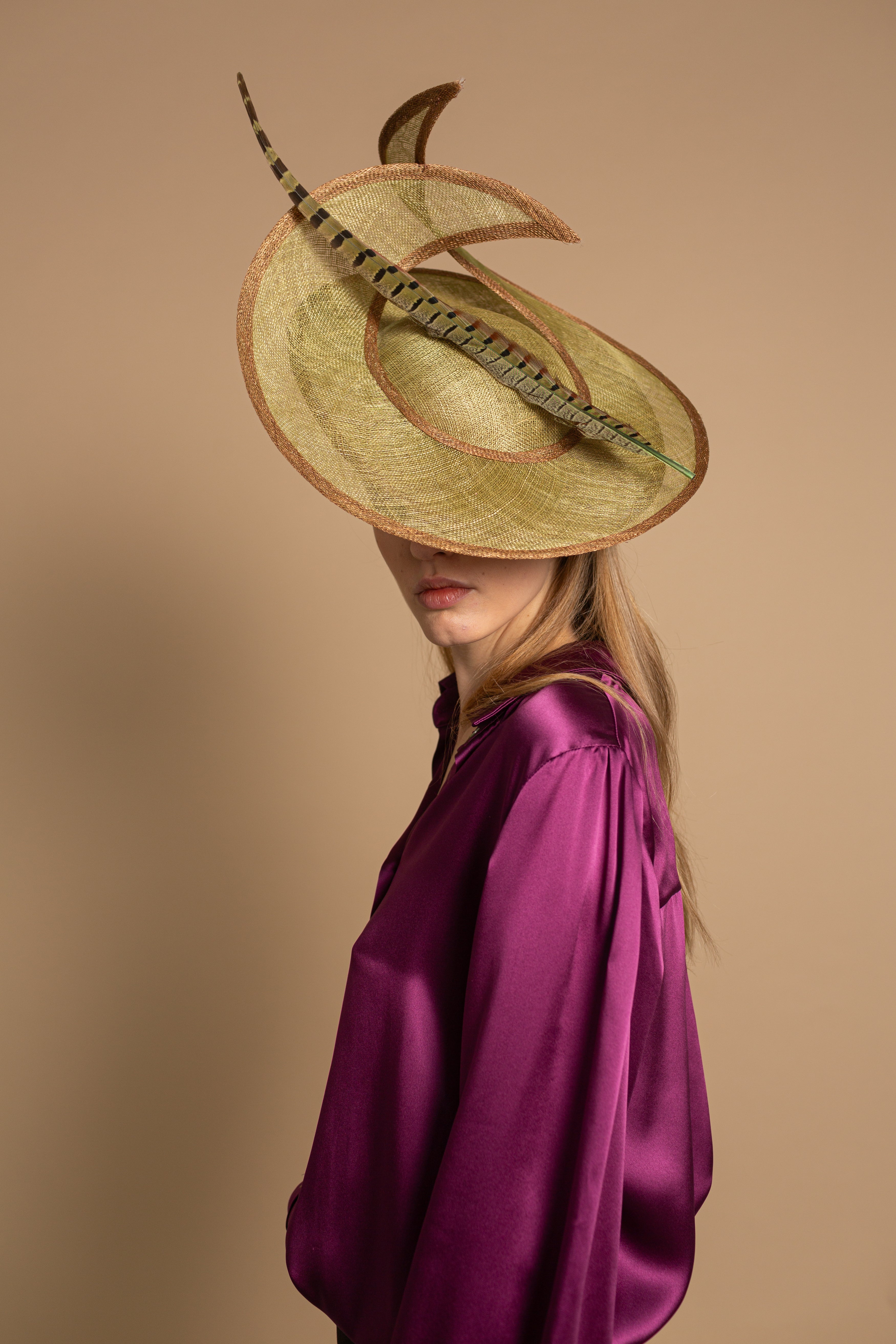 Olive green sinamay plate with raised brim and brown bias and matching pheasant feather.