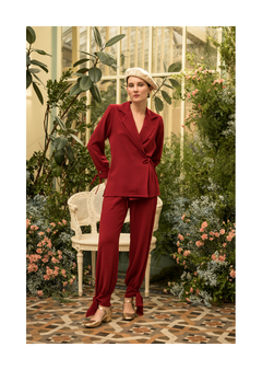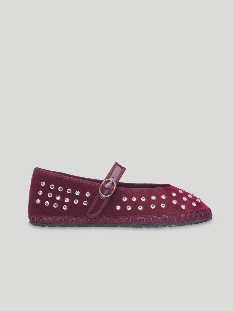 - Bailarina de terciopelo con escote en V en color burdeos con ribetes en color burdeos y tachuelas de cristal.