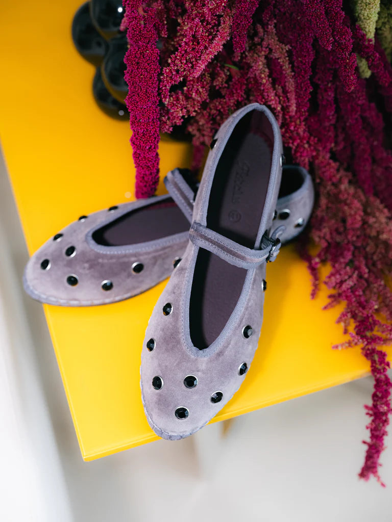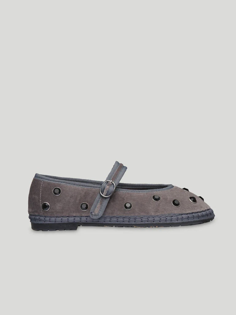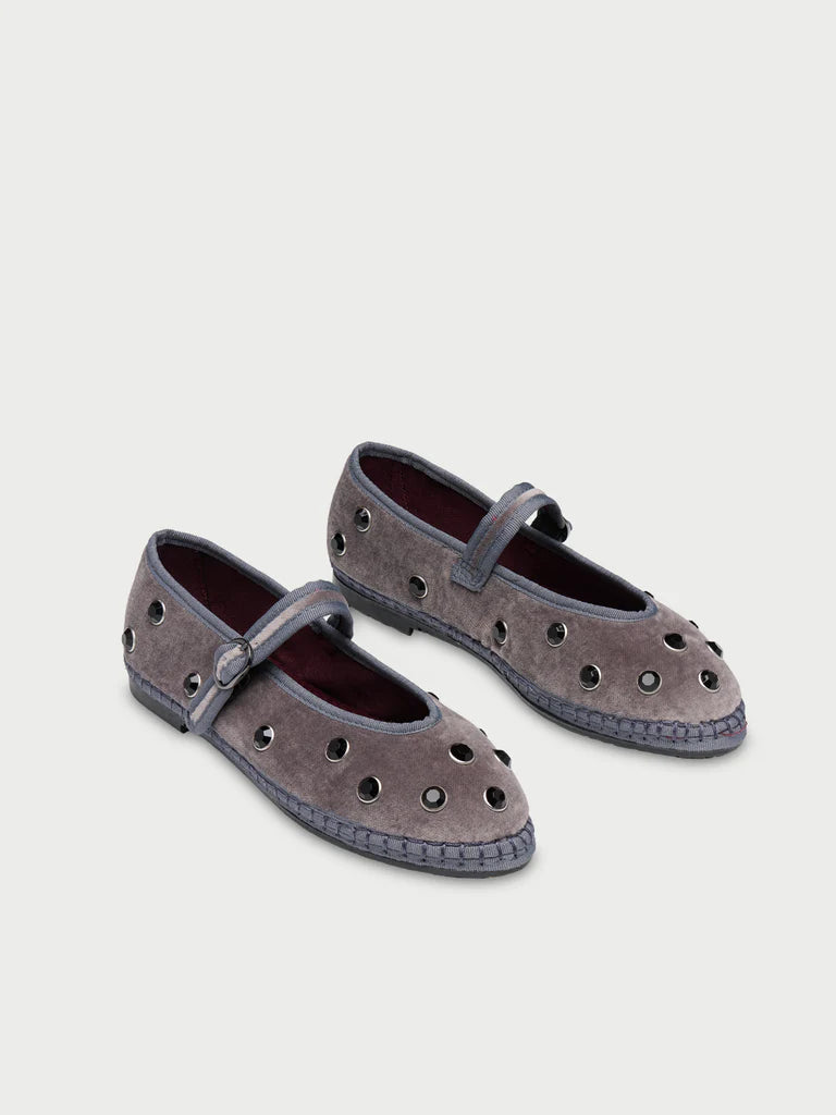 - Bailarina de terciopelo con abertura en “V” en gris con ribete gris y tachuelas de cristal gris.