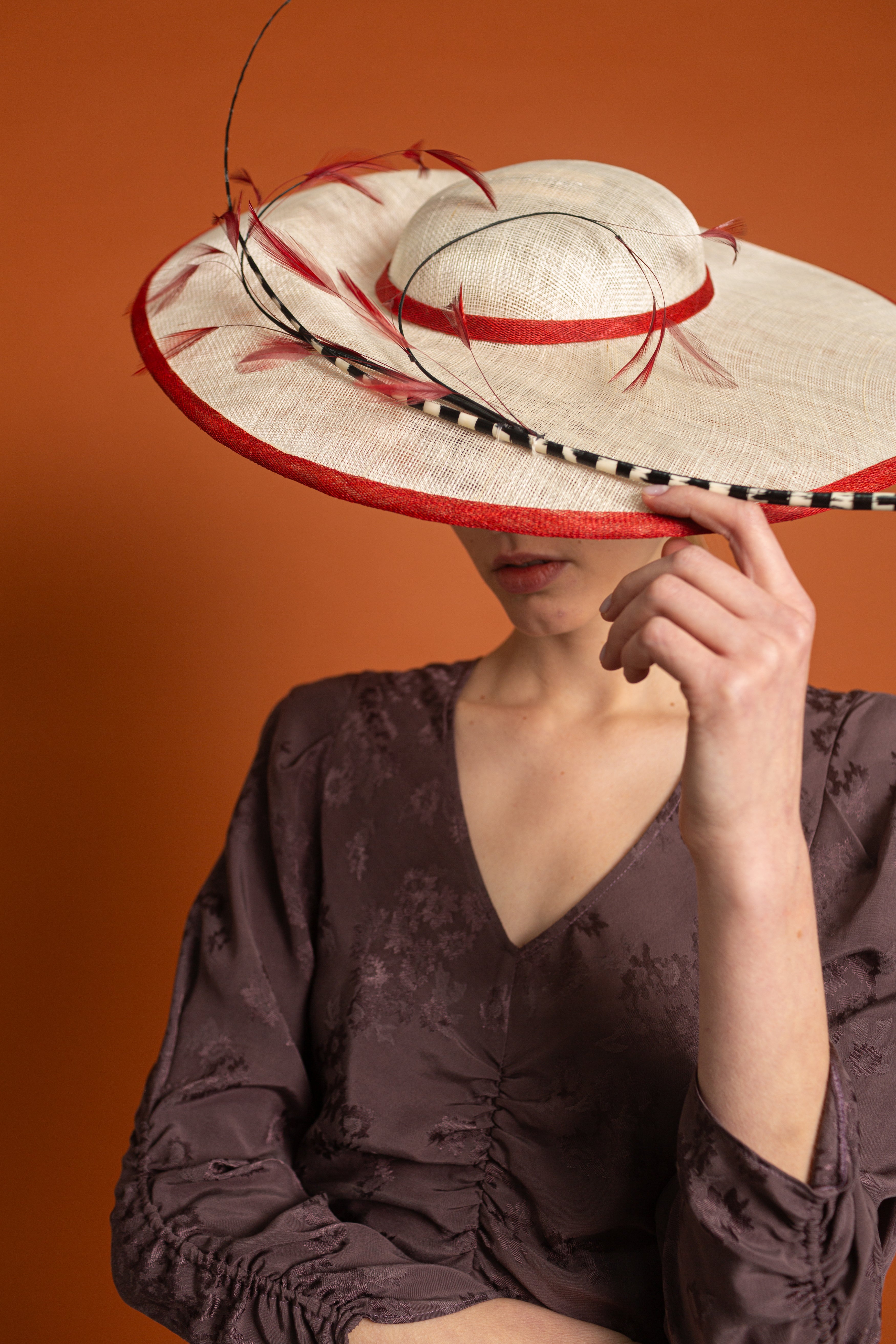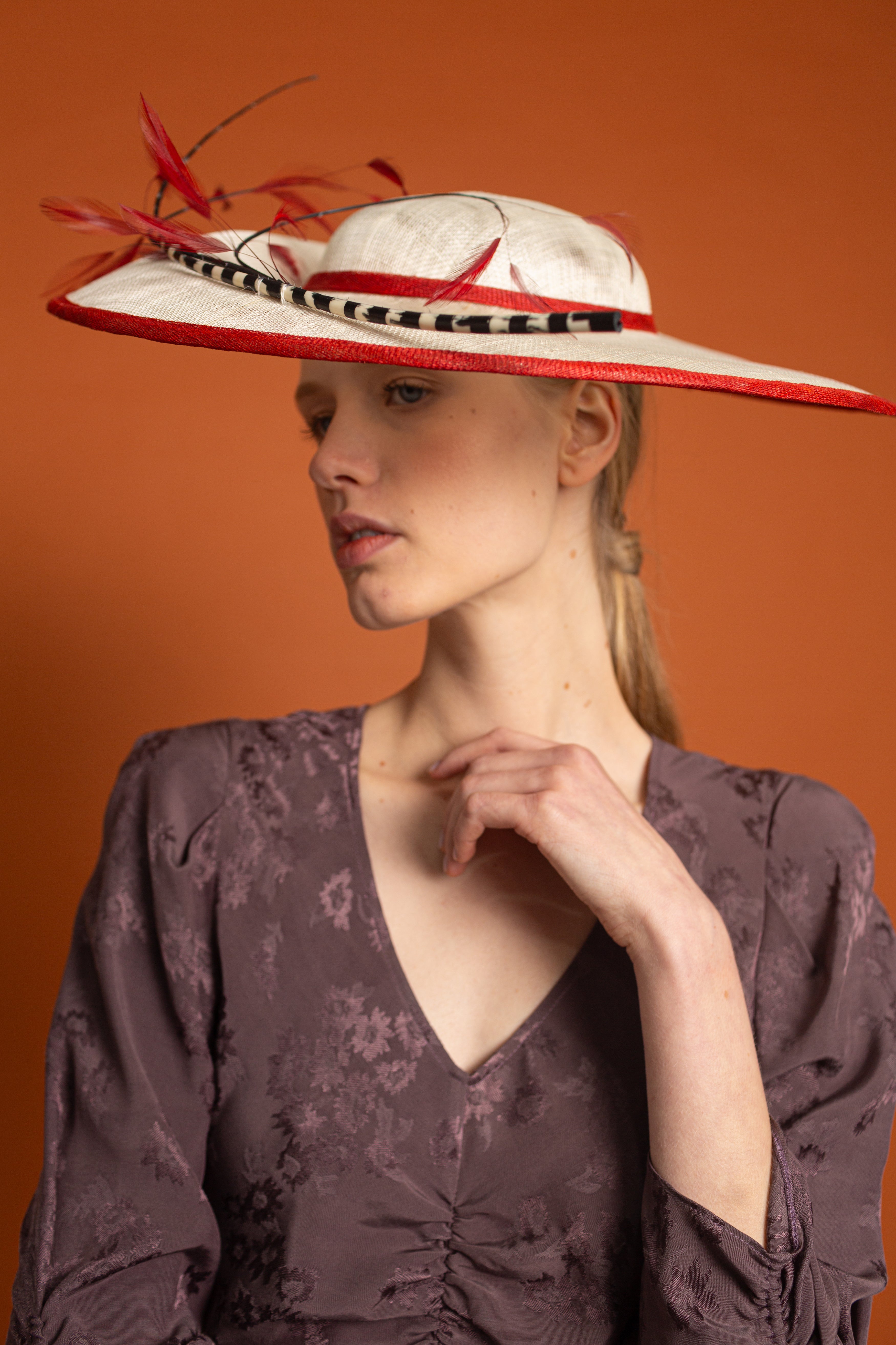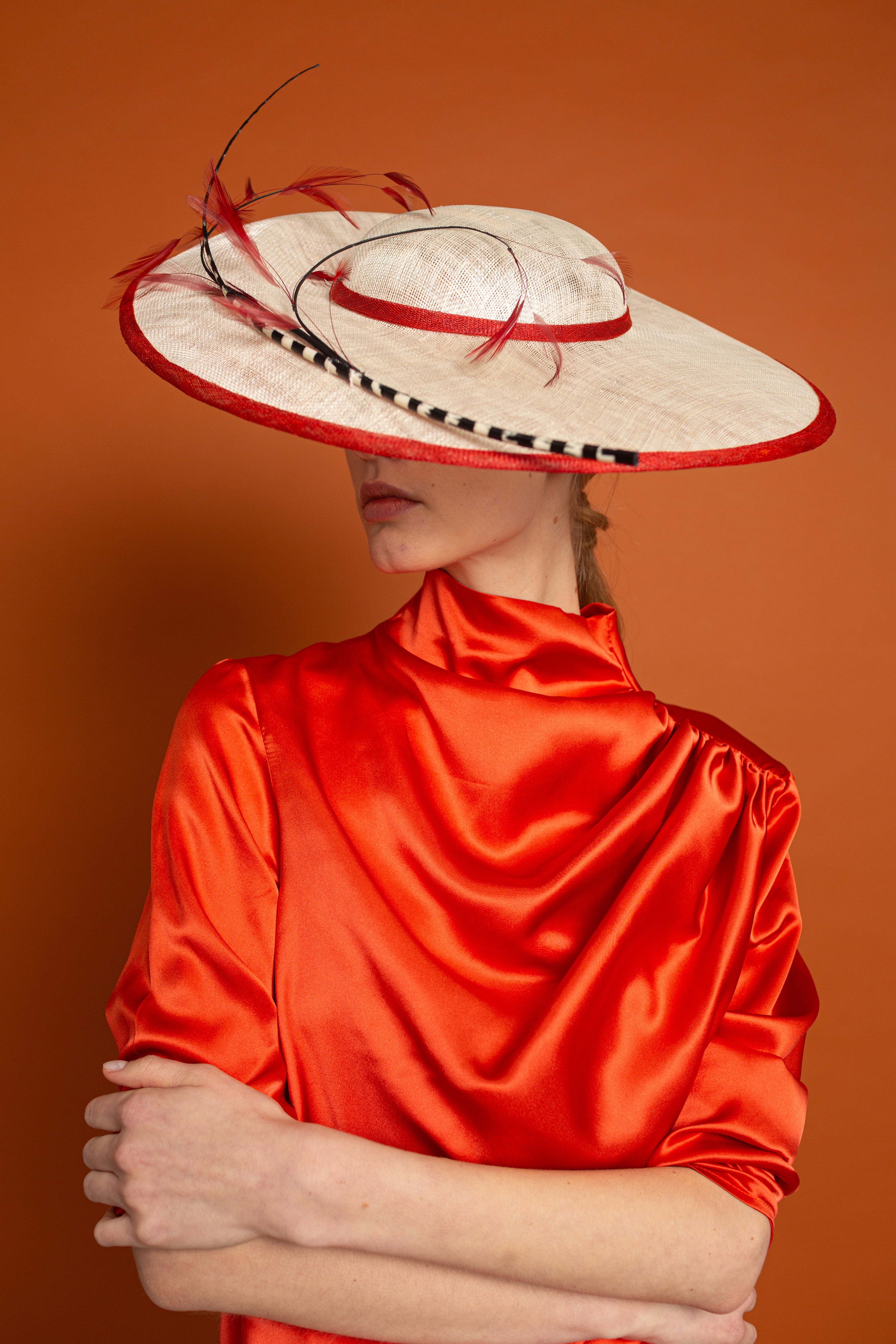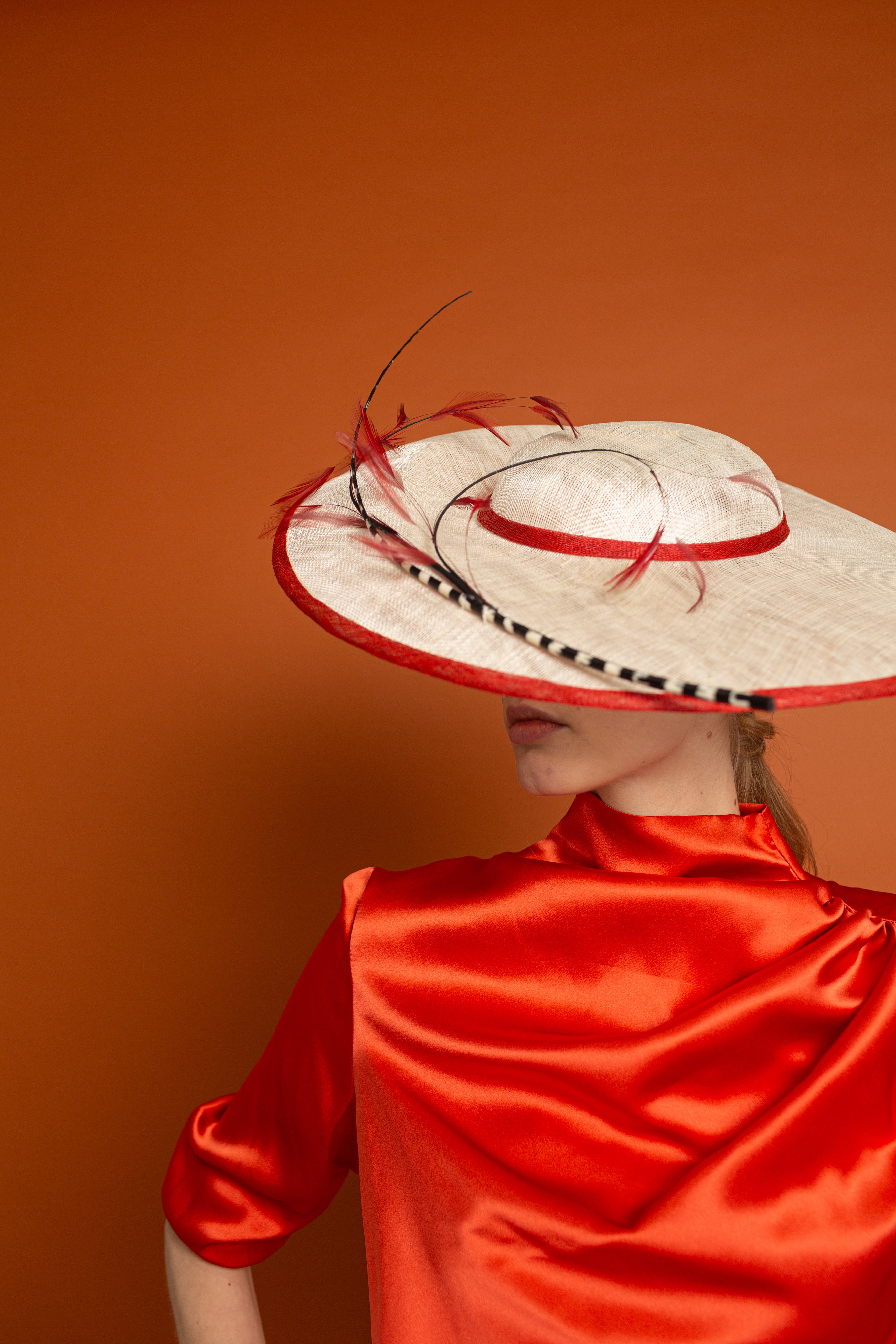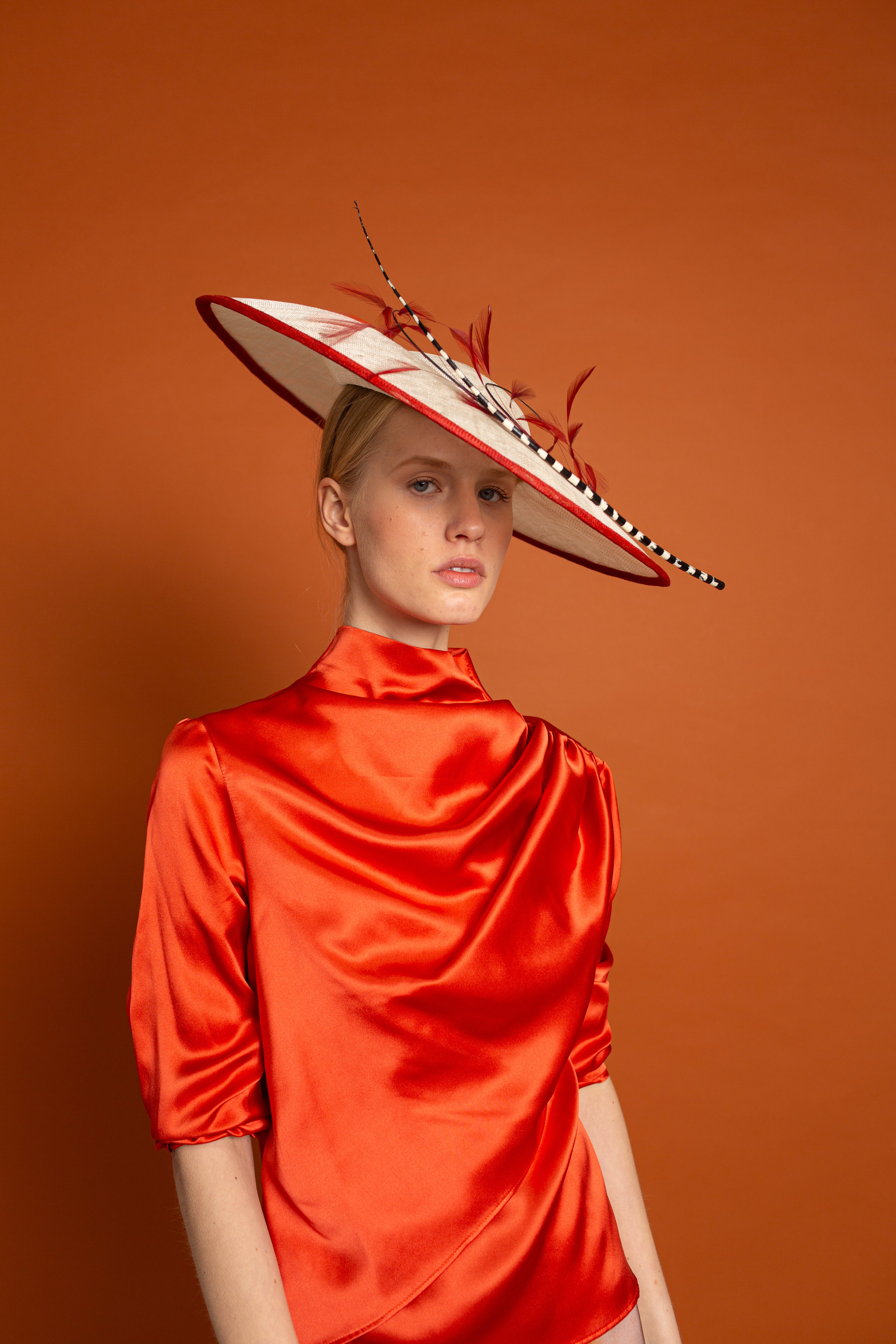 Dulcinea made of sinamay in natural colour with red bias, black and white spine and red antennae