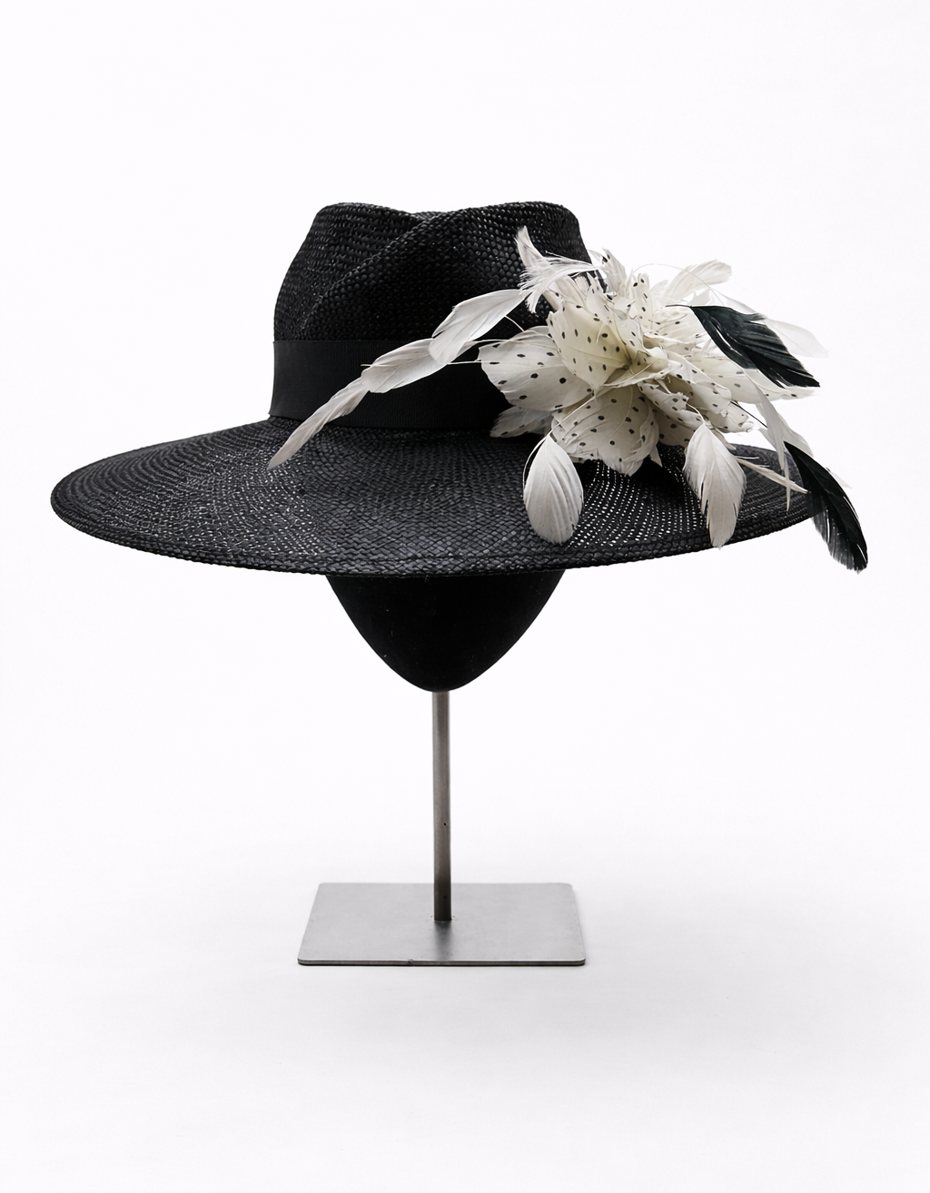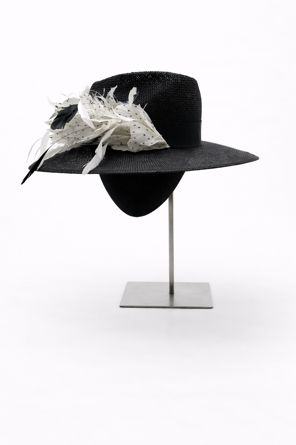 Sombrero de parasisal fino negro con cinta al tono plumas blancas con topitos negros