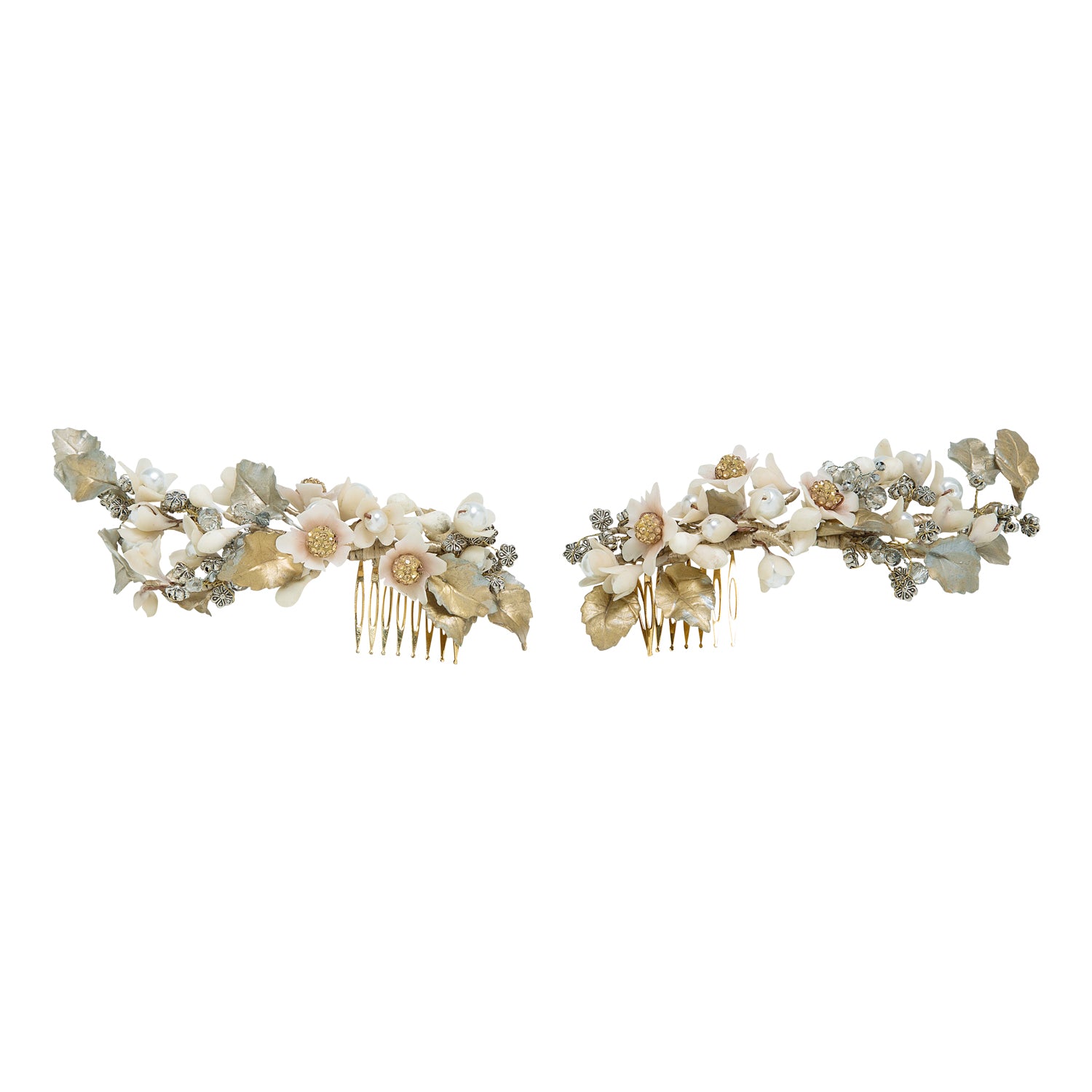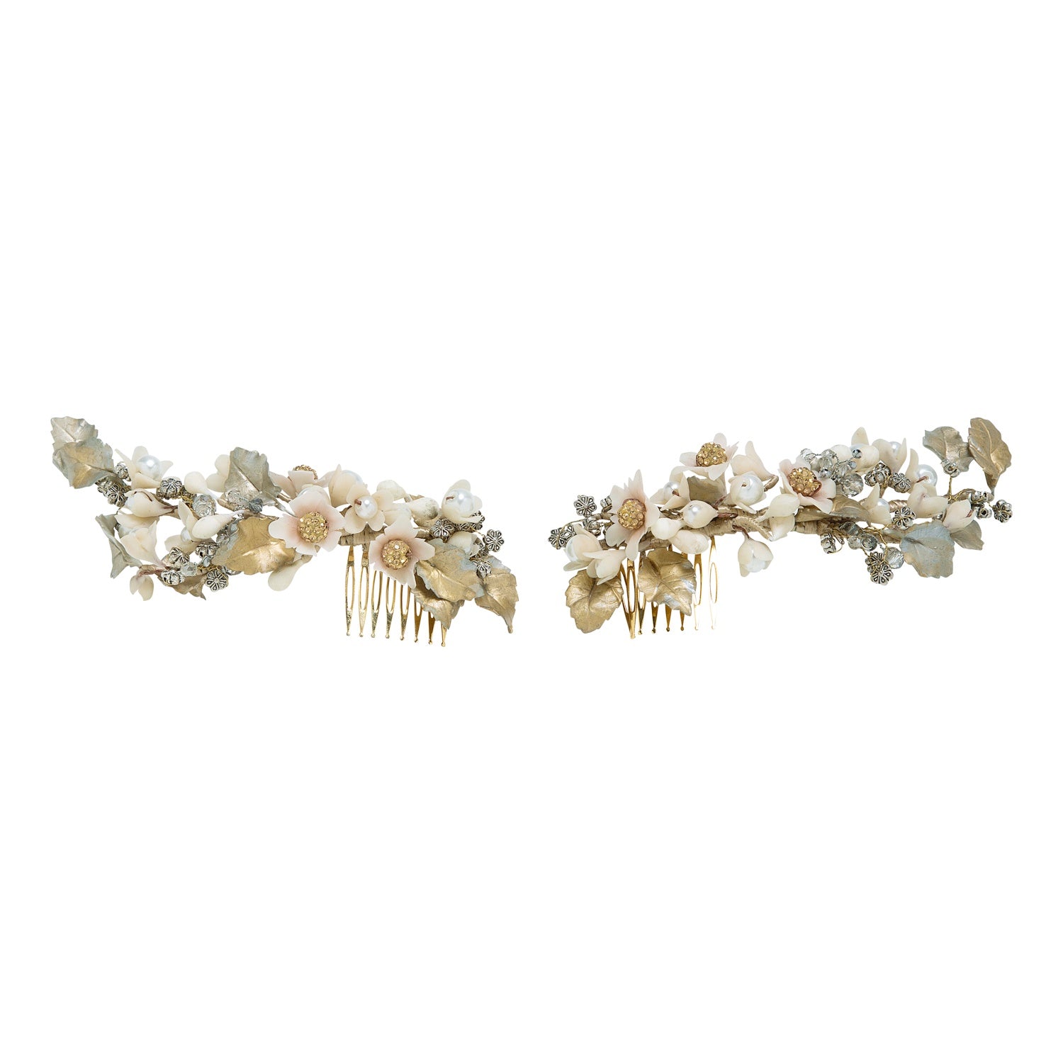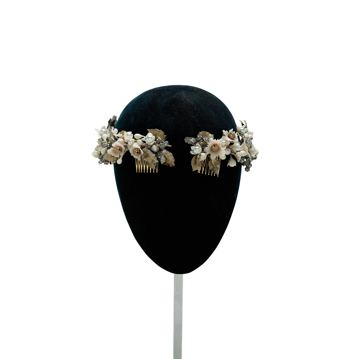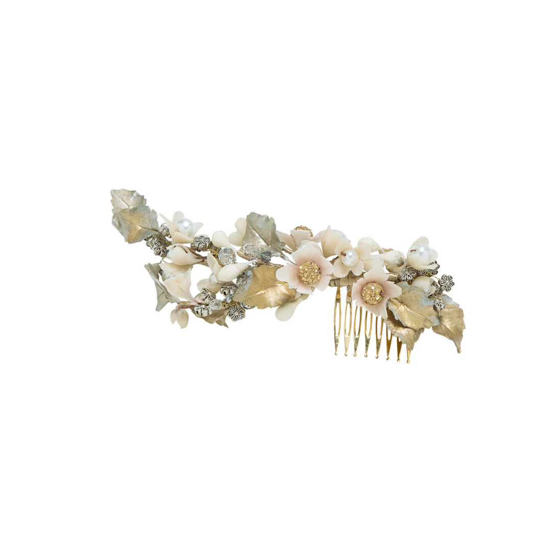 Double comb with cold champagne porcelain leaves with white and pink flowers and pistils with pearls and crystals